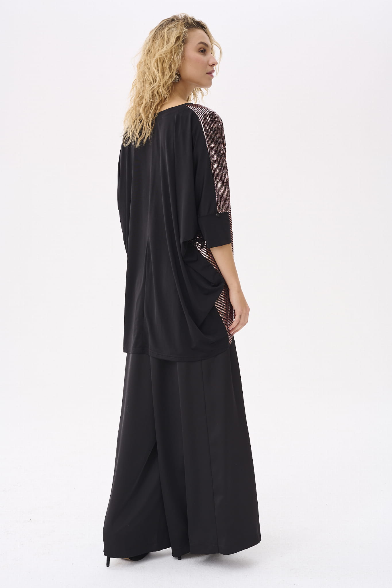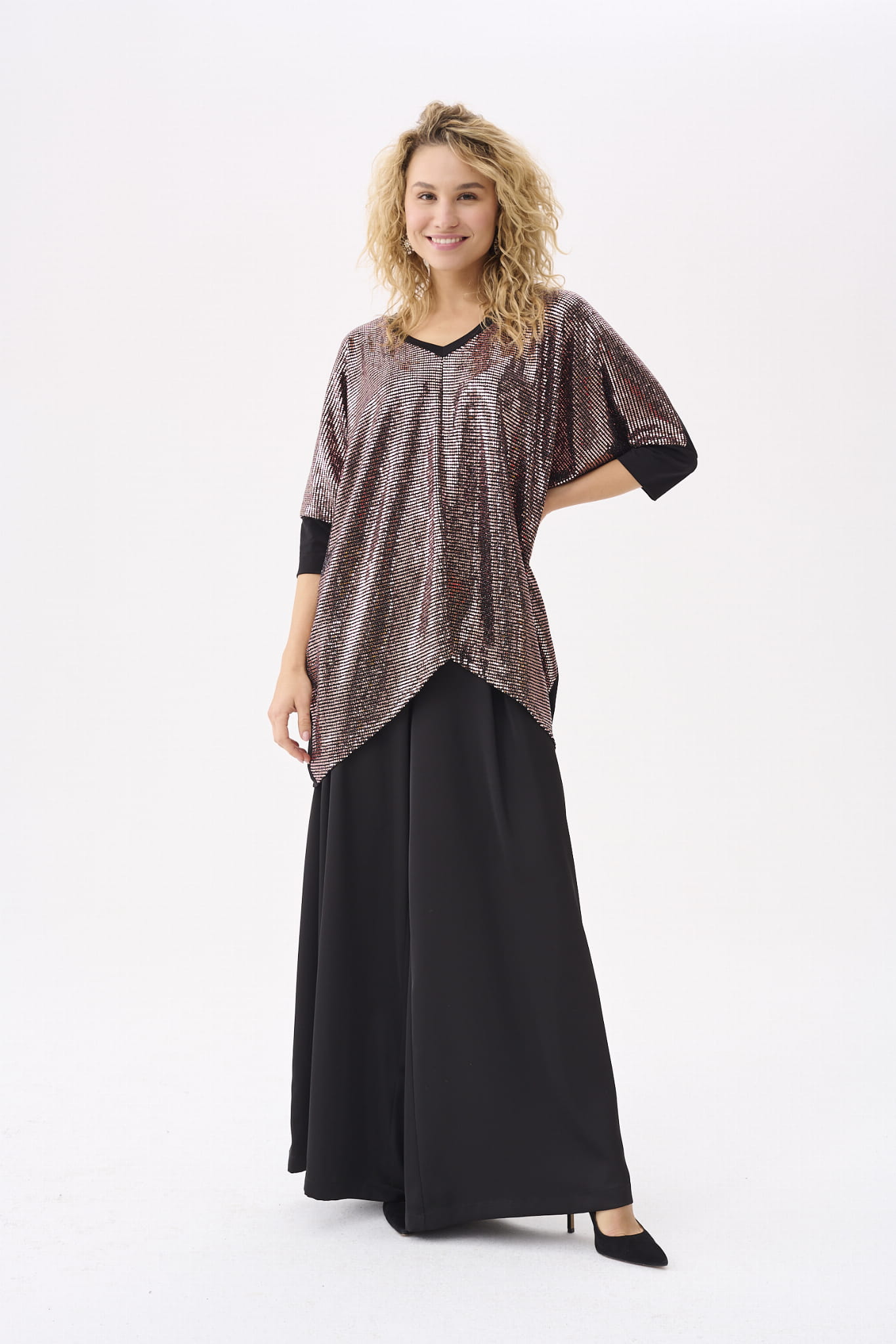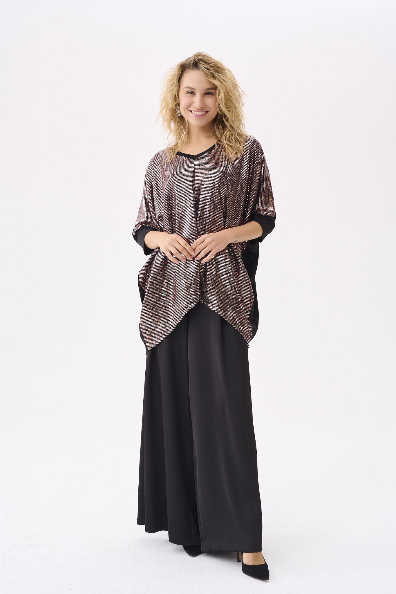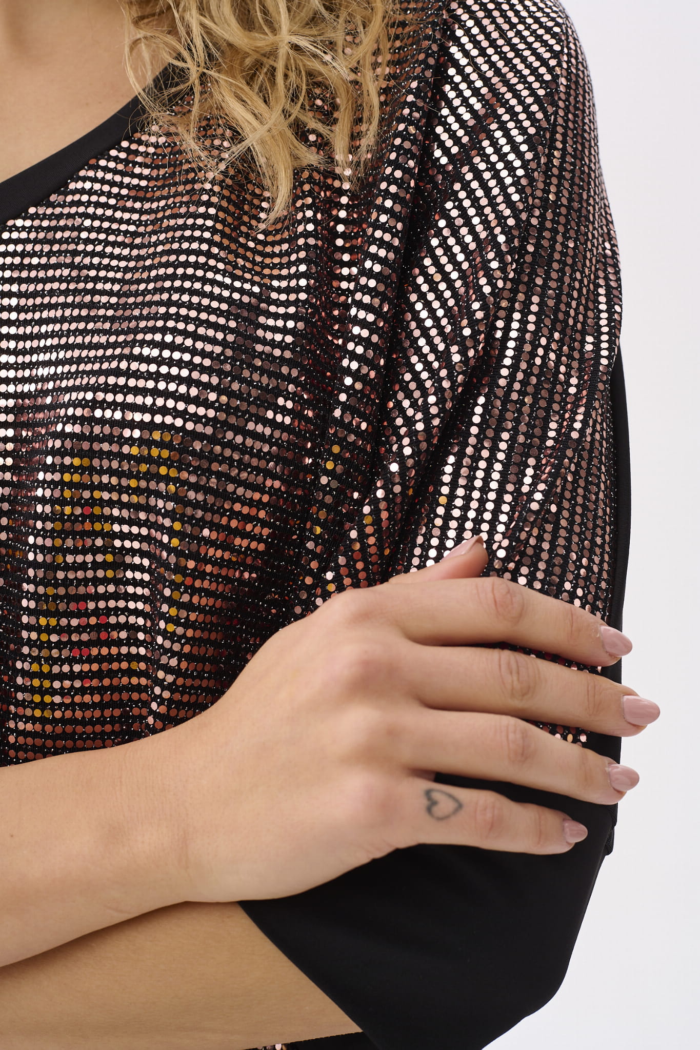 AKKRA to taki uniwersalny model, który błyszczy tylko z przodu. Z tyłu bluzka jest gładka. Do tego zaprojektowałyśmy jej opadające ramię, a w rękawach mankiety, sięgające łokcia. Masz tu kilka kolorów do wyboru: czarny, srebrny z écru, butelkową zieleń, srebrny z czarnym, różowe złoto oraz granatowy. Fajnie, prawda?