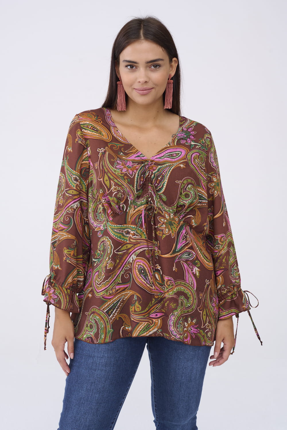 KYLIE wybrała dekolt w serek. Można też w niej regulować troczkiem marszczenie na środku dekoltu. A wersje kolorystyczne są takie: écru, czarna oraz czekoladowa w orientalne wzory.