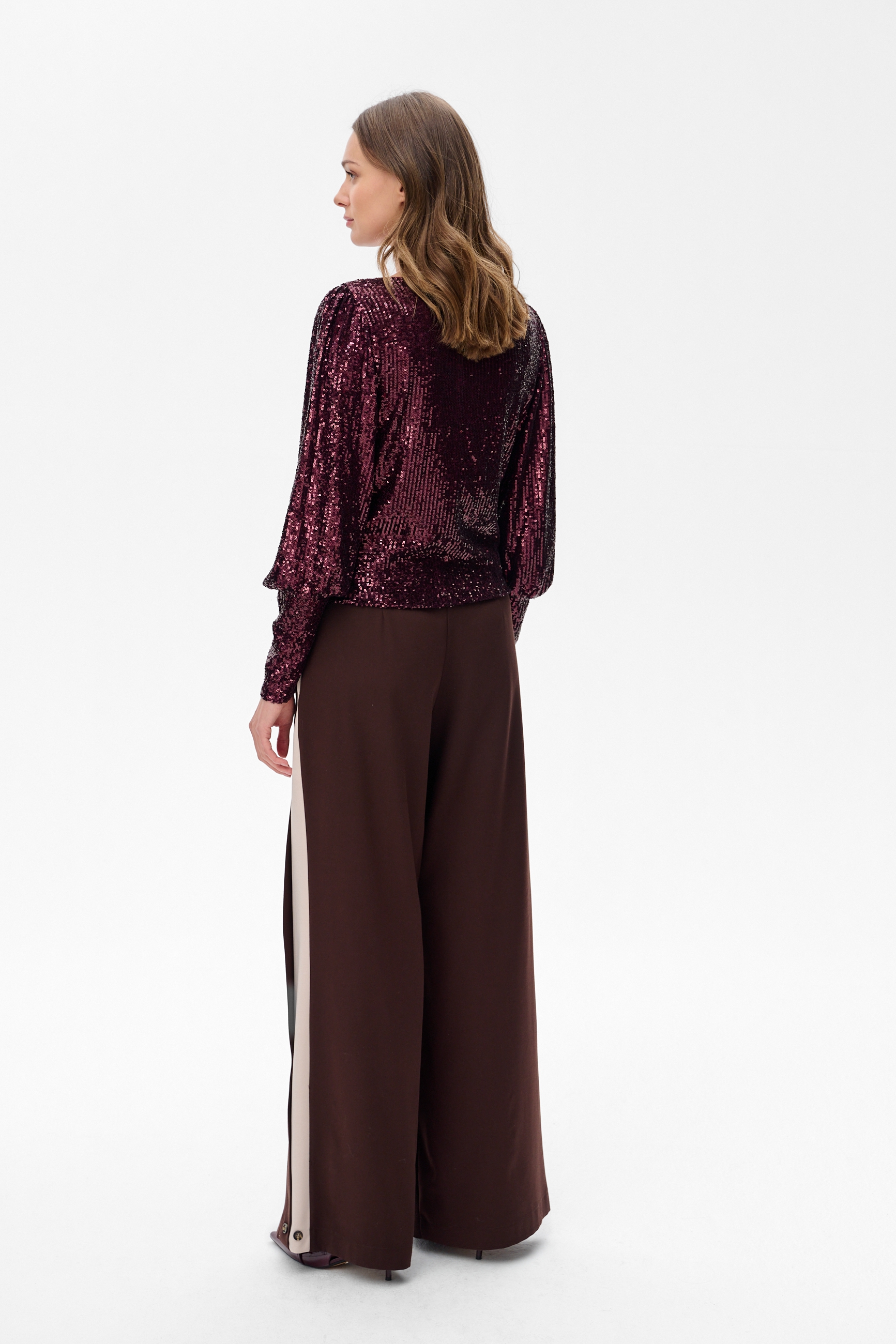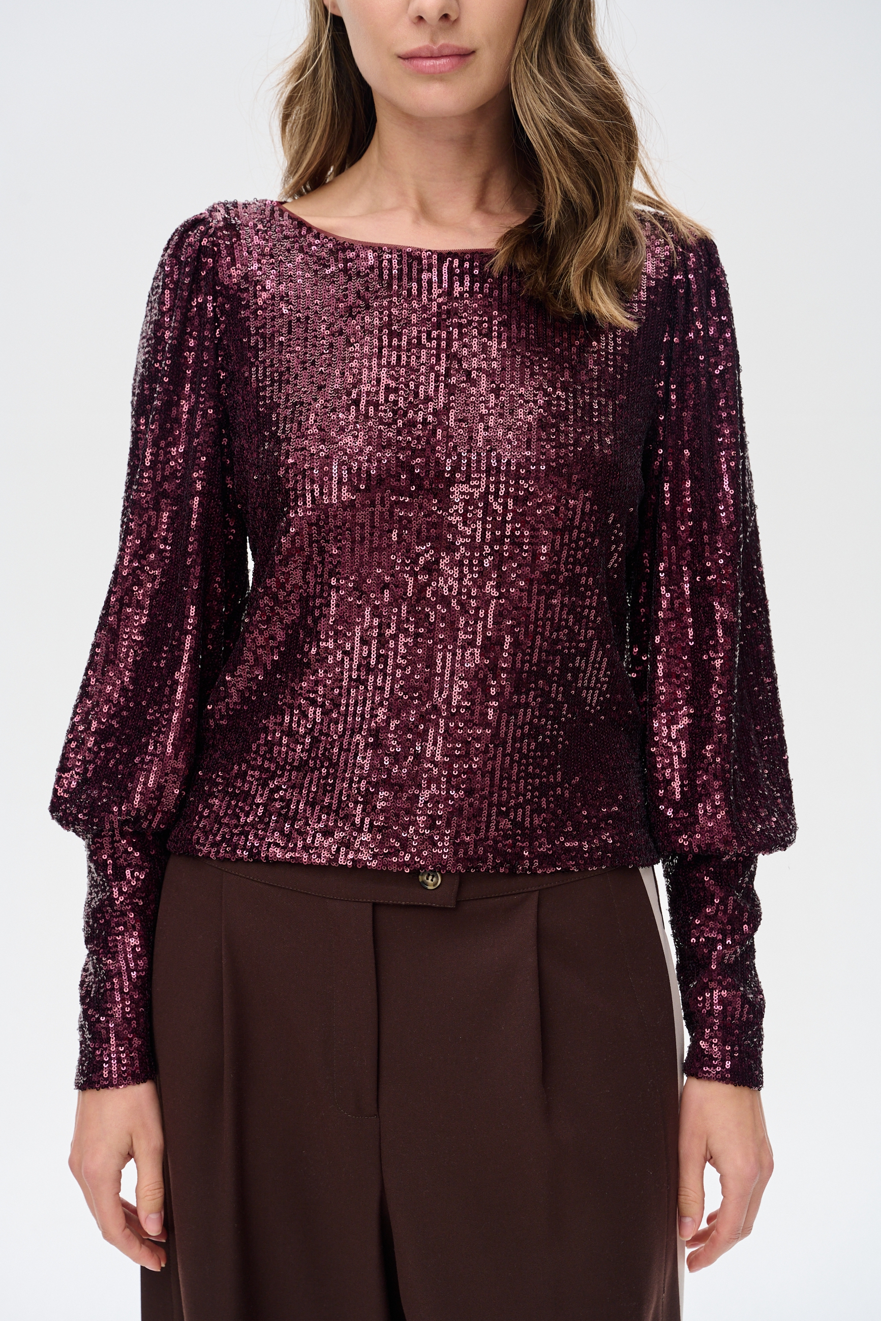 Cekiny pięknie odbijają w niej światło, mieniąc się różnymi odcieniami czerni. Mankiety w dole rękawów podkreślają bufkę w rękawie, wysmuklając jednocześnie sylwetkę.