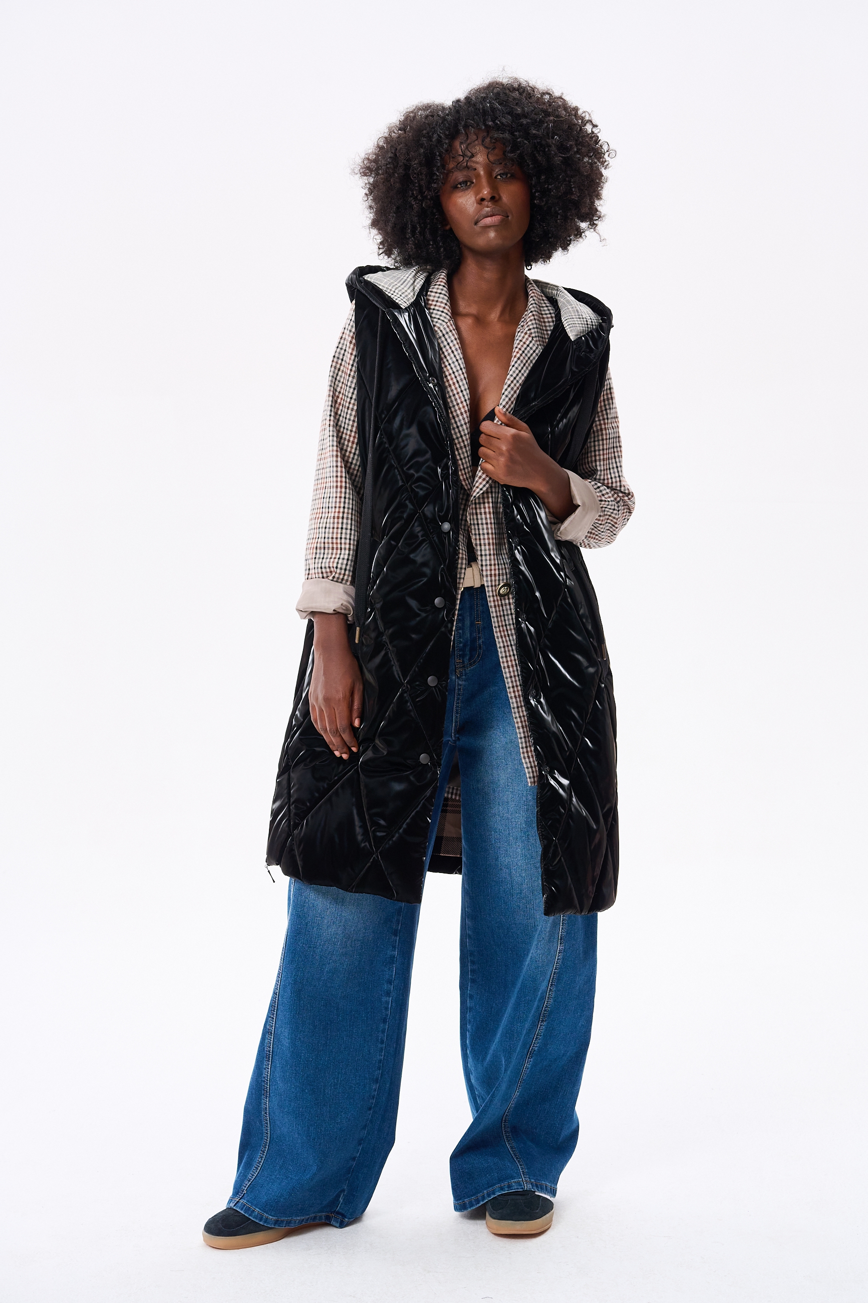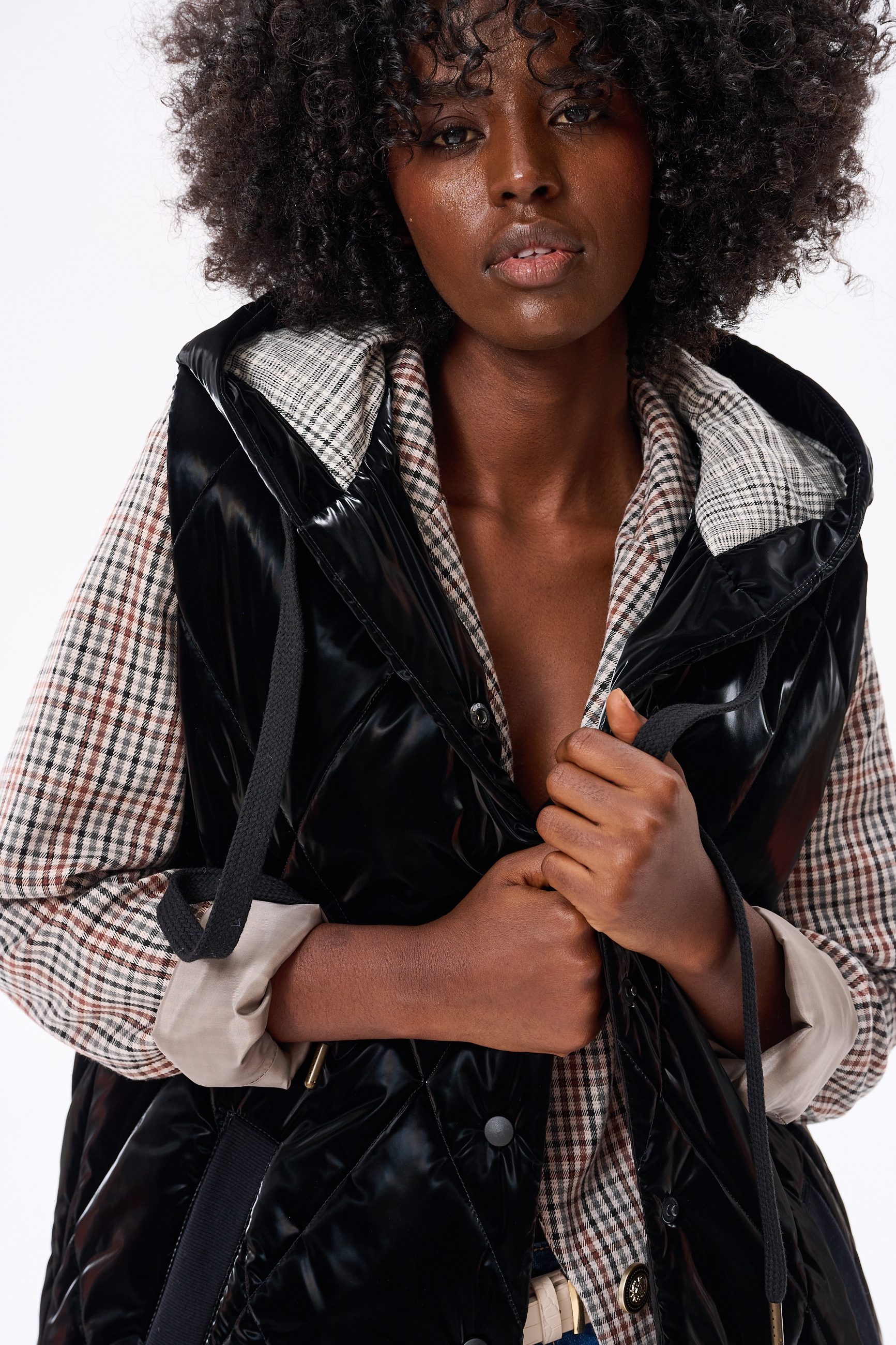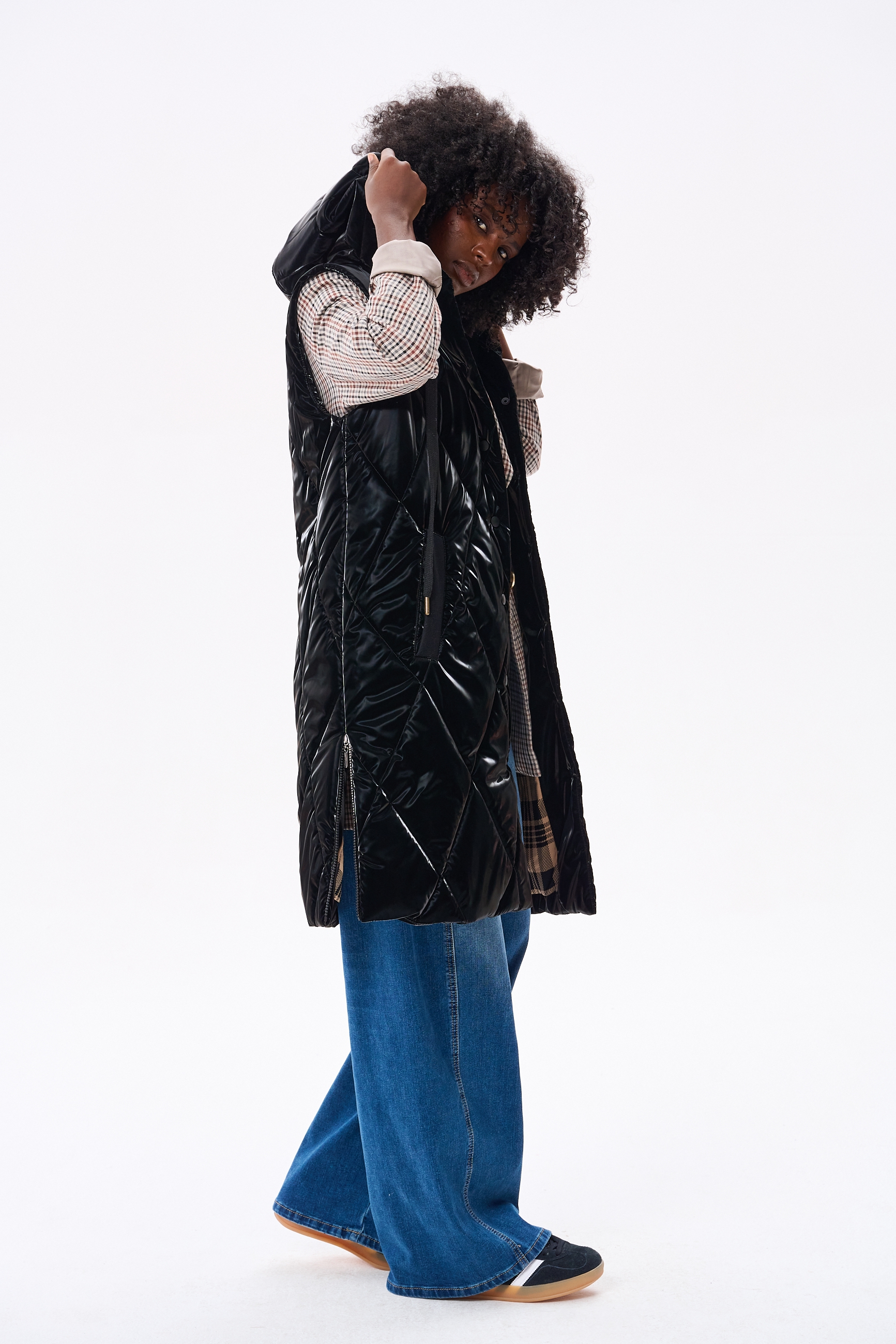 Zacznijmy od rzeczy praktycznych. Kamizelka zapina się na napy w casualowym stylu. Po bokach ma zamki, które mogą ułatwić Ci stawianie kroków, kiedy je rozepniesz. Natomiast sprawy estetyczne reprezentują w MELOVE trzy kolory do wyboru: czarny, szałwiowy lub świetlisty beż. W każdej z tych wersji środek kamizelki i kaptur mają kontrastowe wyłożenia. I to do do nich właśnie fajnie dobrać sobie stylizację.