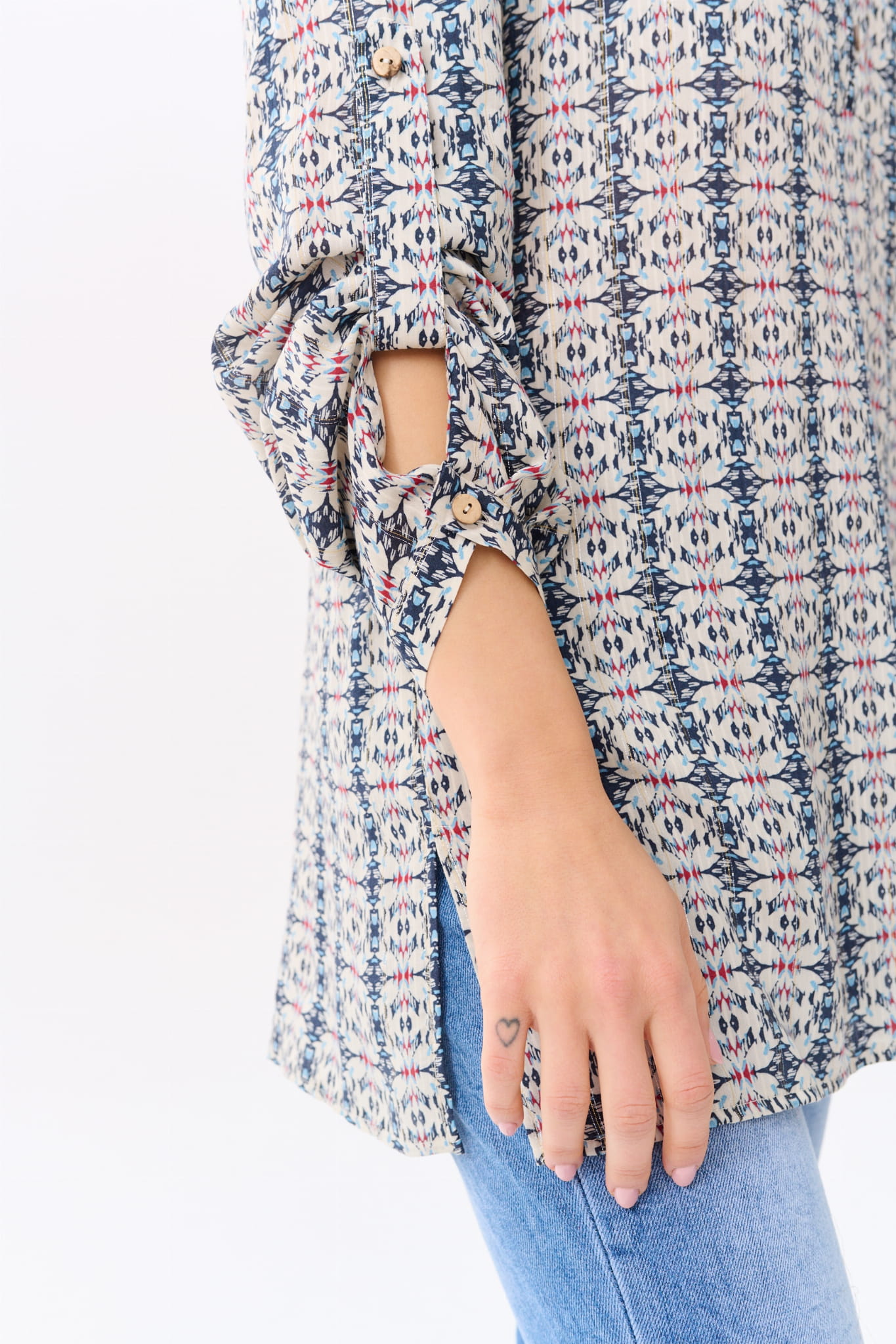 lubisz, jak coś się lekko błyszczy. Bo ta geometryczna wersja zawiera w sobie lureksową nitkę (która jest tym wyjątkiem, zmieszanym z wiskozą w składzie). Jest jeszcze długi rękaw, ale na podtrzymywaczach. Co oznacza, że możesz je sobie skrócić w miarę potrzeb.