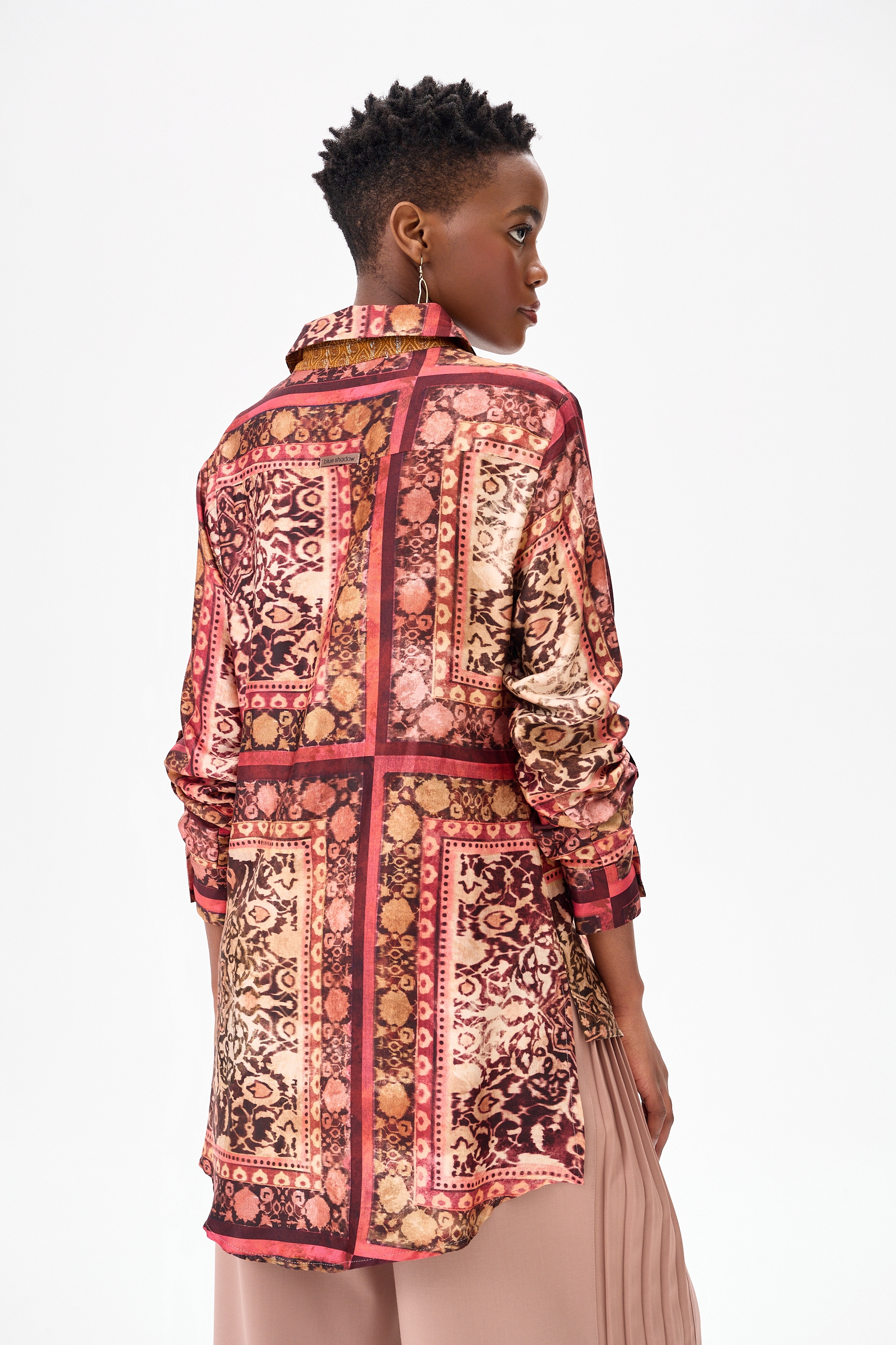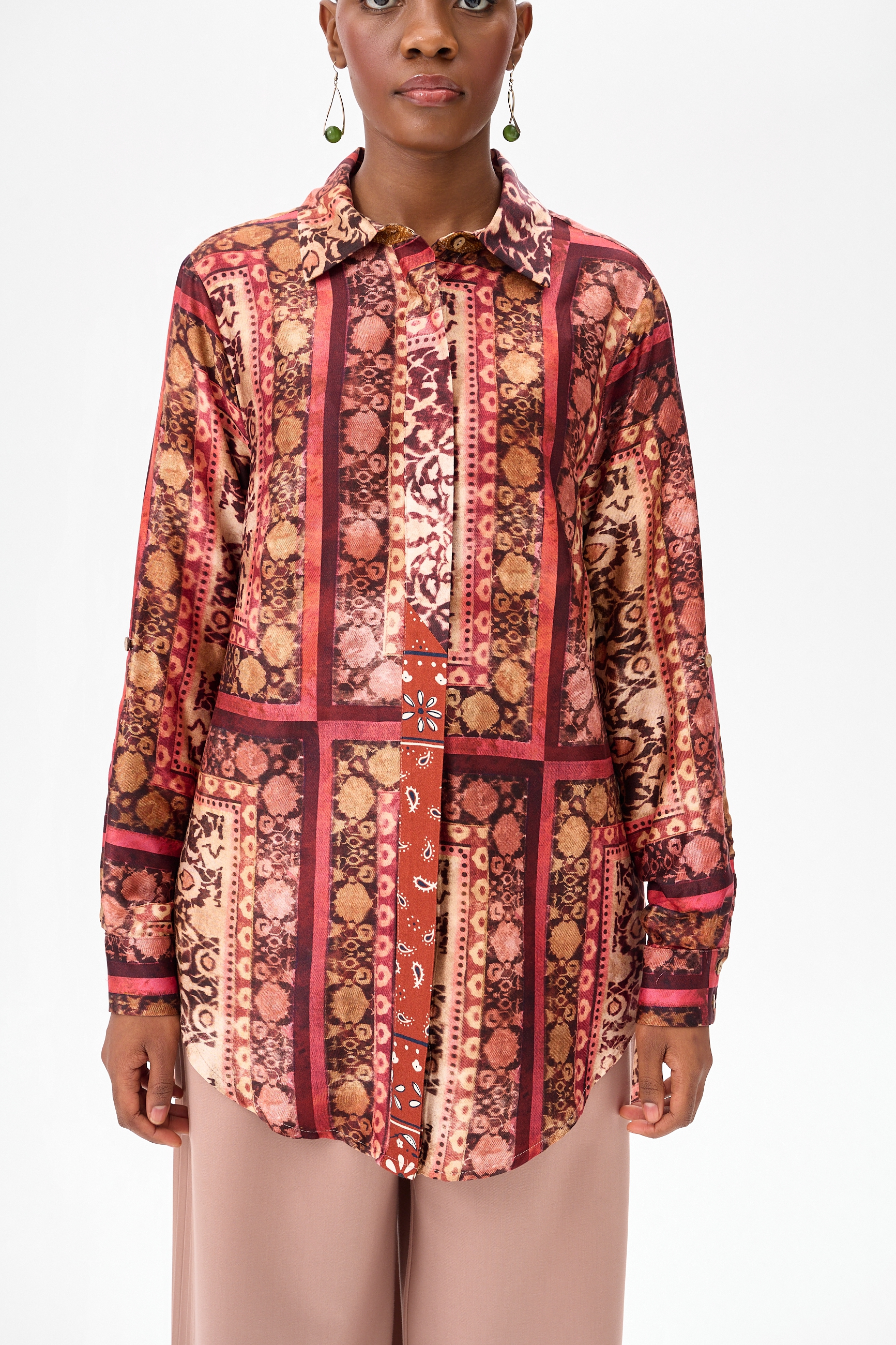 Kobieta również. W związku z czym tę piękną koszulę możesz nosić na kilka sposobów, w zależności od okazji, pory roku lub nastroju. Rękawy dają się wywinąć do góry dzięki podtrzymywaczom. Wiązanie z przodu ułatwia skrócenie koszuli i łatwiejsze jej stylizowanie ze spodniami z wysokim stanem. Albo potraktuj ją w ogóle jako tunikę, bo i na to pozwala jej długość. To patchworkowe dzieło sztuki dodatkowo może pochwalić się kunsztownym rzemiosłem i dbałością o zrównoważony rozwój. Wykonane jest bowiem z czterech różnych tkanin, z których każda jest satynową wiskozą z delikatnym połyskiem. Oprócz efektów estetycznych, użycie tej materiałowej mieszanki jest przykładem praktycznego wykorzystania filozofii ZERO WASTE, która jest coraz ważniejsza w naszym przemyśle. W ten sposób używamy resztek magazynowych materiałów do kreowania niepowtarzalnych, nowych projektów. Takich jak ten kameleon właśnie.