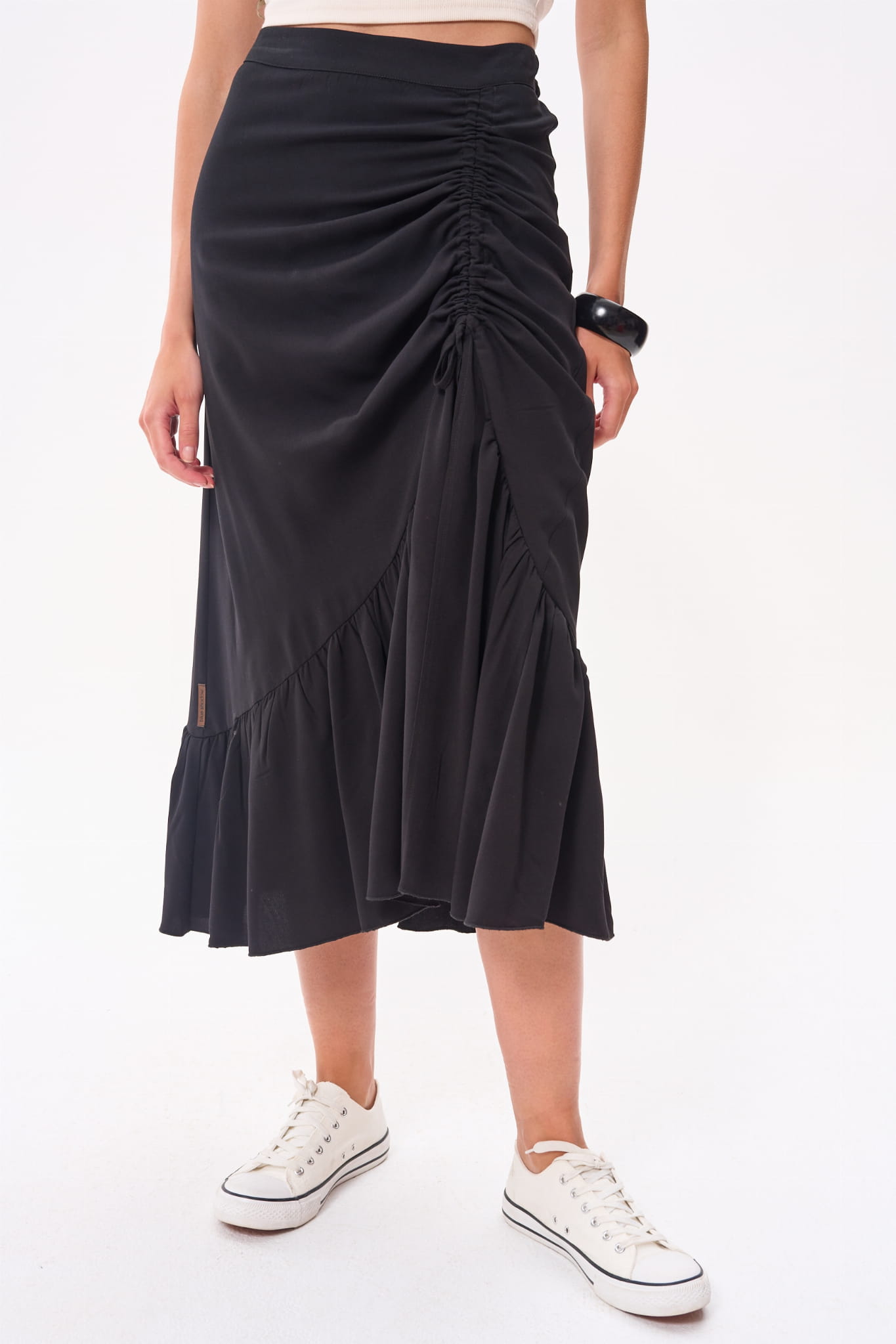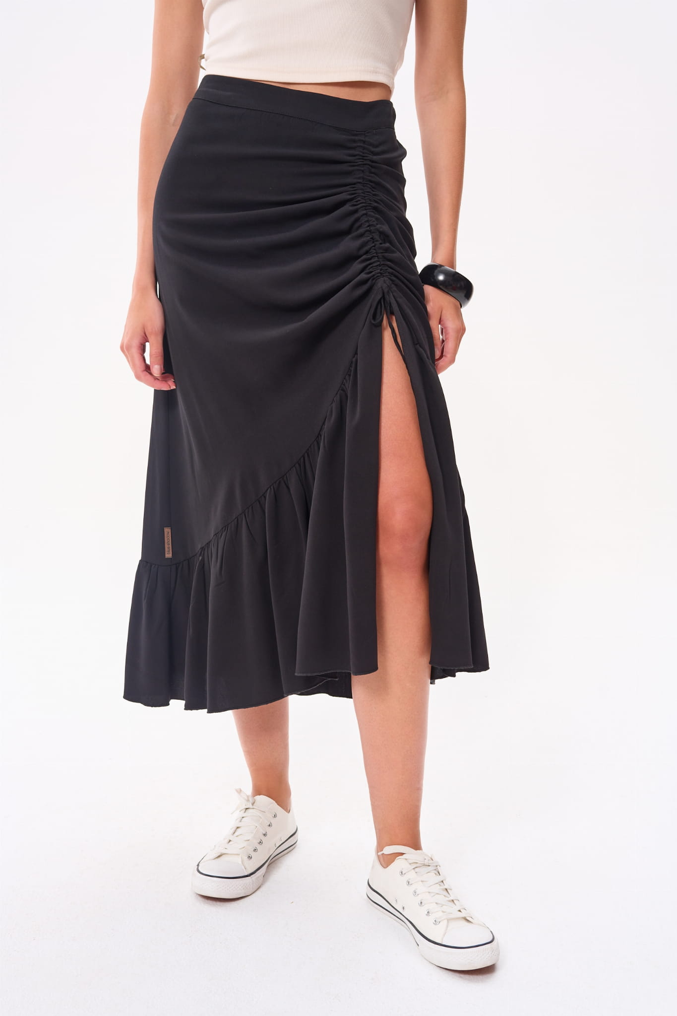 Postanowiłyśmy na wiskozę. I ta inwestycja zwróciła się w 100%. Wykonanie A więc tak - na dole jest falbana. Natomiast wzdłuż lewej nogi biegnie tunel, w który wciągnięty jest trok. I to właśnie dzięki niemu możesz pokazać mniej lub więcej nogi, drapując tę część SUSAN wyżej lub niżej jako ozdobę. Do tego masz wybór pomiędzy tymi kolorami: dżinsowym, grass, amarantowym, czarnym i takimi niebiesko-zielonymi kleksami na jasnym tle. Sprytnie i ciekawie wymyśliłyśmy ten model, prawda?