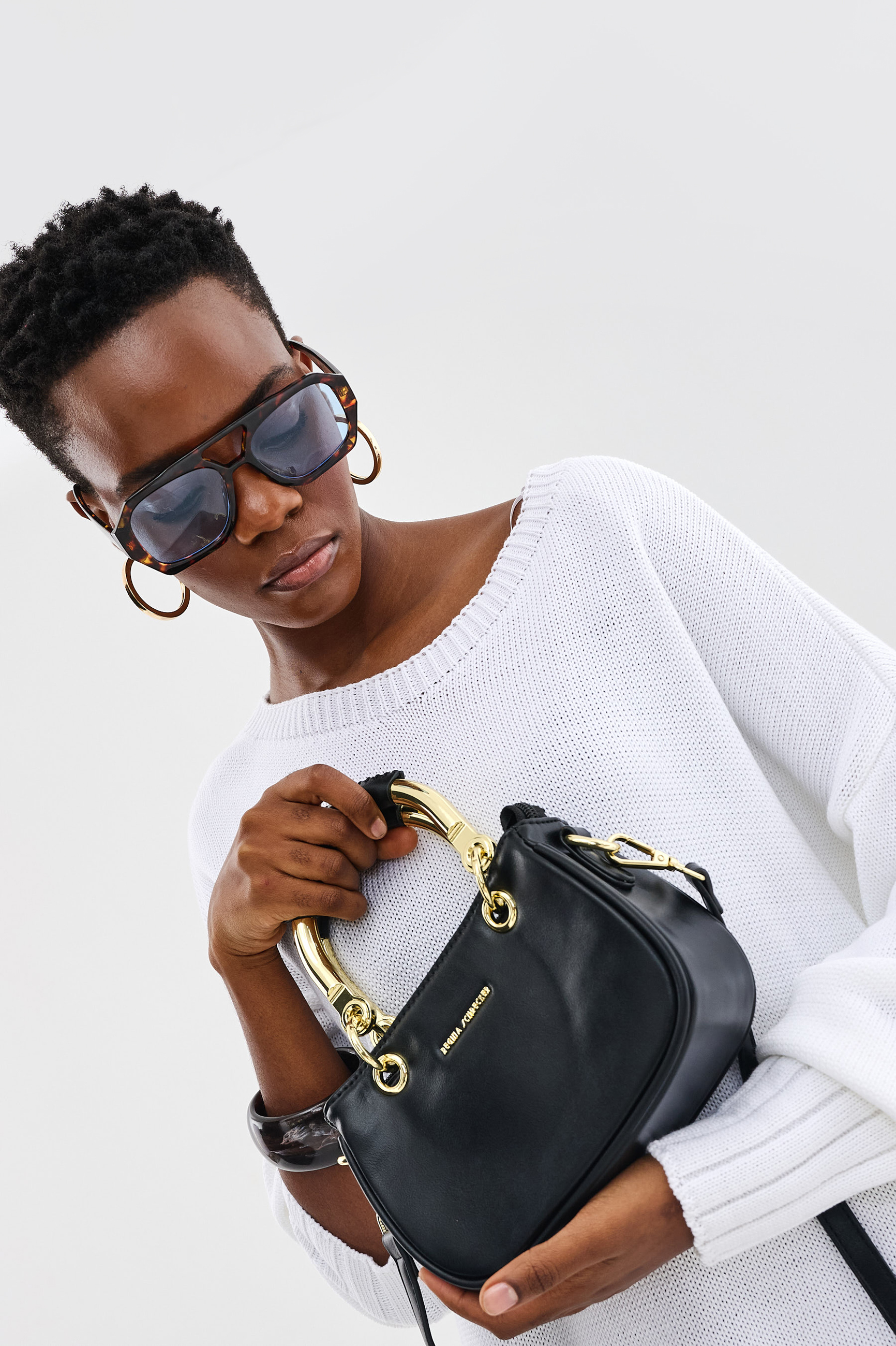 Mała torebka damska na dwóch metalowych rączkach. Torebka posiada dodatkowy pasek i wewnętrzne kieszonki zapinane na suwak. Dostępna w kilku wariantach kolorystycznych.