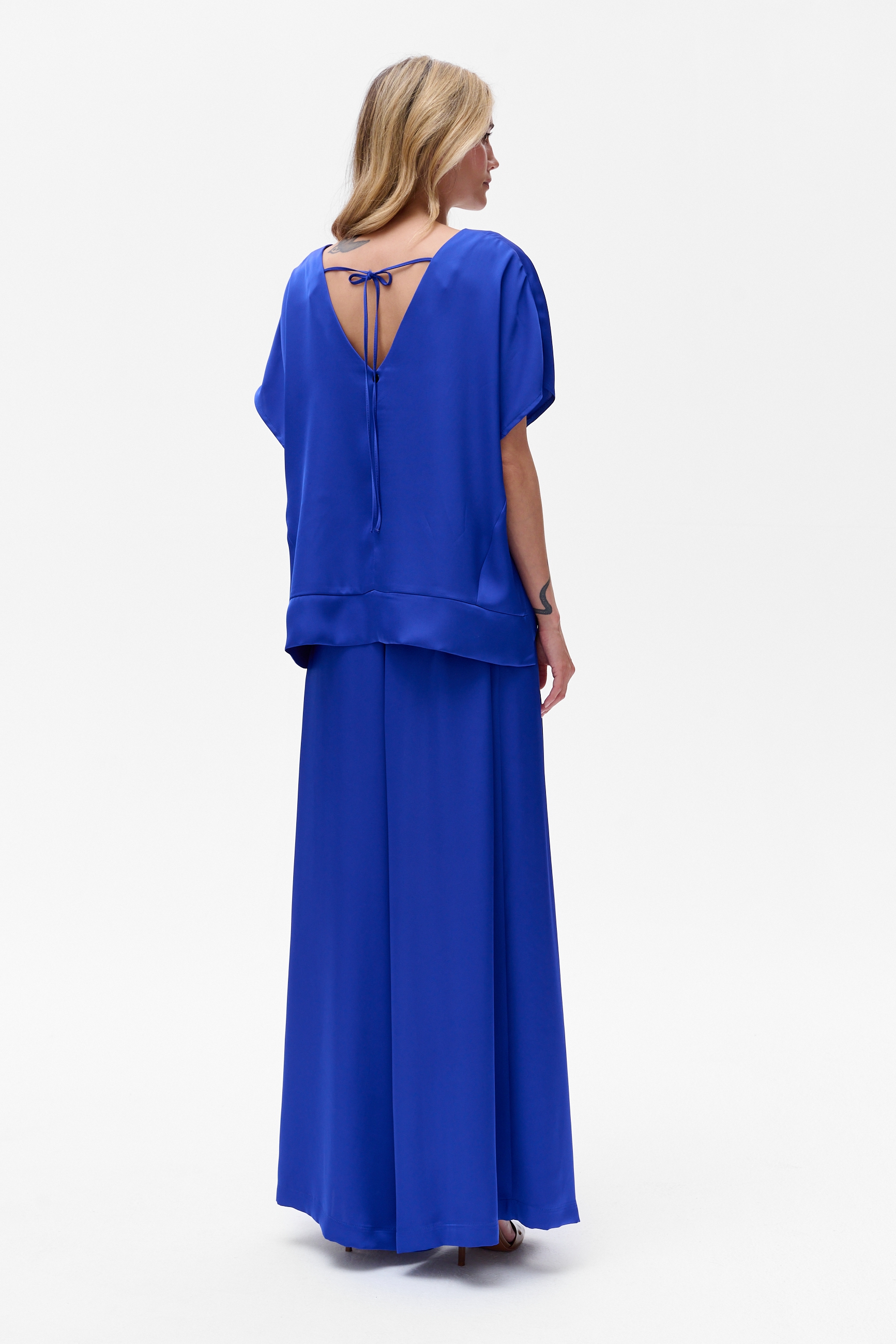 Ta piękność może się pochwalić wykończonym na gładziutko dekoltem w serek i kimonowymi rękawami. Z tyłu u góry jest wiązanie, który utrzymuje CYGARO w ryzach. A cięcie na środku wysmukla sylwetkę. I jakoś tak się odświętnie zrobiło, prawda?