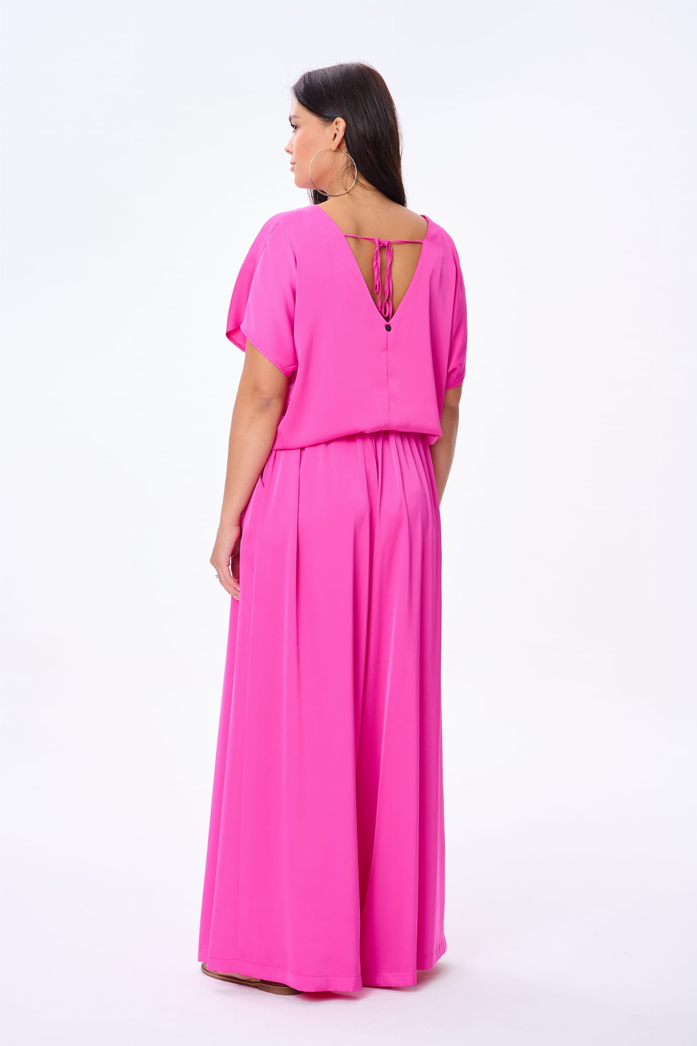 Ta piękność może się pochwalić wykończonym na gładziutko dekoltem w serek i kimonowymi rękawami. Z tyłu u góry jest wiązanie, który utrzymuje CYGARO w ryzach. A cięcie na środku wysmukla sylwetkę. I jakoś tak się odświętnie zrobiło, prawda?