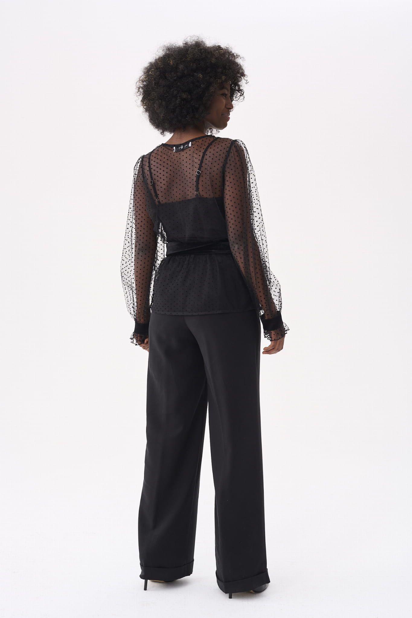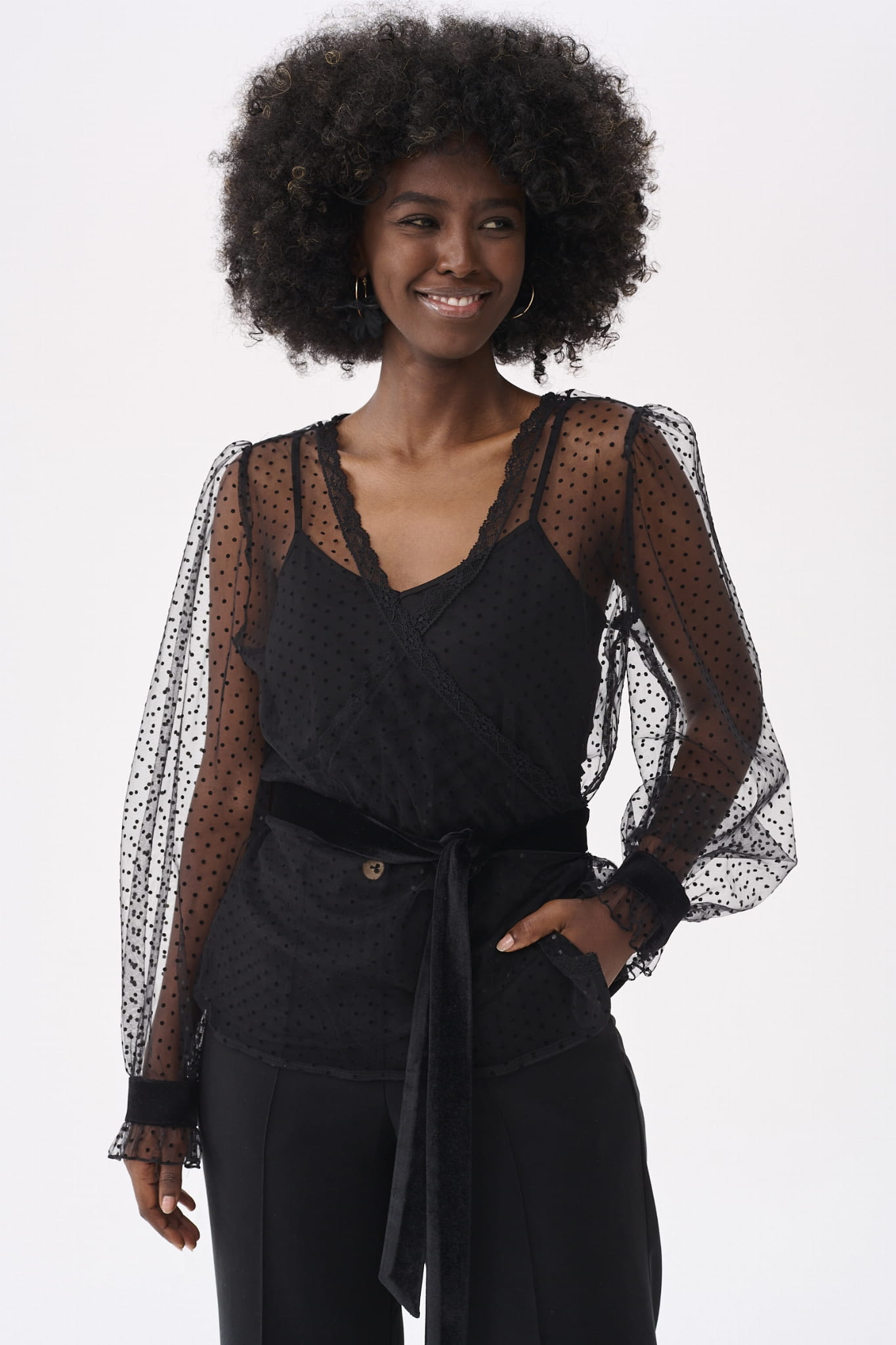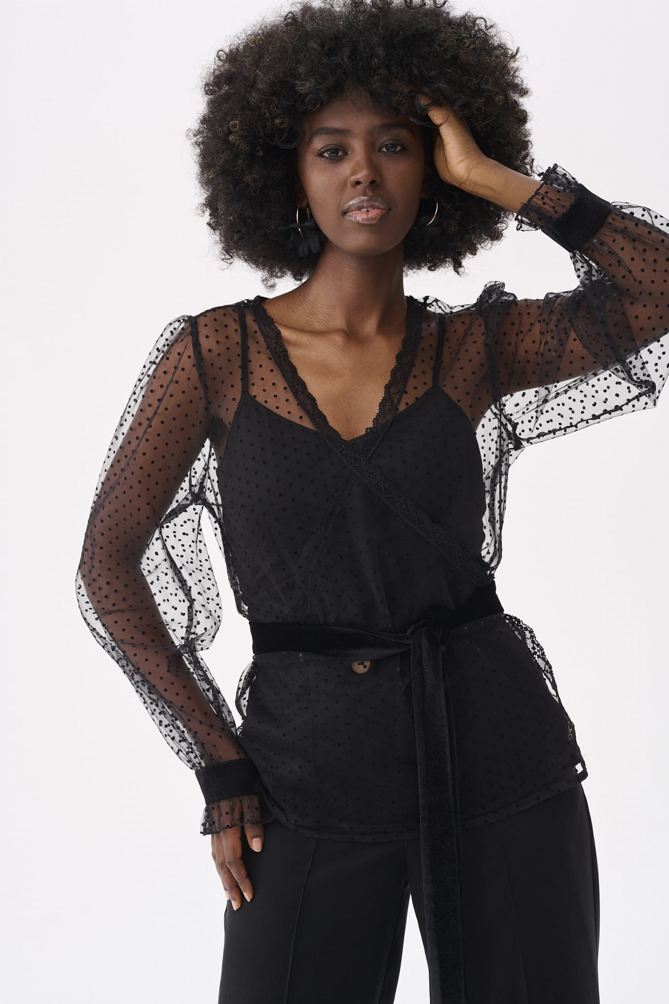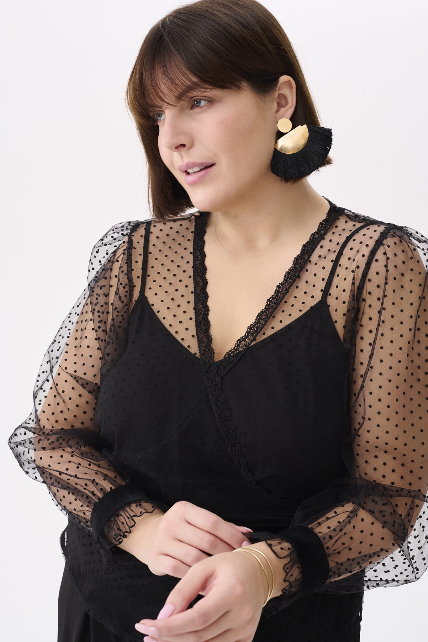 KLER to w zasadzie dwie bluzki w jednym. Pod spodem jest gładki, czarny top z cienkimi ramiączkami, które można regulować, i linią dekoltu, dopasowaną tak, aby nie było widać stanika. Ale wrażenie robi sam czarny wierzch KLER, czyli siateczka we flokowe groszki. Składa się ona z dwóch, nakładających się na siebie części (jak koperta właśnie). Mamy tu też rękaw wykończony na mereżce. Na jego końcu jest aksamitna gumka, która dociąga go do nadgarstka.