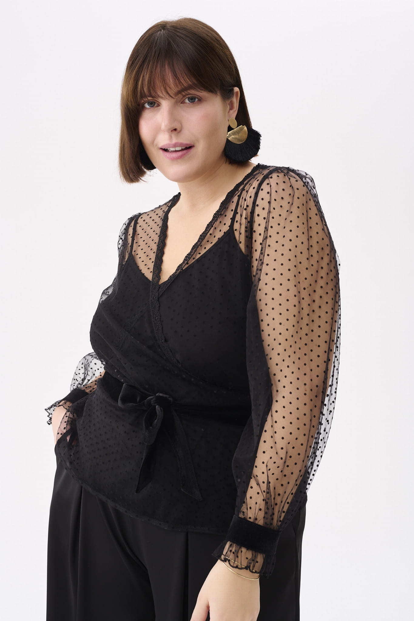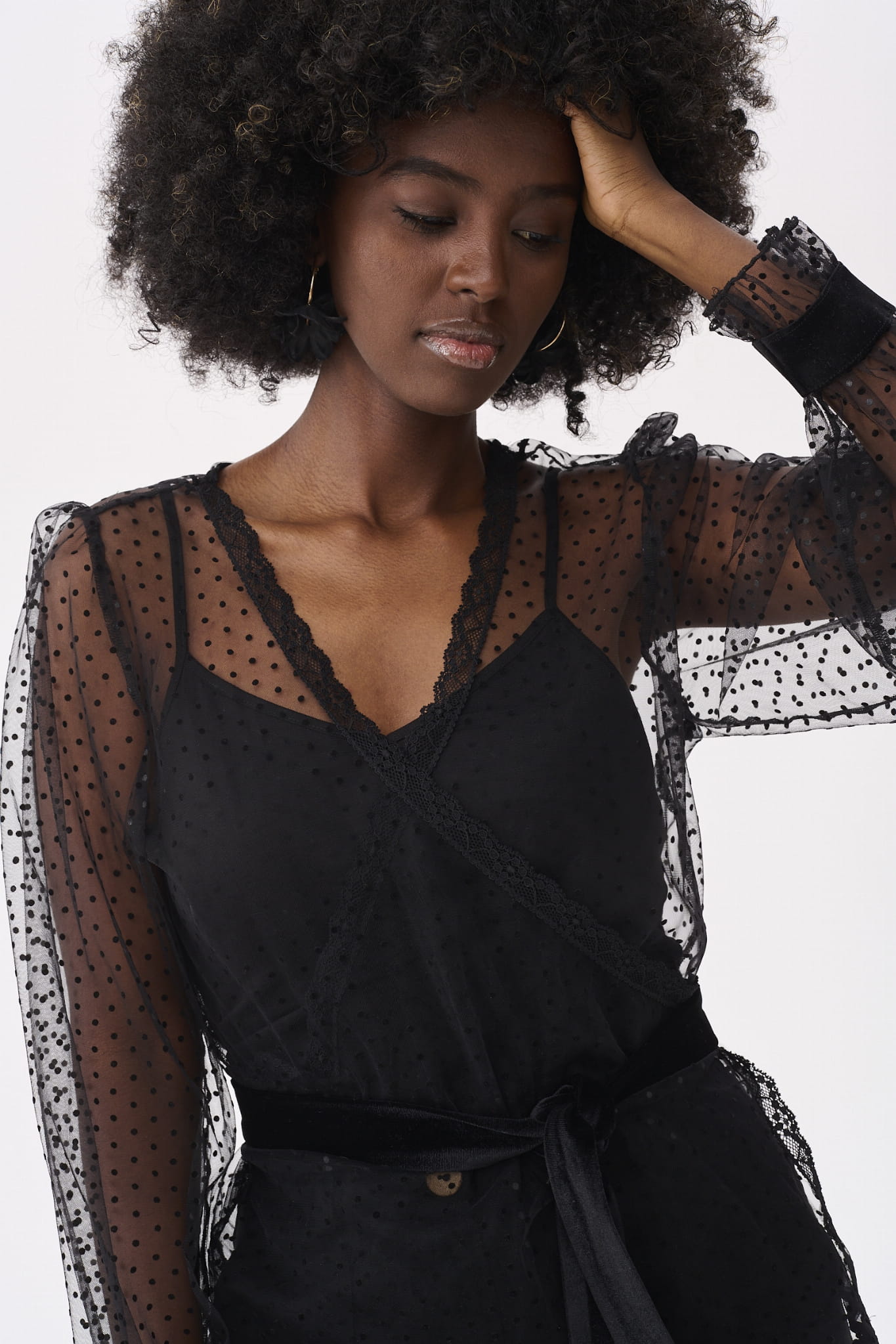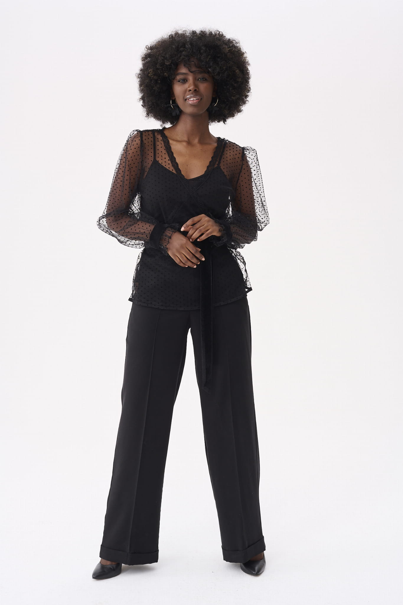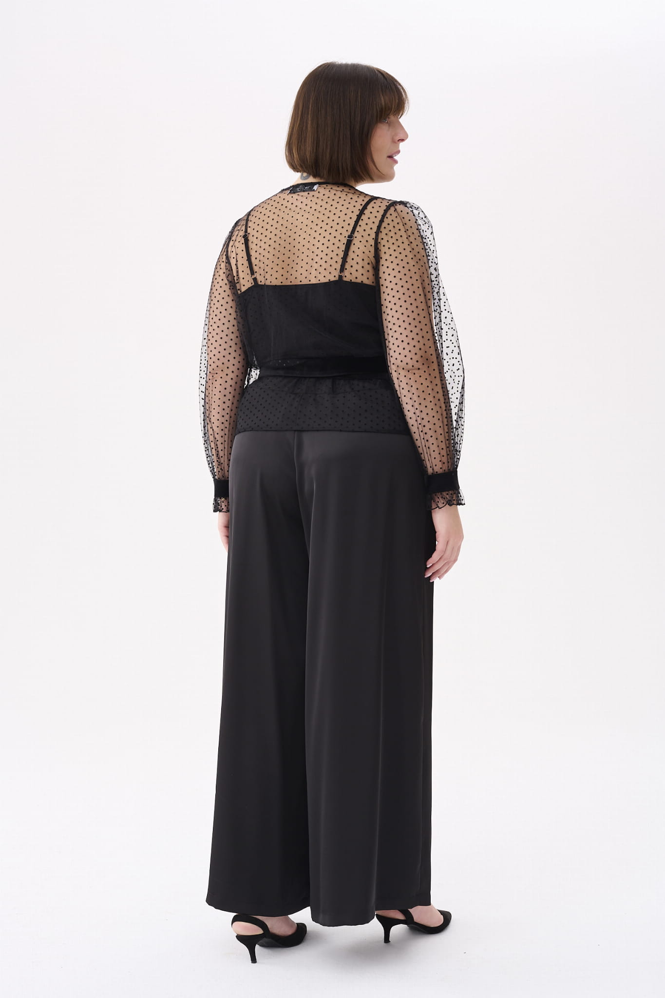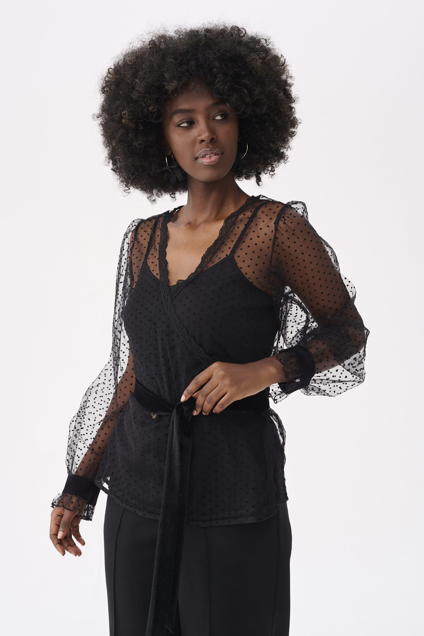 KLER to w zasadzie dwie bluzki w jednym. Pod spodem jest gładki, czarny top z cienkimi ramiączkami, które można regulować, i linią dekoltu, dopasowaną tak, aby nie było widać stanika. Ale wrażenie robi sam czarny wierzch KLER, czyli siateczka we flokowe groszki. Składa się ona z dwóch, nakładających się na siebie części (jak koperta właśnie). Mamy tu też rękaw wykończony na mereżce. Na jego końcu jest aksamitna gumka, która dociąga go do nadgarstka.