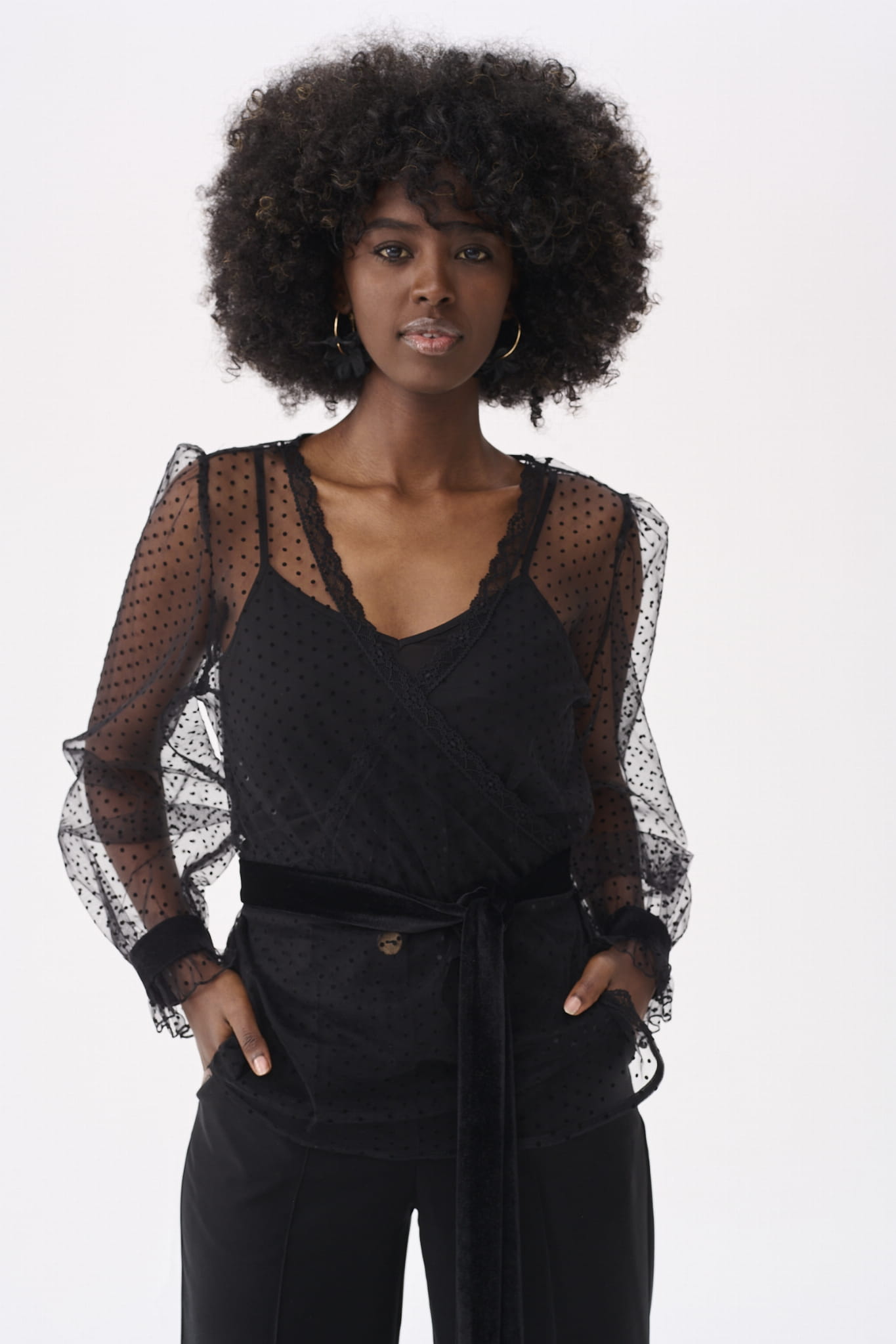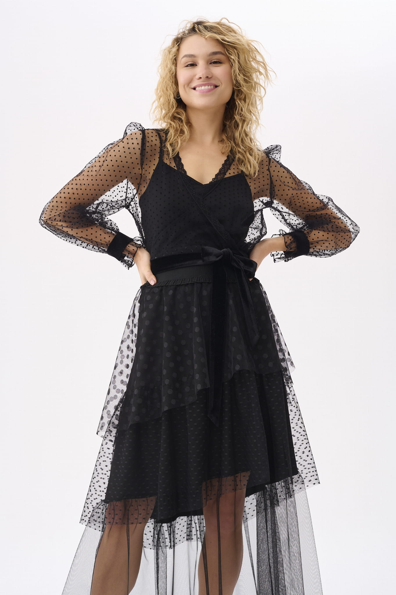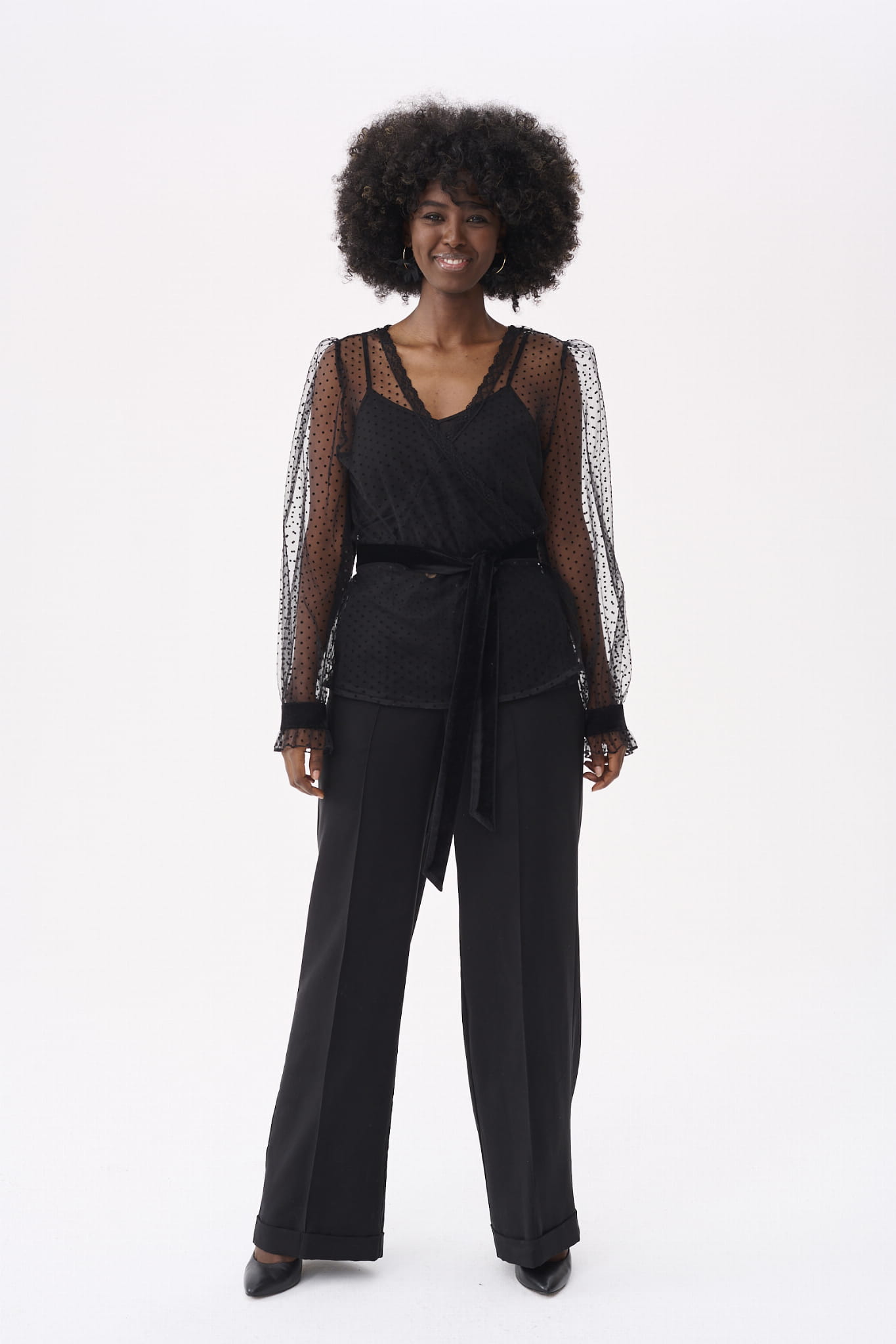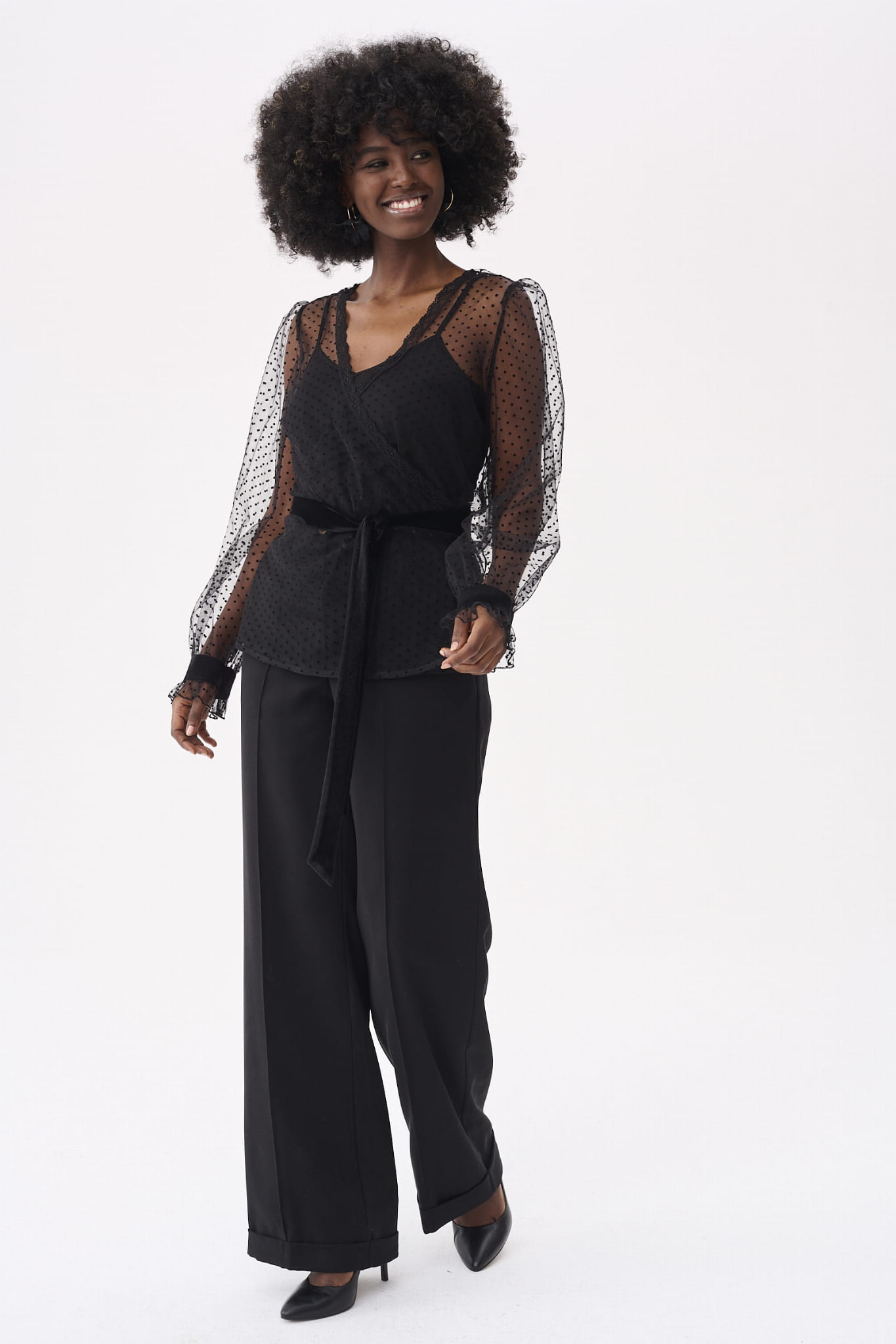 KLER to w zasadzie dwie bluzki w jednym. Pod spodem jest gładki, czarny top z cienkimi ramiączkami, które można regulować, i linią dekoltu, dopasowaną tak, aby nie było widać stanika. Ale wrażenie robi sam czarny wierzch KLER, czyli siateczka we flokowe groszki. Składa się ona z dwóch, nakładających się na siebie części (jak koperta właśnie). Mamy tu też rękaw wykończony na mereżce. Na jego końcu jest aksamitna gumka, która dociąga go do nadgarstka.