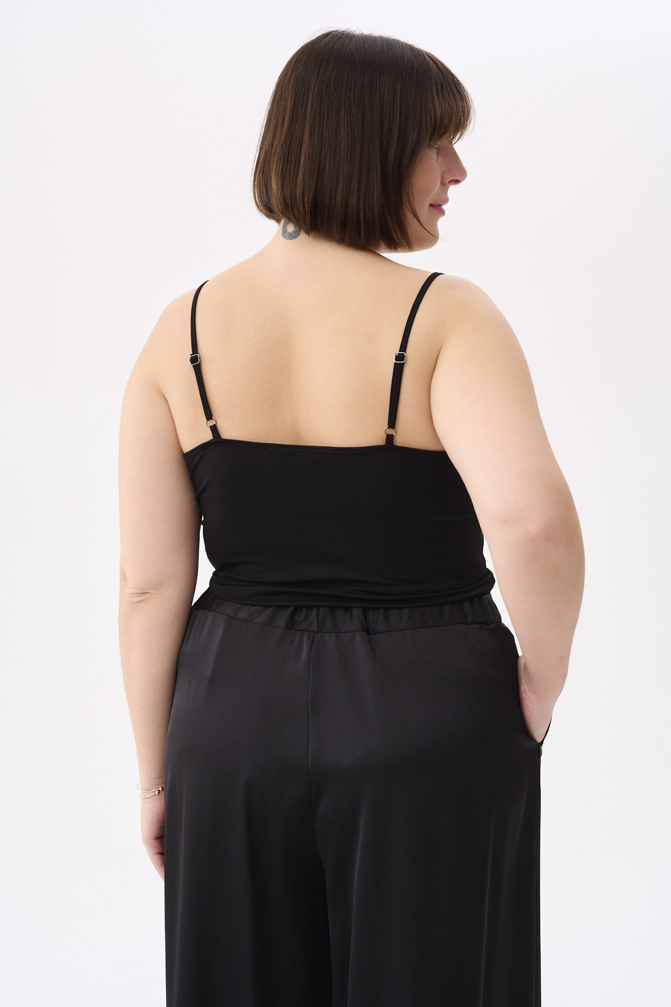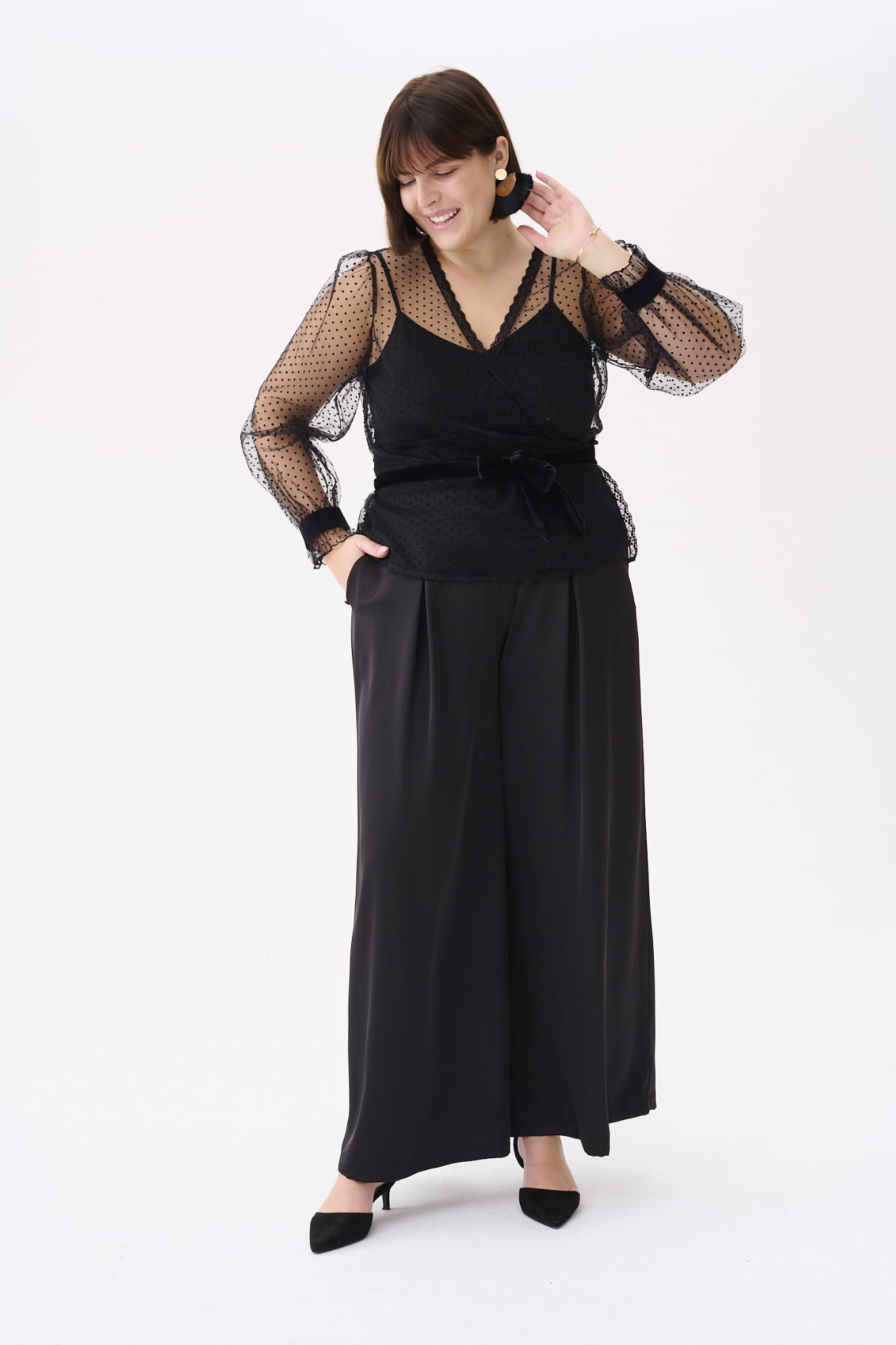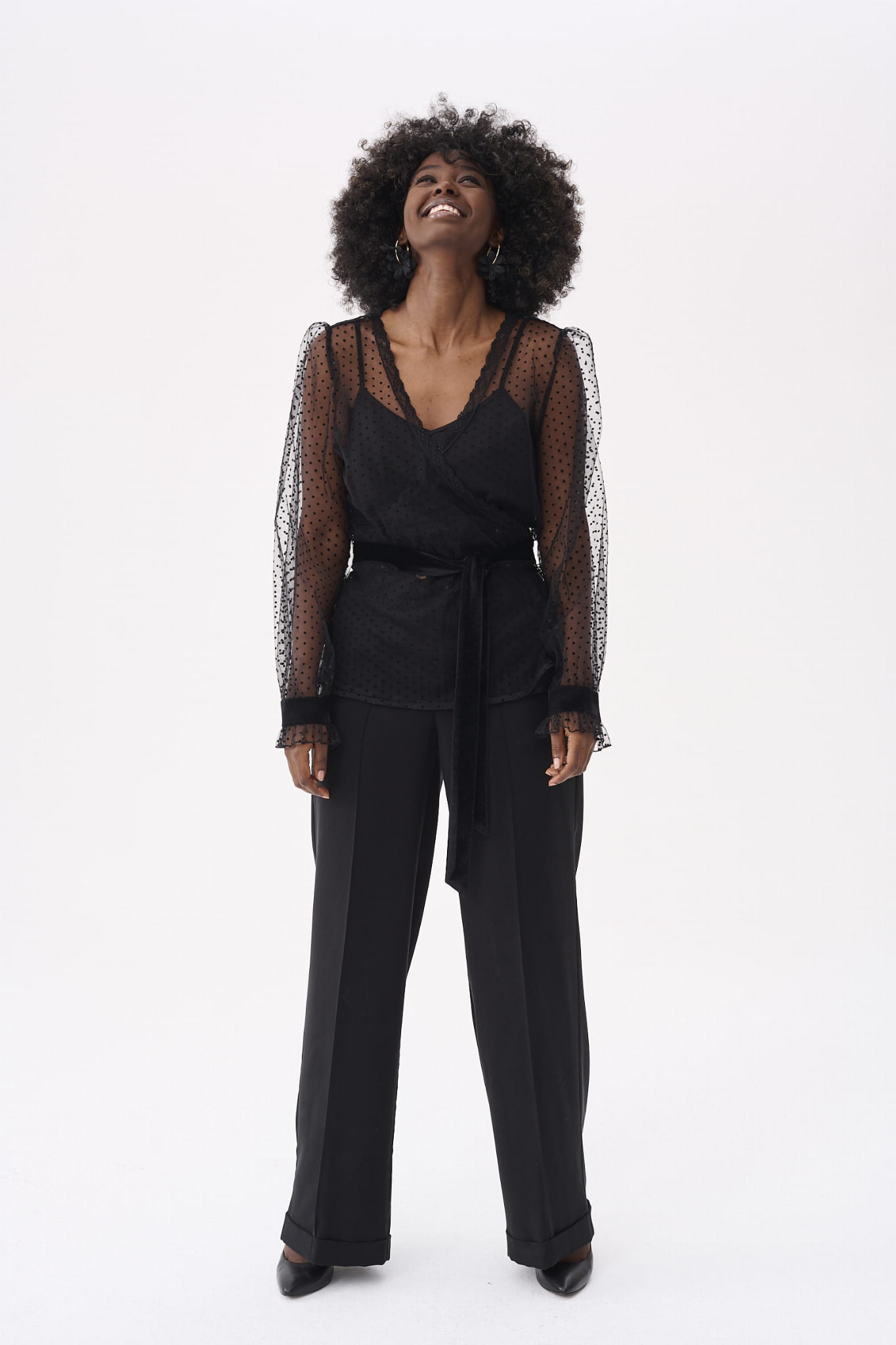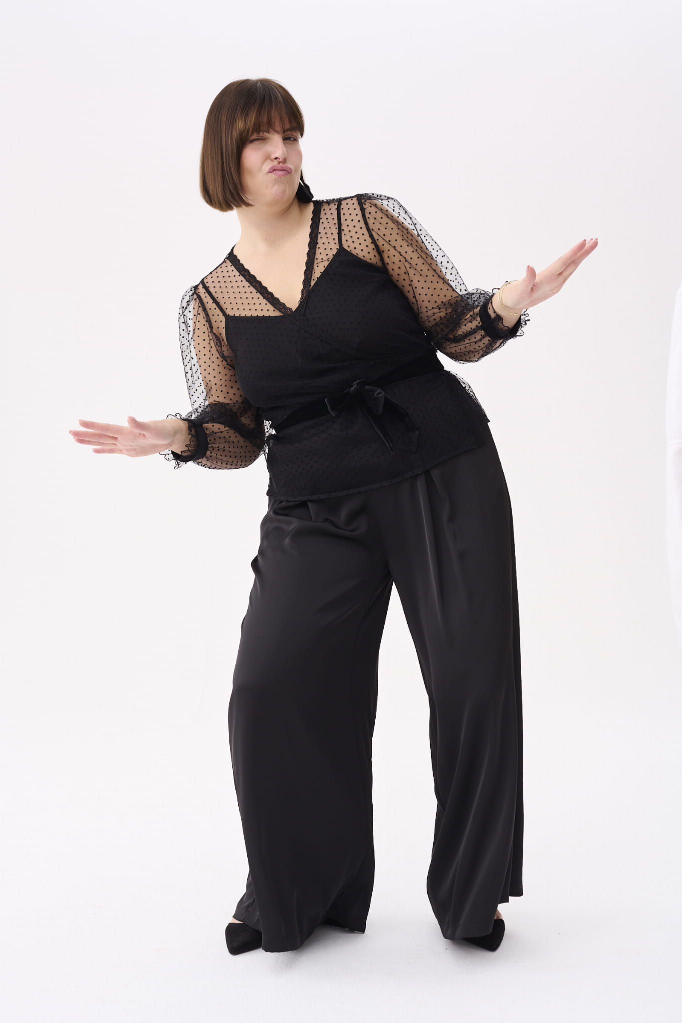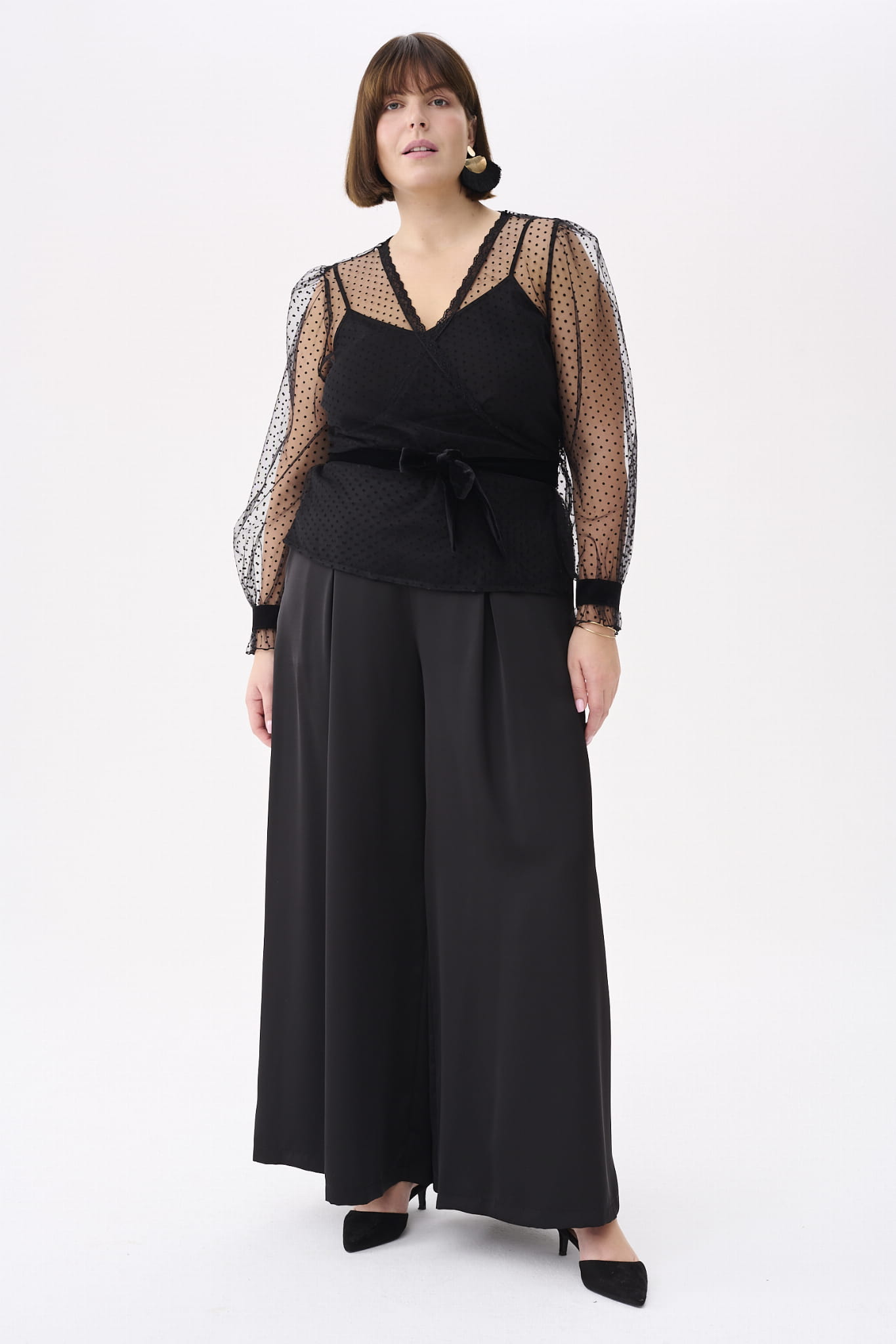 KLER to w zasadzie dwie bluzki w jednym. Pod spodem jest gładki, czarny top z cienkimi ramiączkami, które można regulować, i linią dekoltu, dopasowaną tak, aby nie było widać stanika. Ale wrażenie robi sam czarny wierzch KLER, czyli siateczka we flokowe groszki. Składa się ona z dwóch, nakładających się na siebie części (jak koperta właśnie). Mamy tu też rękaw wykończony na mereżce. Na jego końcu jest aksamitna gumka, która dociąga go do nadgarstka.