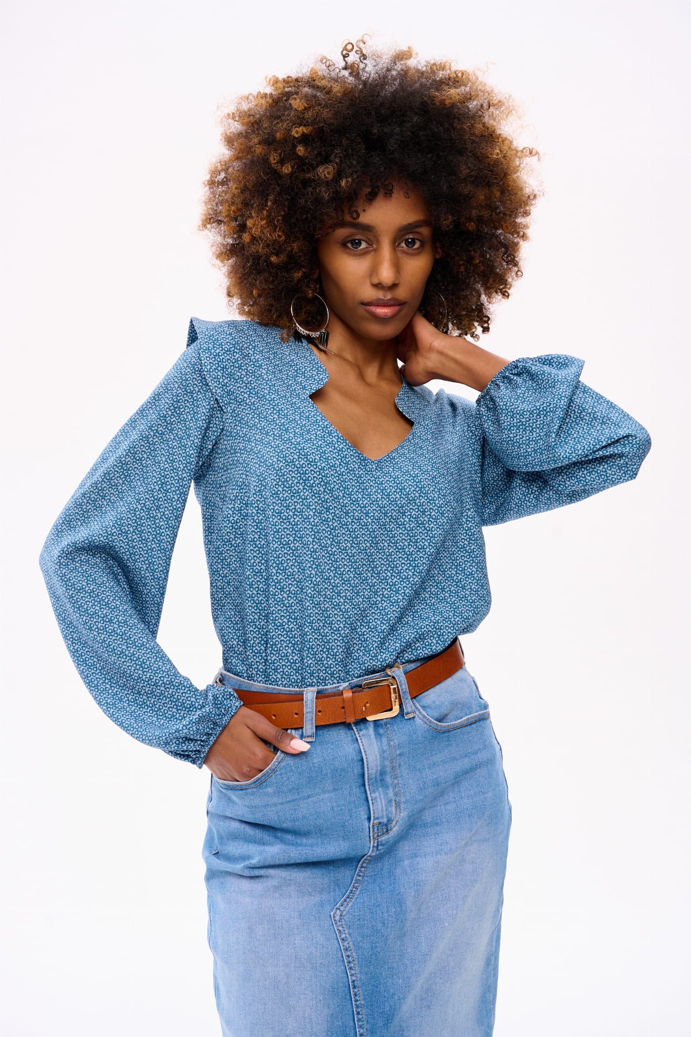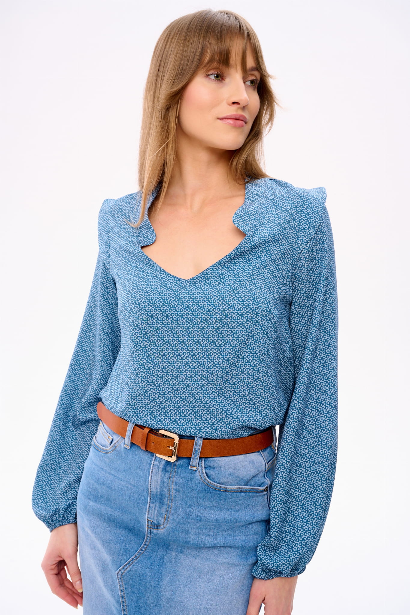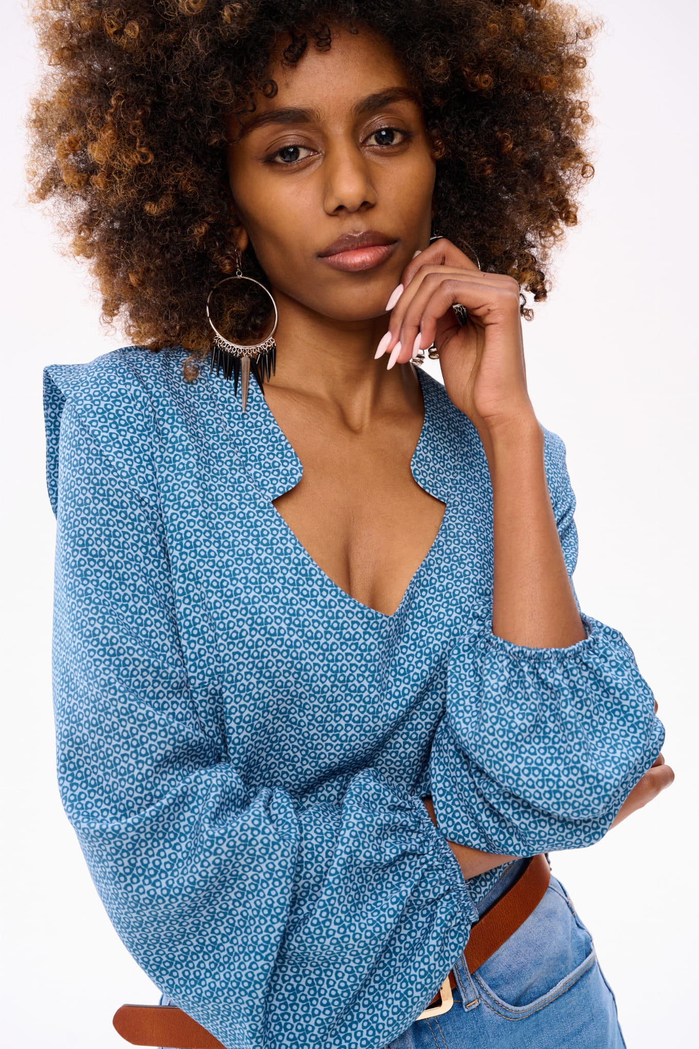 Wyobraź sobie skafander kosmiczny w postaci eleganckiej bluzki boho. Bo tak właśnie można by scharakteryzować RUFO. Ma ona minimalistyczne wykończenie w dekolcie w serek. Gumka w dole rękawa tworzy tam bufkę i pozwala regulować długość rękawa. Bluzka jest dopasowana w biuście, a luźna w talii. A ten wzór w niebieskie kółka to dodatkowy mariaż akcentów boho z elementami nowoczesnymi.