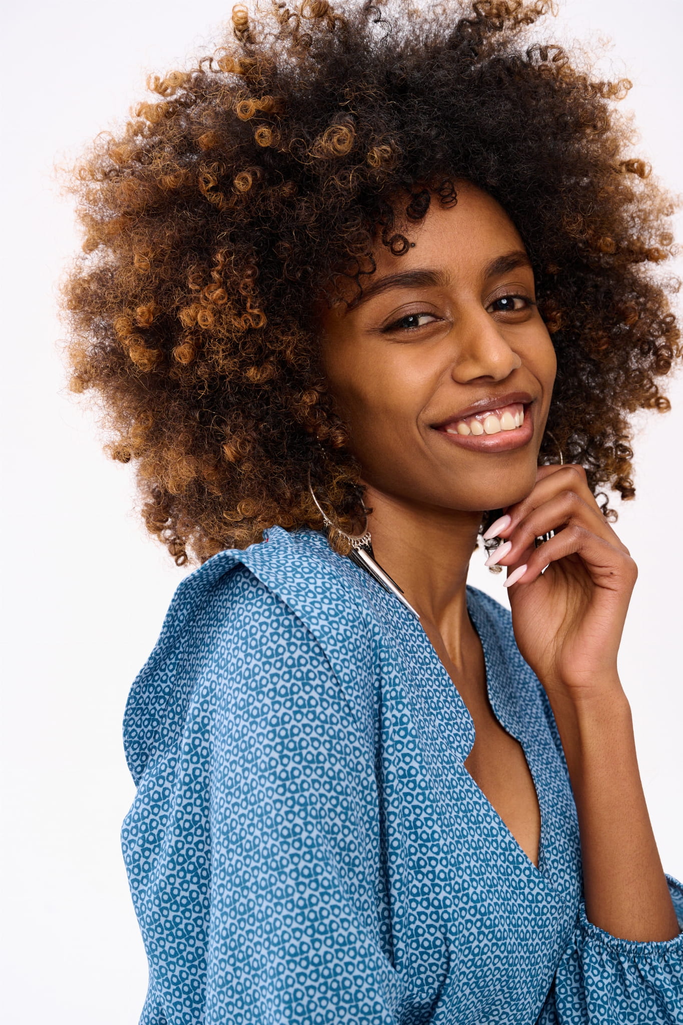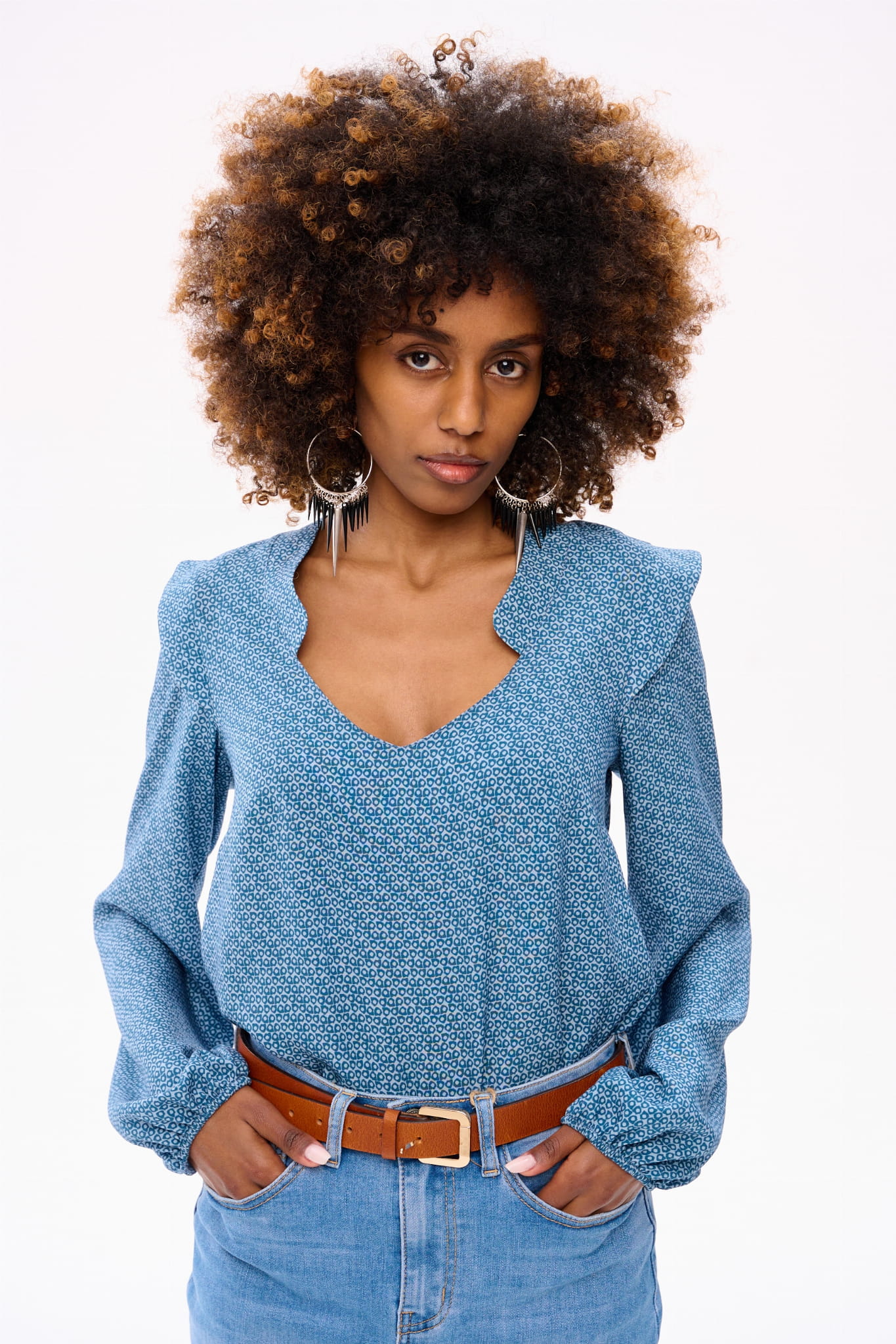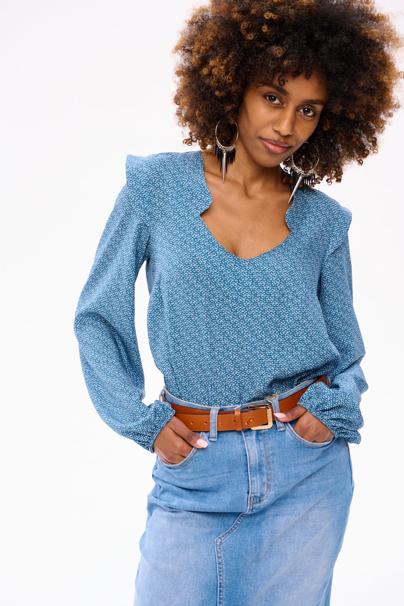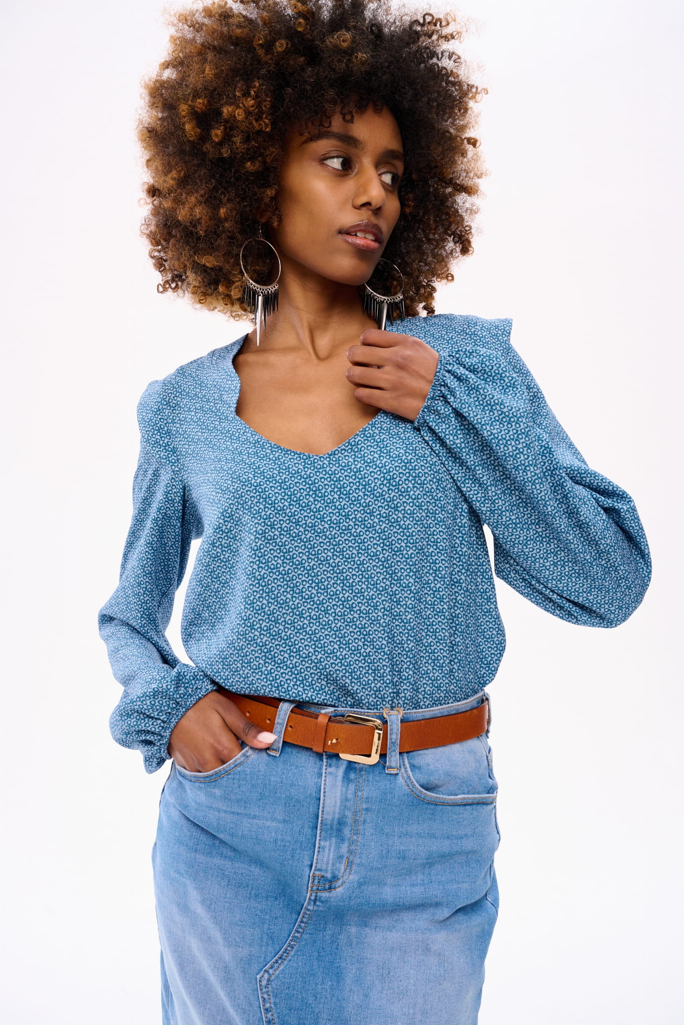 Wyobraź sobie skafander kosmiczny w postaci eleganckiej bluzki boho. Bo tak właśnie można by scharakteryzować RUFO. Ma ona minimalistyczne wykończenie w dekolcie w serek. Gumka w dole rękawa tworzy tam bufkę i pozwala regulować długość rękawa. Bluzka jest dopasowana w biuście, a luźna w talii. A ten wzór w niebieskie kółka to dodatkowy mariaż akcentów boho z elementami nowoczesnymi.