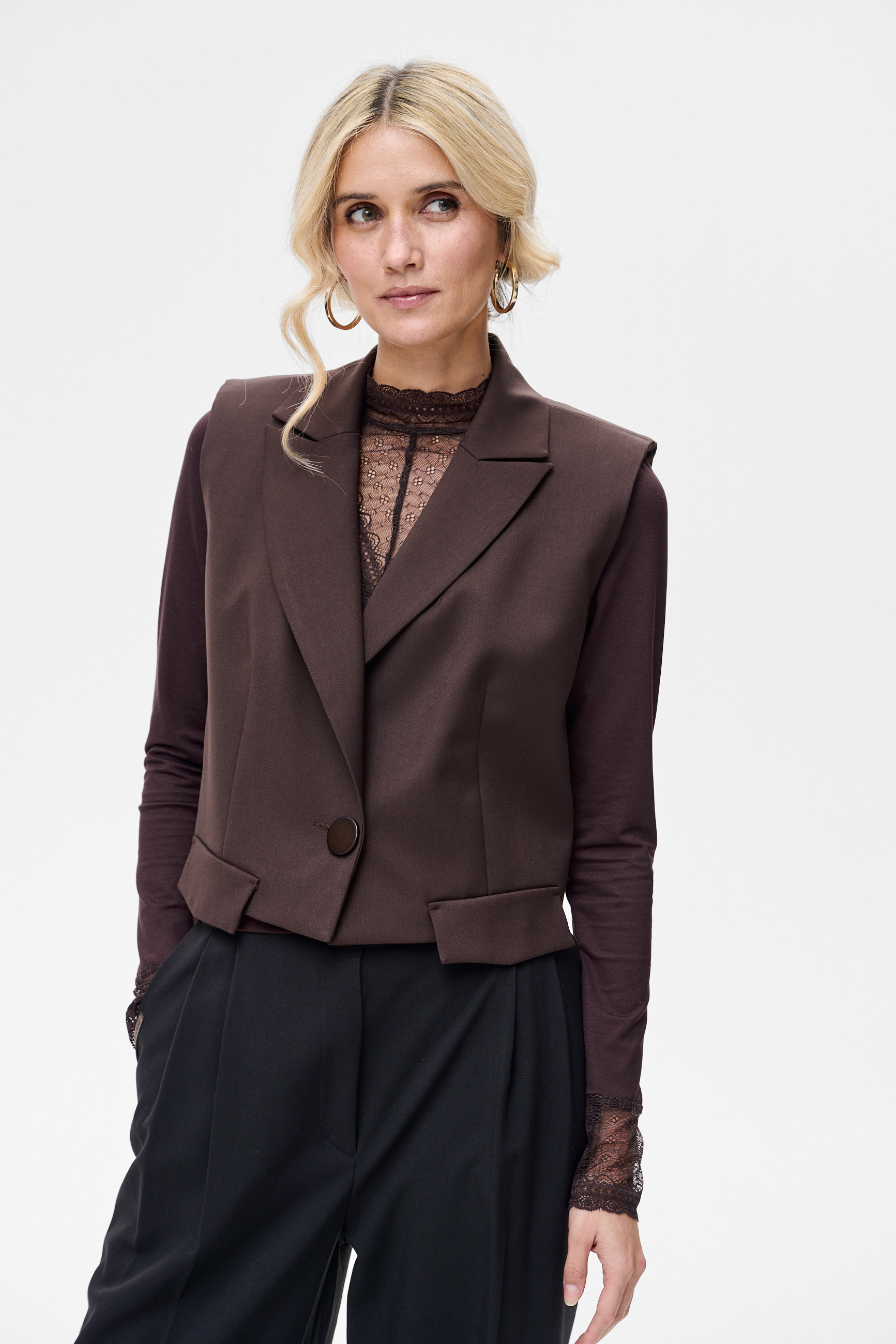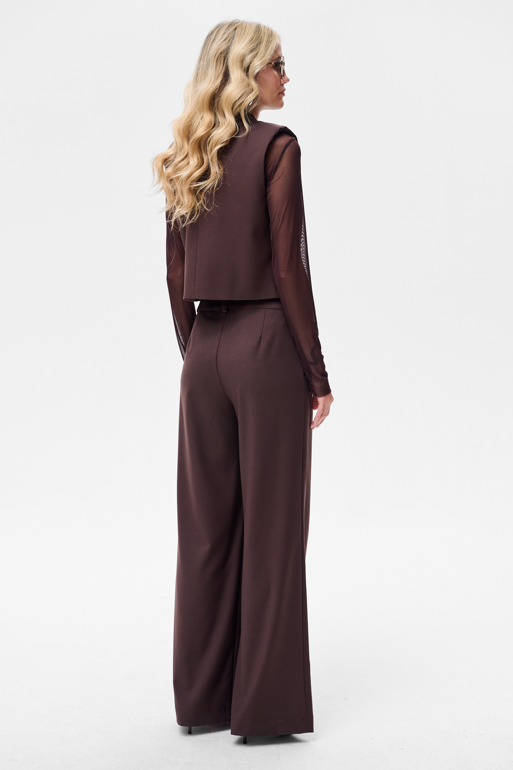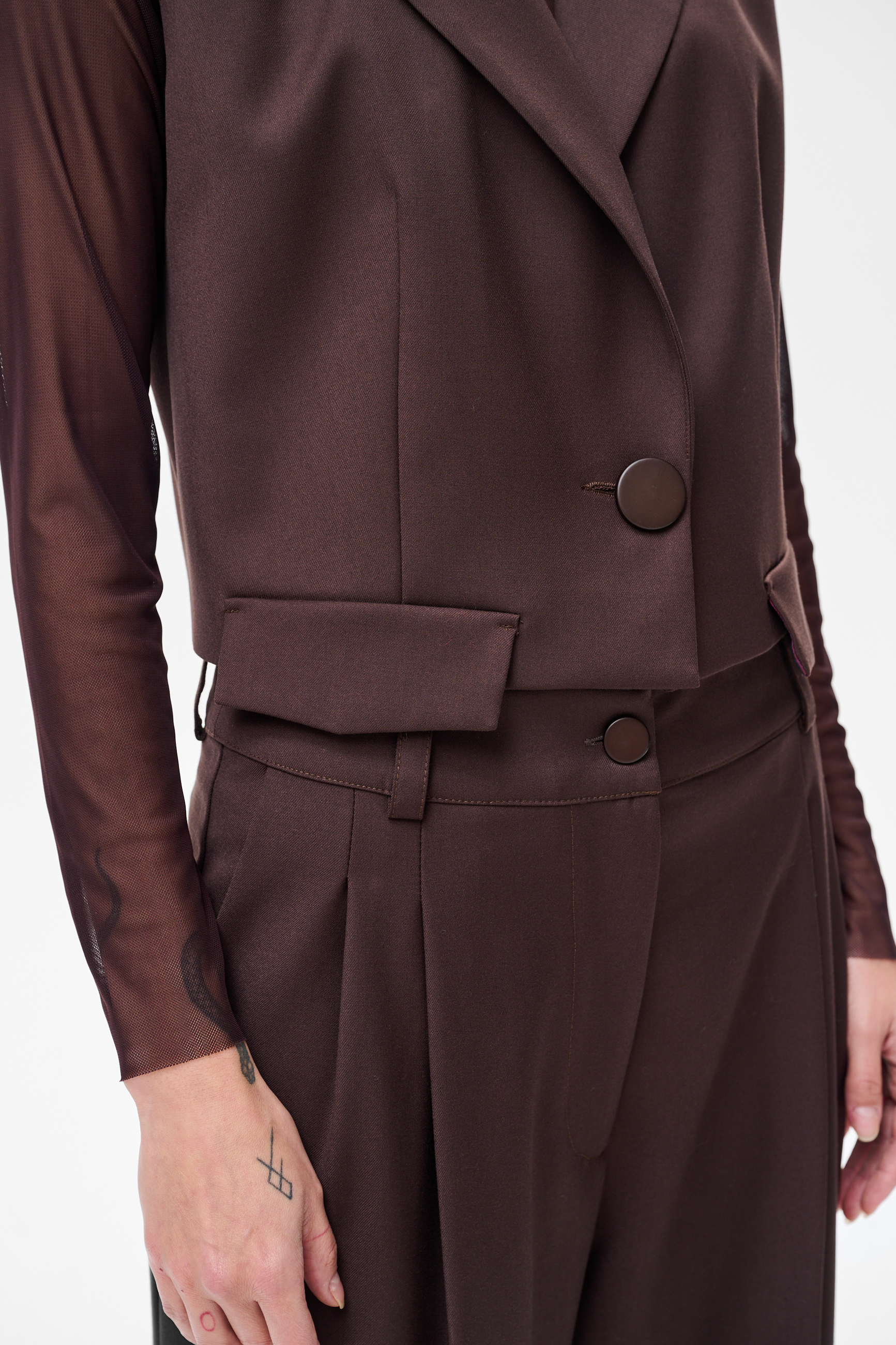Stylizowane fasonem na męskie garniturowe, spodnie z tego kompletu mają z przodu kontrafałdy, które dodają objętości nogawkom i wysmuklają sylwetkę. Jest też duży, okrągły, matowy guzik, którym nawiązujemy do minimalistycznego charakteru całości. Żaden garnitur nie może się też obyć bez kieszeni - w tym przypadku obniżyłyśmy ich patki na kamizelce i podszyłyśmy je od spodu podszewki.
