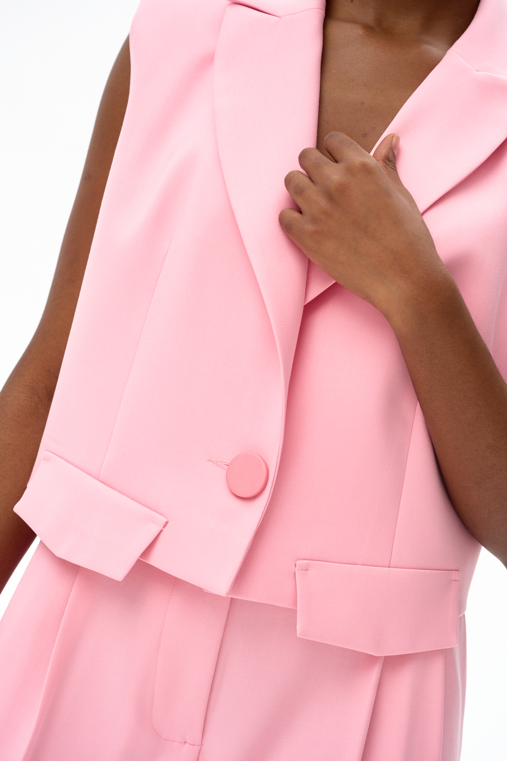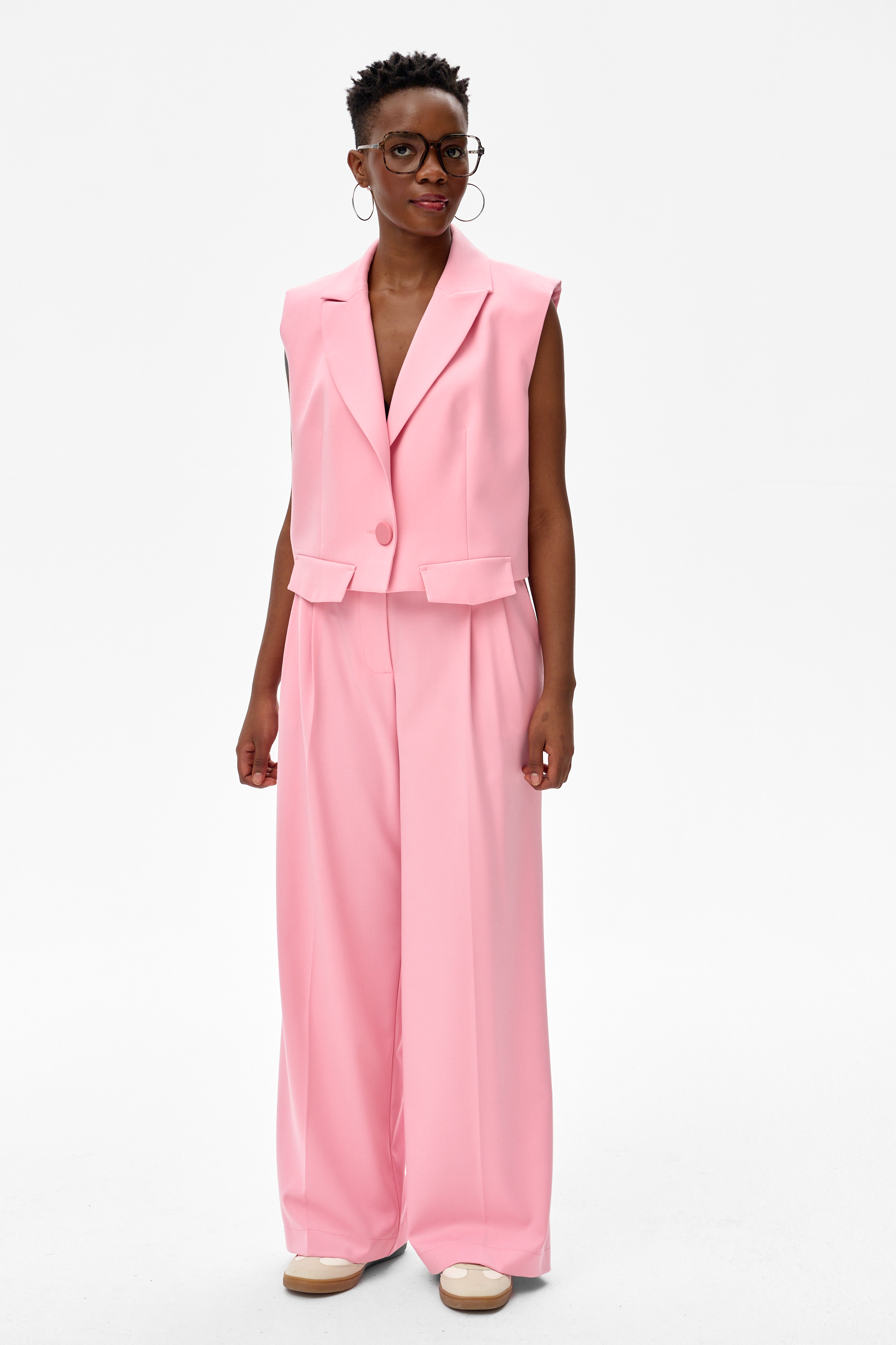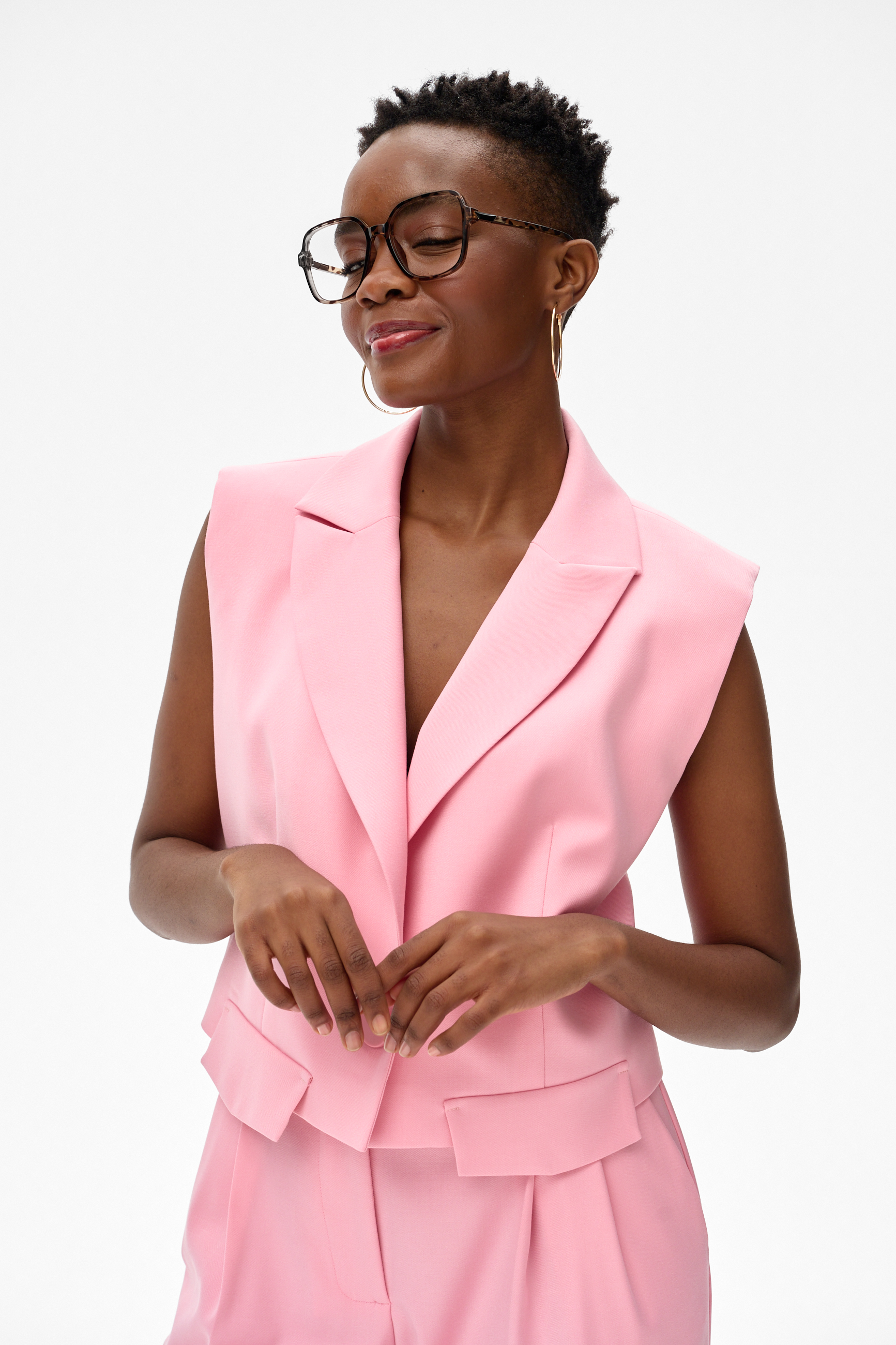Nie przypominamy sobie, abyśmy widziały ostatnio wiele kompletów spodni z kamizelką zamiast marynarki, wykonanych z wiskozowej tkaniny garniturowej. A Ty? Z pewnością górne części takich kompletów nie mają też zazwyczaj tak ozdobnej, mieniącej się dwutonowej podszewki, którą - szczerze mówiąc - można by nosić na lewą stronę. Ale ponieważ w blue shadow często bazujemy na tradycji, zachowałyśmy kilka klasycznych elementów. Stylizowane fasonem na męskie garniturowe, spodnie z tego kompletu mają z przodu kontrafałdy, które dodają objętości nogawkom i wysmuklają sylwetkę. Jest też duży, okrągły, matowy guzik, którym nawiązujemy do minimalistycznego charakteru całości. Żaden garnitur nie może się też obyć bez kieszeni - w tym przypadku obniżyłyśmy ich patki na kamizelce i podszyłyśmy je od spodu podszewki. Więc gdyby garnitury zawsze projektowały kobiety, byłyby one na pewno bardziej nowatorskie i stylowe. Prawda?