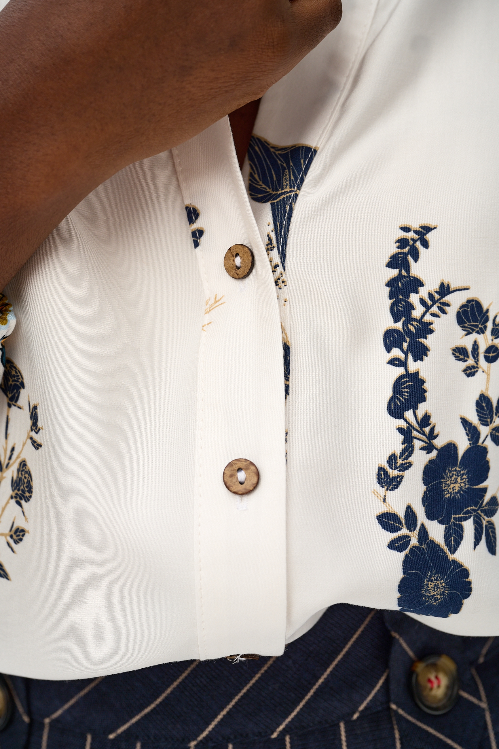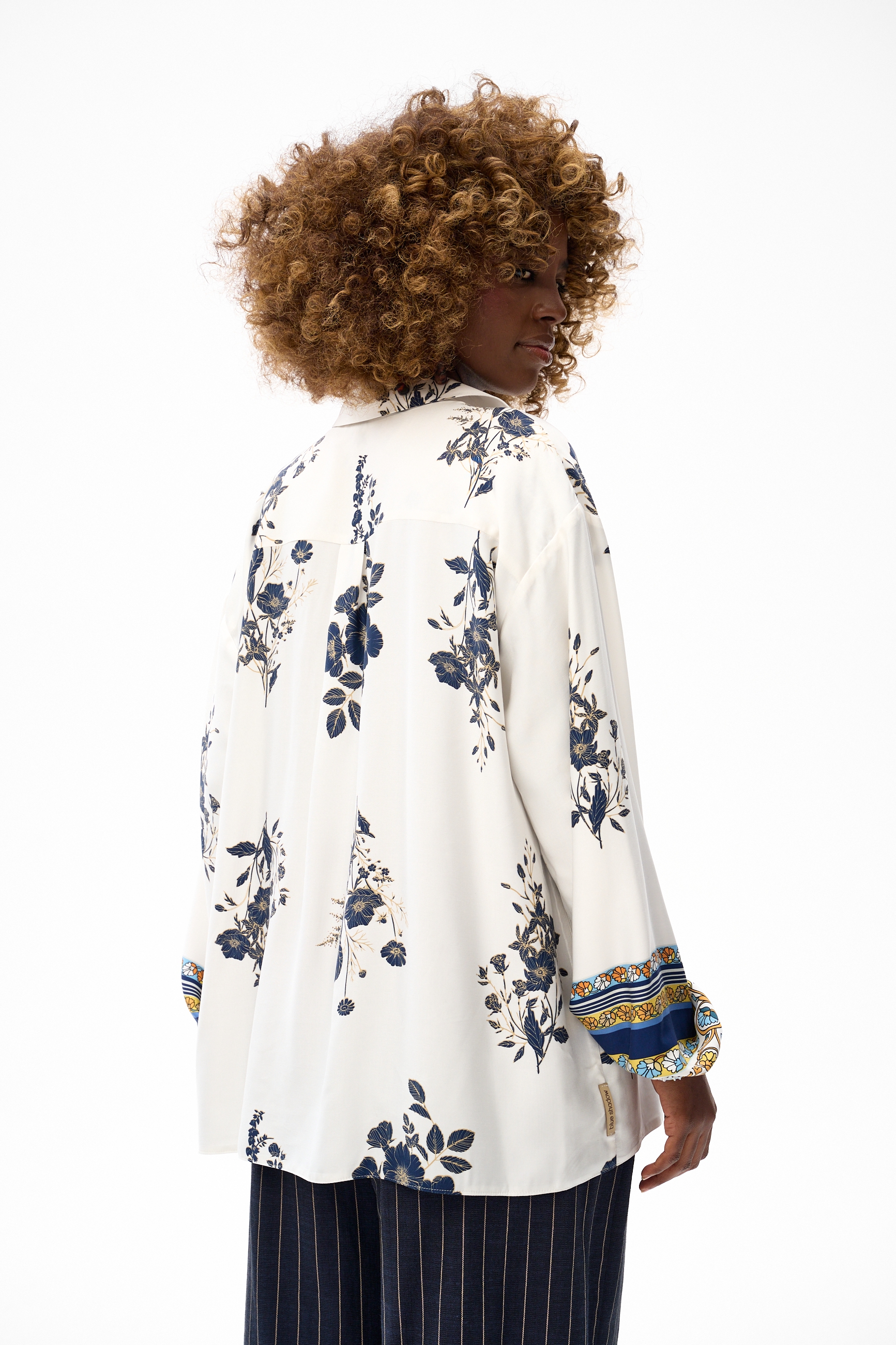 Mimo że mamy tu wykończenia koszulowe (czyli kołnierz), RAHOMI szczyci się także wysmuklającym i ładnie wyprofilowanym dekoltem w serek, który - uwaga! - specjalnie się nie domyka do samej góry. Na plisie, biegnącej w dół od dekoltu, znajdziesz nasze ulubione guziczki-kokoski. Z tyłu natomiast widać odcięcie karczku, a pod nim zakładkę, z której rozchodzą się pionowe, falujące lekko linie. Rękawy na końcach mają gumkę, tworząca bufkę. I w ogóle właśnie rękawy są przeciekawym elementem tego modelu, bo zakończone są dekoracyjnym kwiatowym borderem, kontrastującym z częścią zasadniczą bluzki. Ale, ale… jest jeszcze jedna niespodzianka. Do całości masz od nas w prezencie wstążkę z tym samym motywem, co na rękawach. Możesz ją wykorzystać jako ozdobę torebki, krawatkę, wiązanie na włosach albo coś innego. Daj się ponieść swojej wyobraźni!