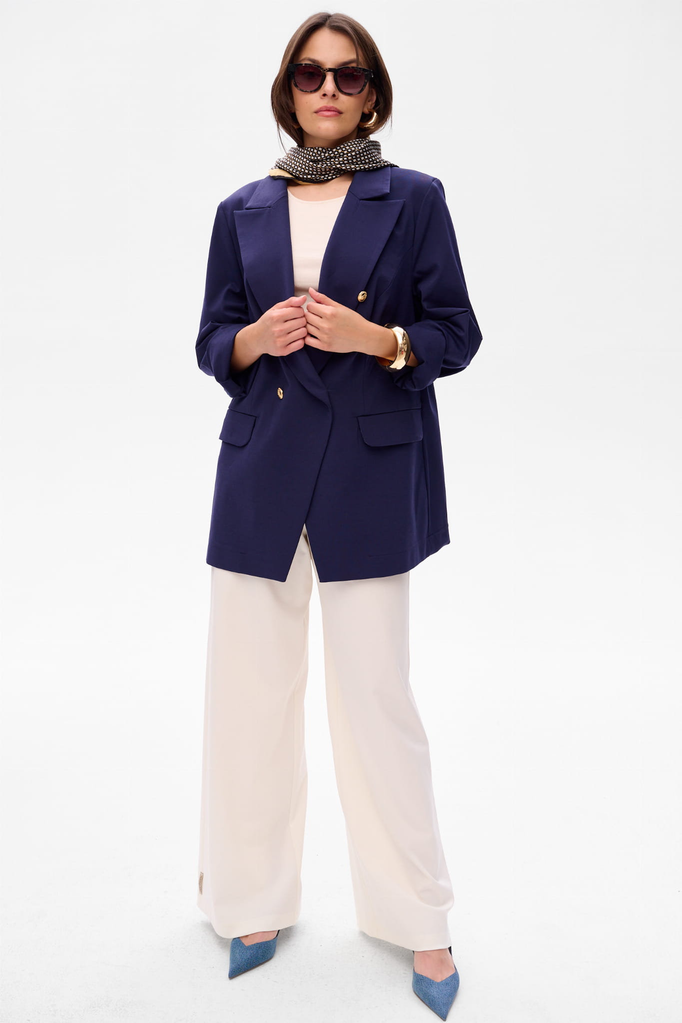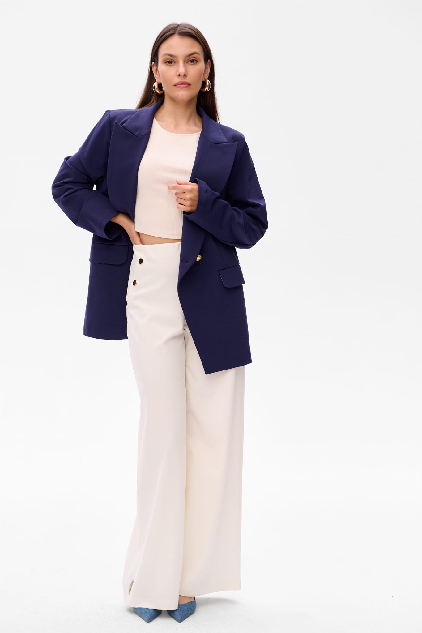 3.Total granat - a na zakończenie stawiamy na monochromatyczną wersję, składającą się z granatowych spodni ENDORFINA do marynarki ENDORFINA w tym samym kolorze.