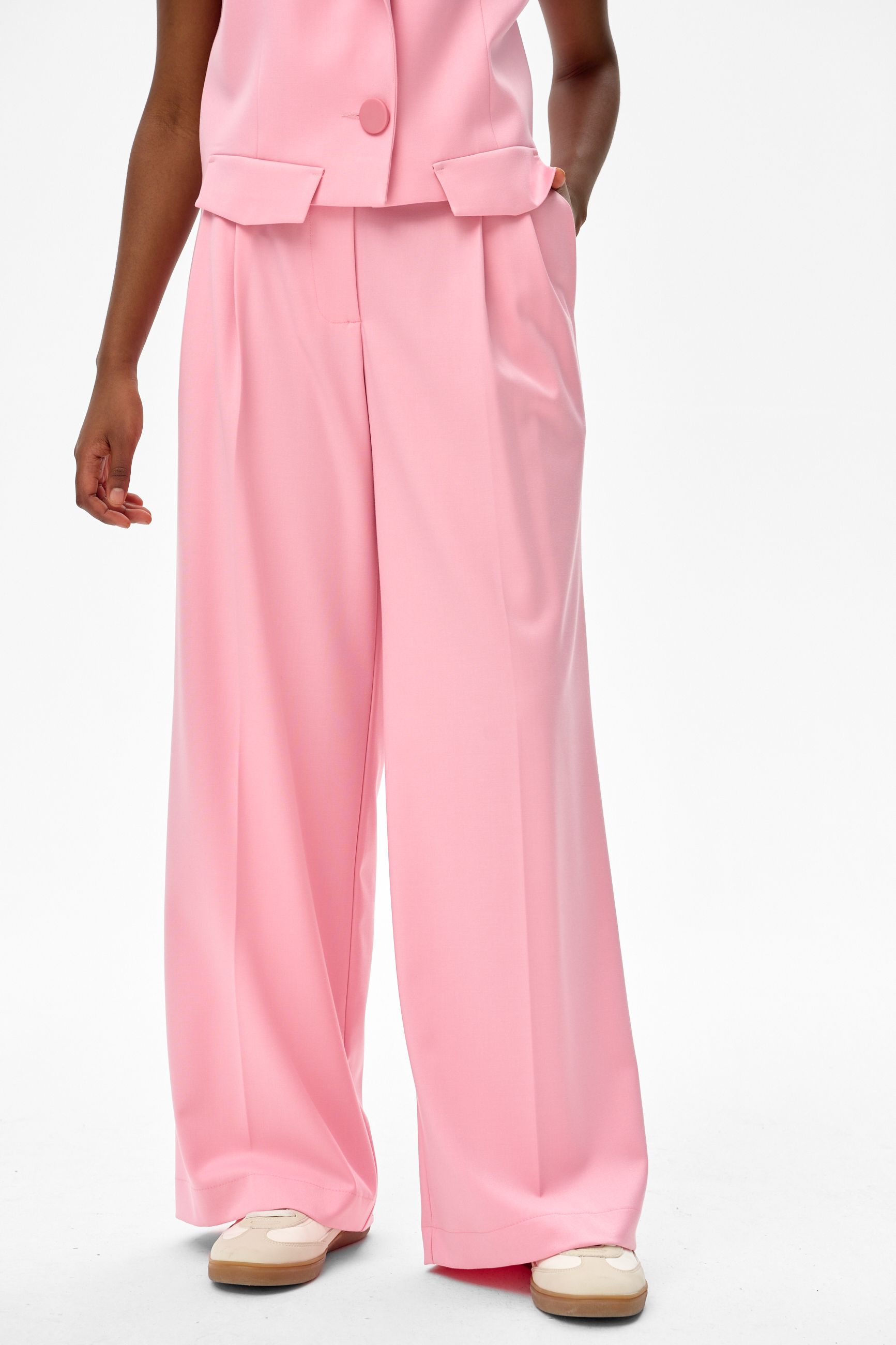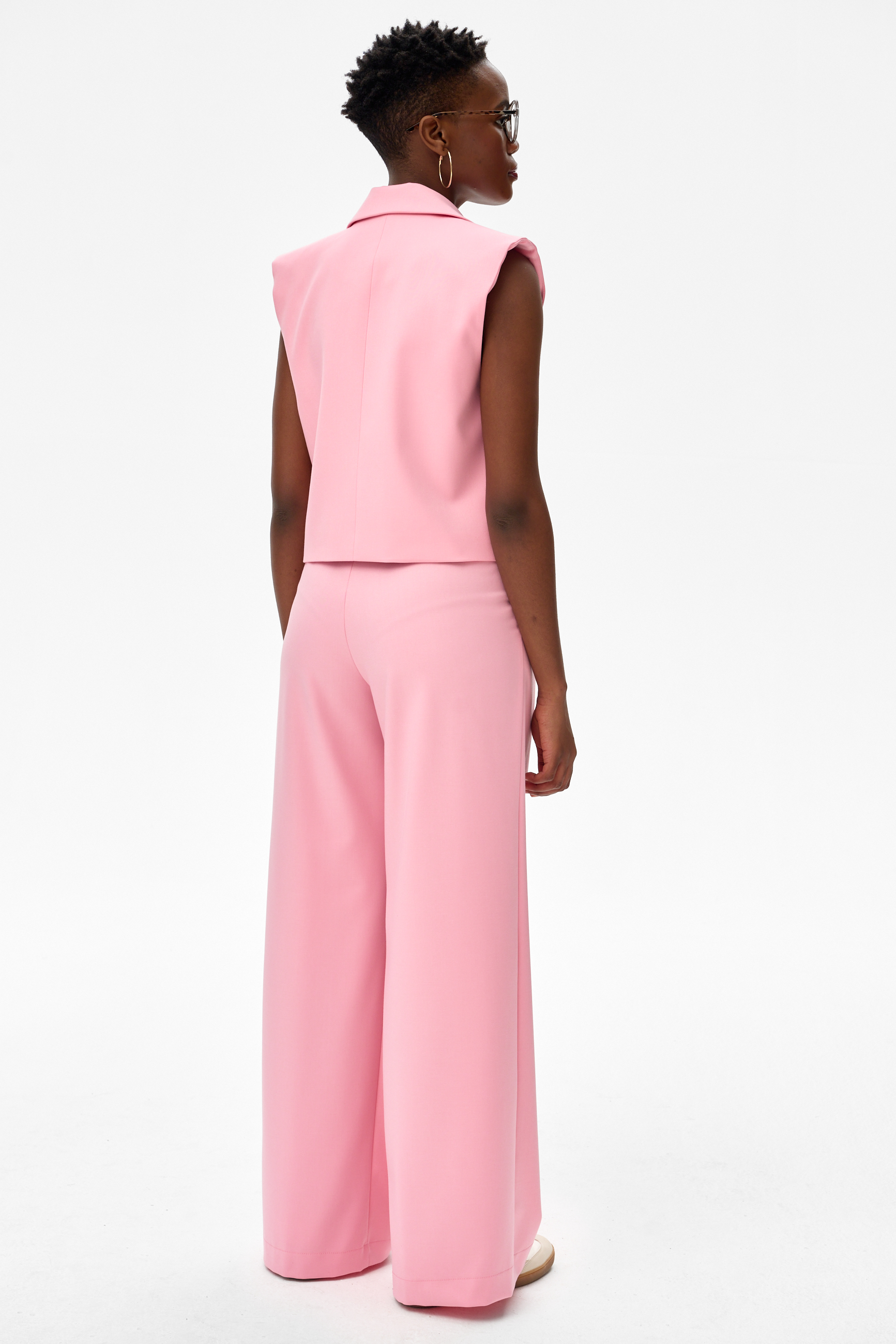 Nie przypominamy sobie, abyśmy widziały ostatnio wiele kompletów spodni z kamizelką zamiast marynarki, wykonanych z wiskozowej tkaniny garniturowej. A Ty? Z pewnością górne części takich kompletów nie mają też zazwyczaj tak ozdobnej, mieniącej się dwutonowej podszewki, którą - szczerze mówiąc - można by nosić na lewą stronę. Ale ponieważ w blue shadow często bazujemy na tradycji, zachowałyśmy kilka klasycznych elementów. Stylizowane fasonem na męskie garniturowe, spodnie z tego kompletu mają z przodu kontrafałdy, które dodają objętości nogawkom i wysmuklają sylwetkę. Jest też duży, okrągły, matowy guzik, którym nawiązujemy do minimalistycznego charakteru całości. Żaden garnitur nie może się też obyć bez kieszeni - w tym przypadku obniżyłyśmy ich patki na kamizelce i podszyłyśmy je od spodu podszewki. Więc gdyby garnitury zawsze projektowały kobiety, byłyby one na pewno bardziej nowatorskie i stylowe. Prawda?