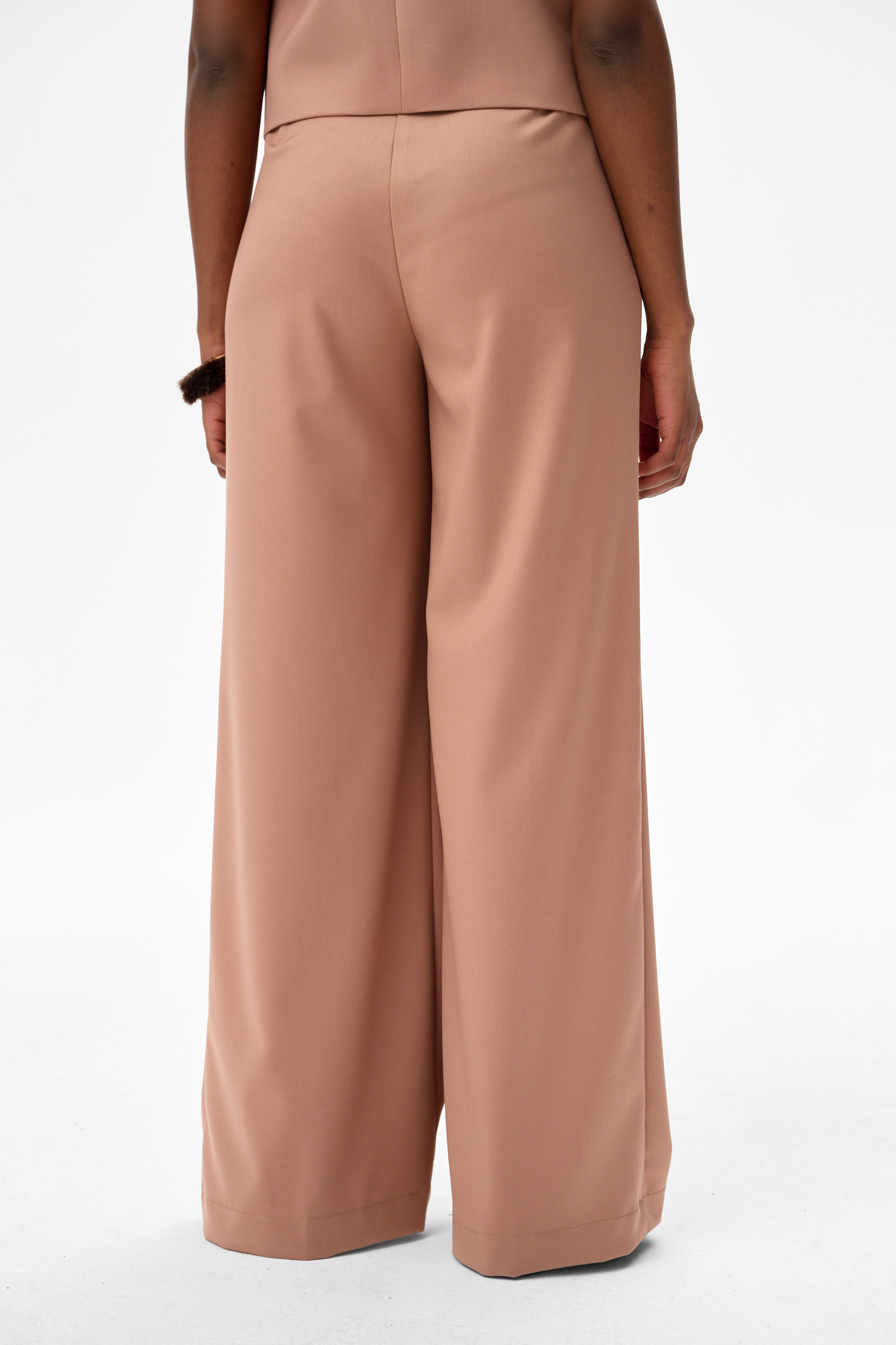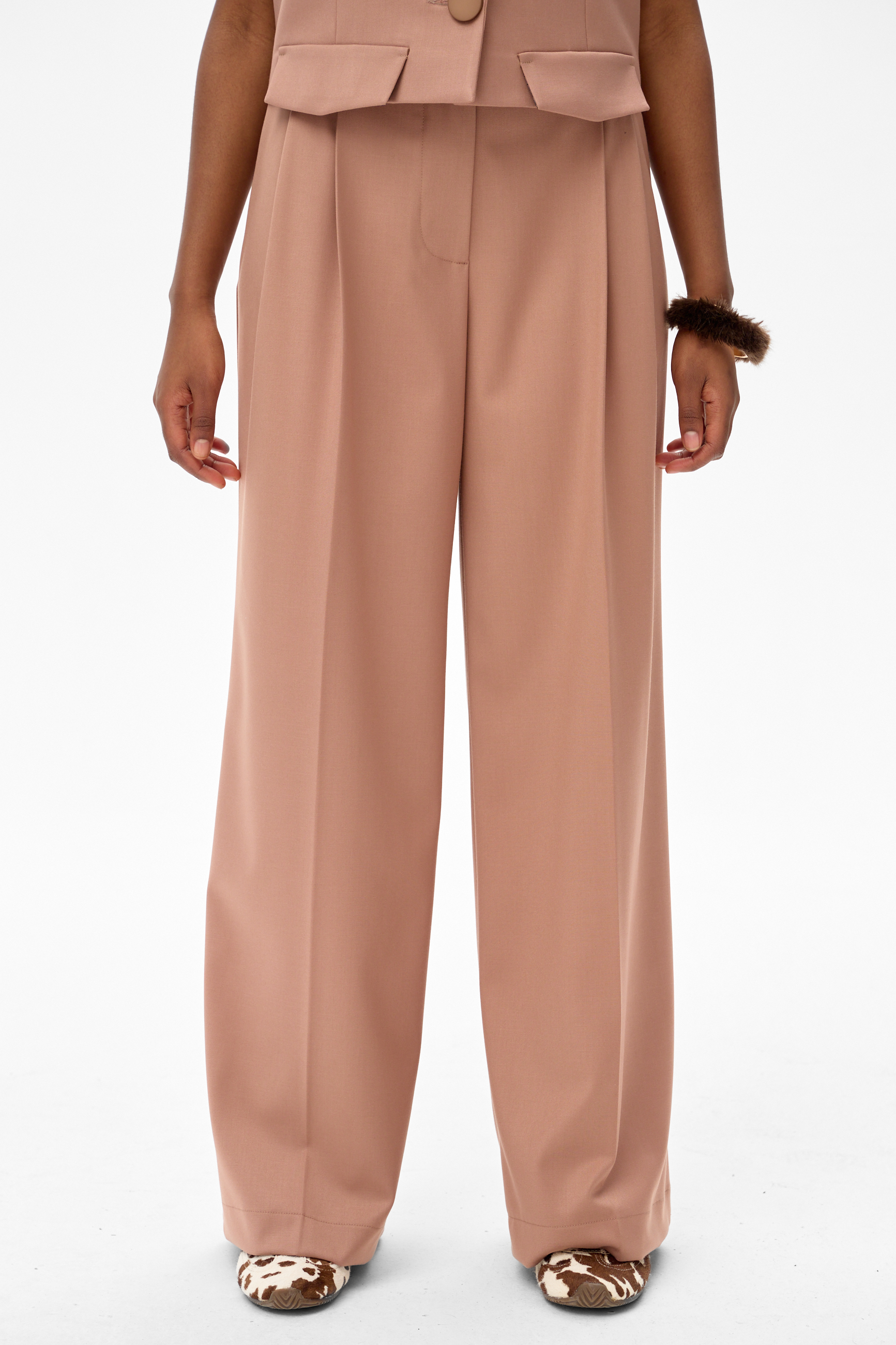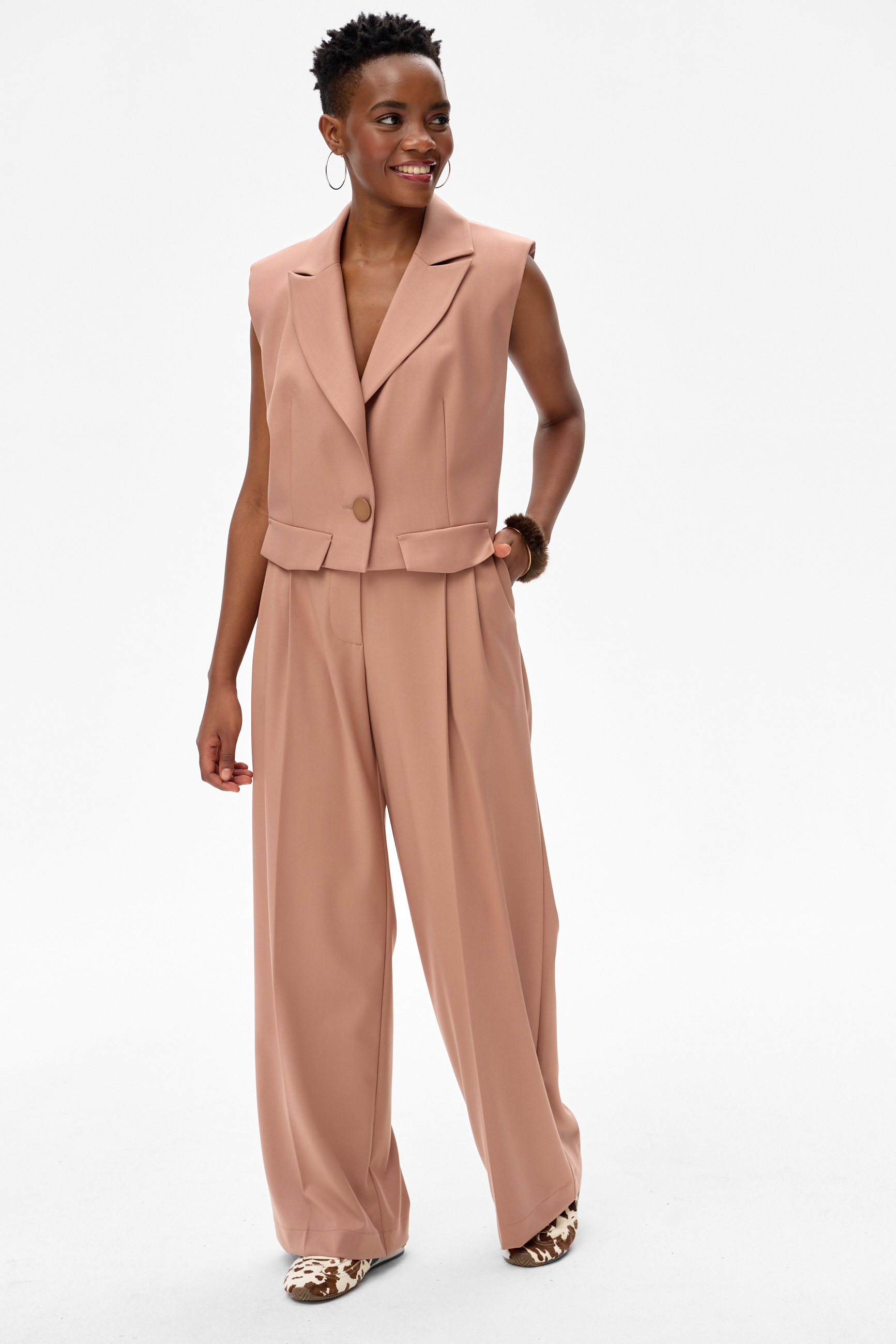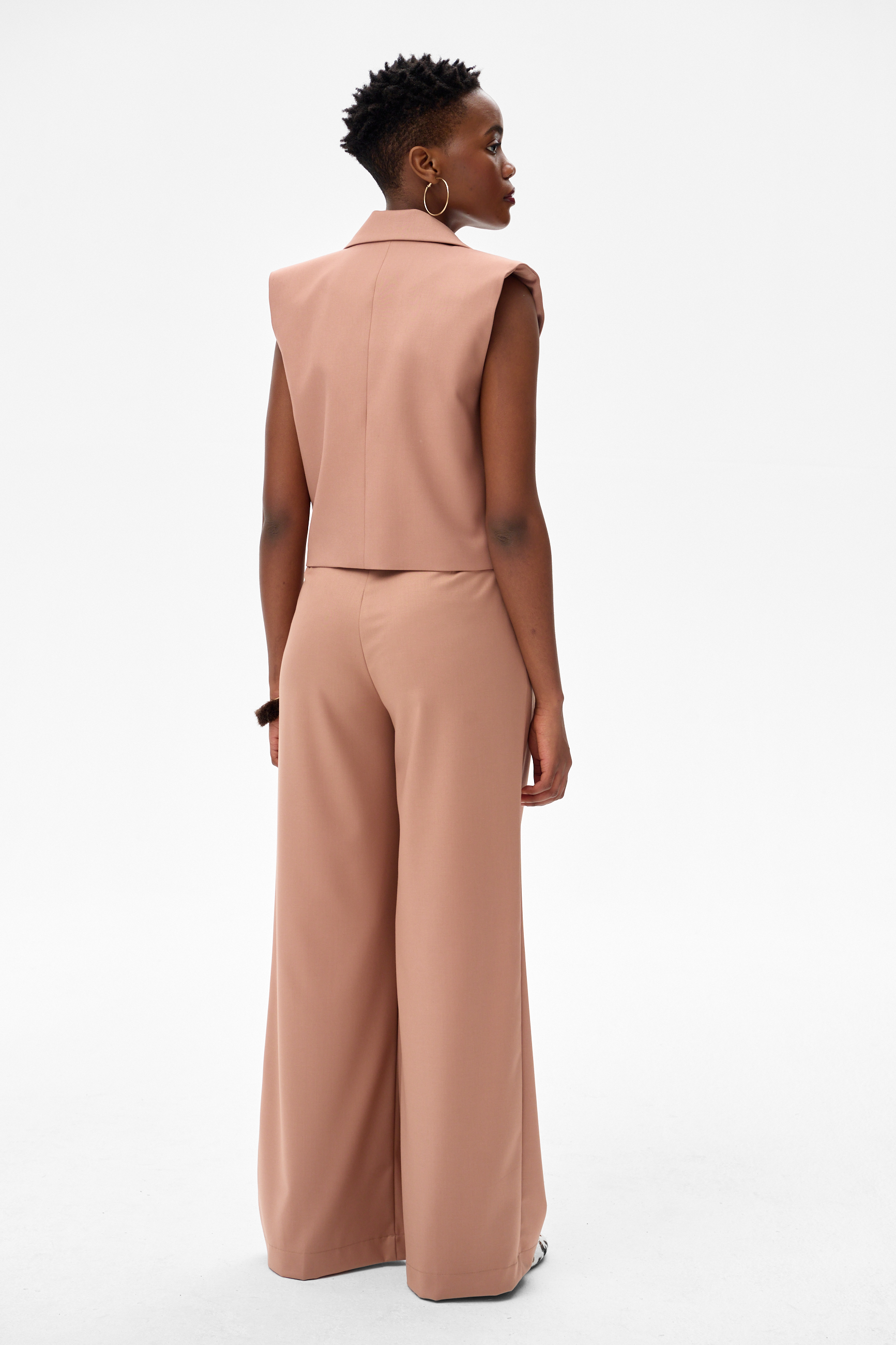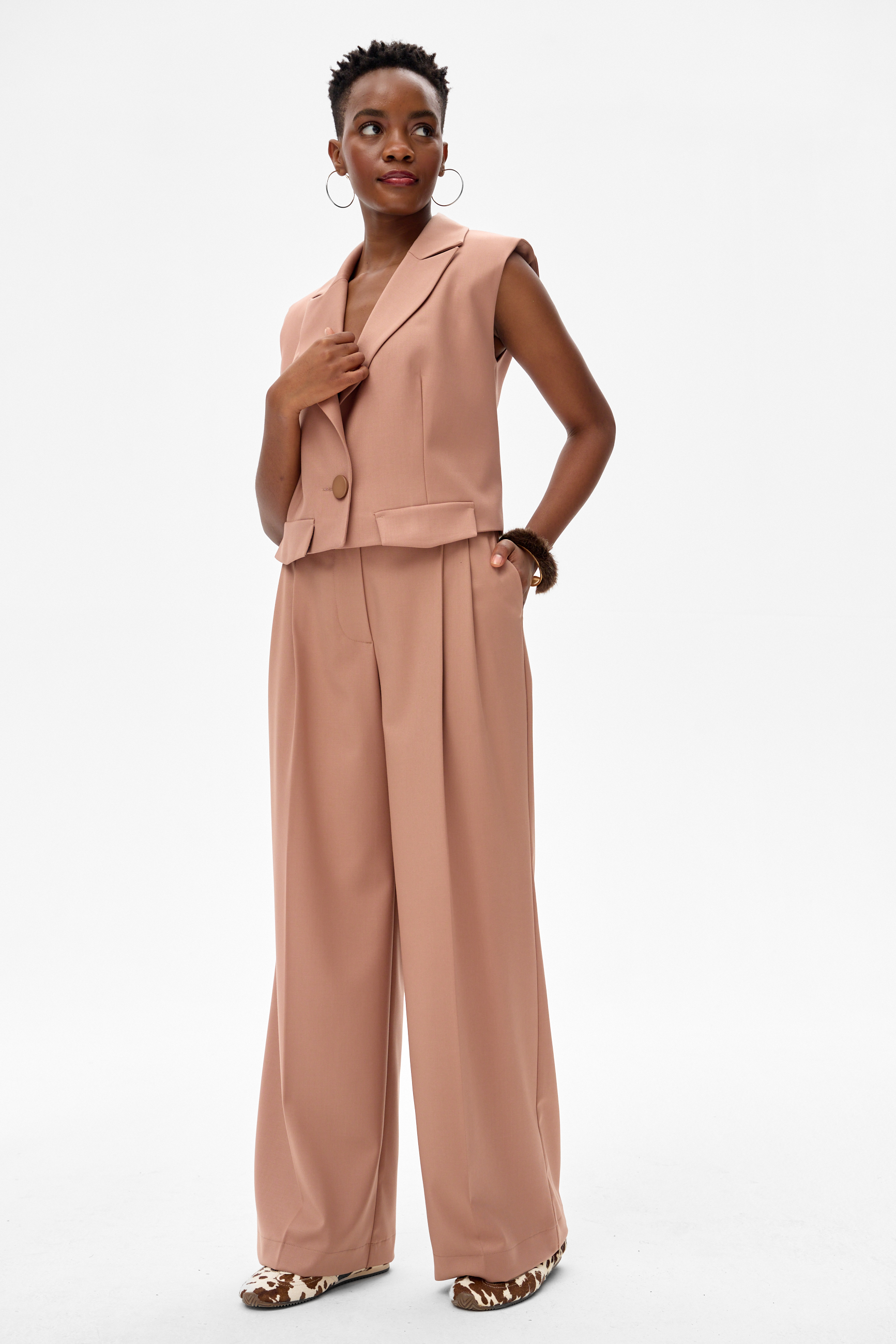 Nie przypominamy sobie, abyśmy widziały ostatnio wiele kompletów spodni z kamizelką zamiast marynarki, wykonanych z wiskozowej tkaniny garniturowej. A Ty? Z pewnością górne części takich kompletów nie mają też zazwyczaj tak ozdobnej, mieniącej się dwutonowej podszewki, którą - szczerze mówiąc - można by nosić na lewą stronę. Ale ponieważ w blue shadow często bazujemy na tradycji, zachowałyśmy kilka klasycznych elementów. Stylizowane fasonem na męskie garniturowe, spodnie z tego kompletu mają z przodu kontrafałdy, które dodają objętości nogawkom i wysmuklają sylwetkę. Jest też duży, okrągły, matowy guzik, którym nawiązujemy do minimalistycznego charakteru całości. Żaden garnitur nie może się też obyć bez kieszeni - w tym przypadku obniżyłyśmy ich patki na kamizelce i podszyłyśmy je od spodu podszewki. Więc gdyby garnitury zawsze projektowały kobiety, byłyby one na pewno bardziej nowatorskie i stylowe. Prawda?