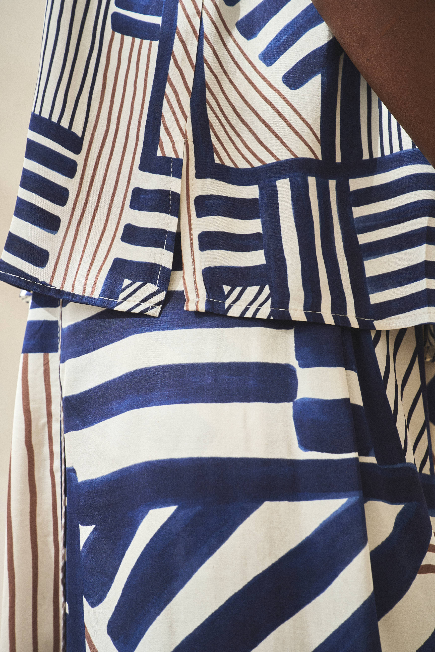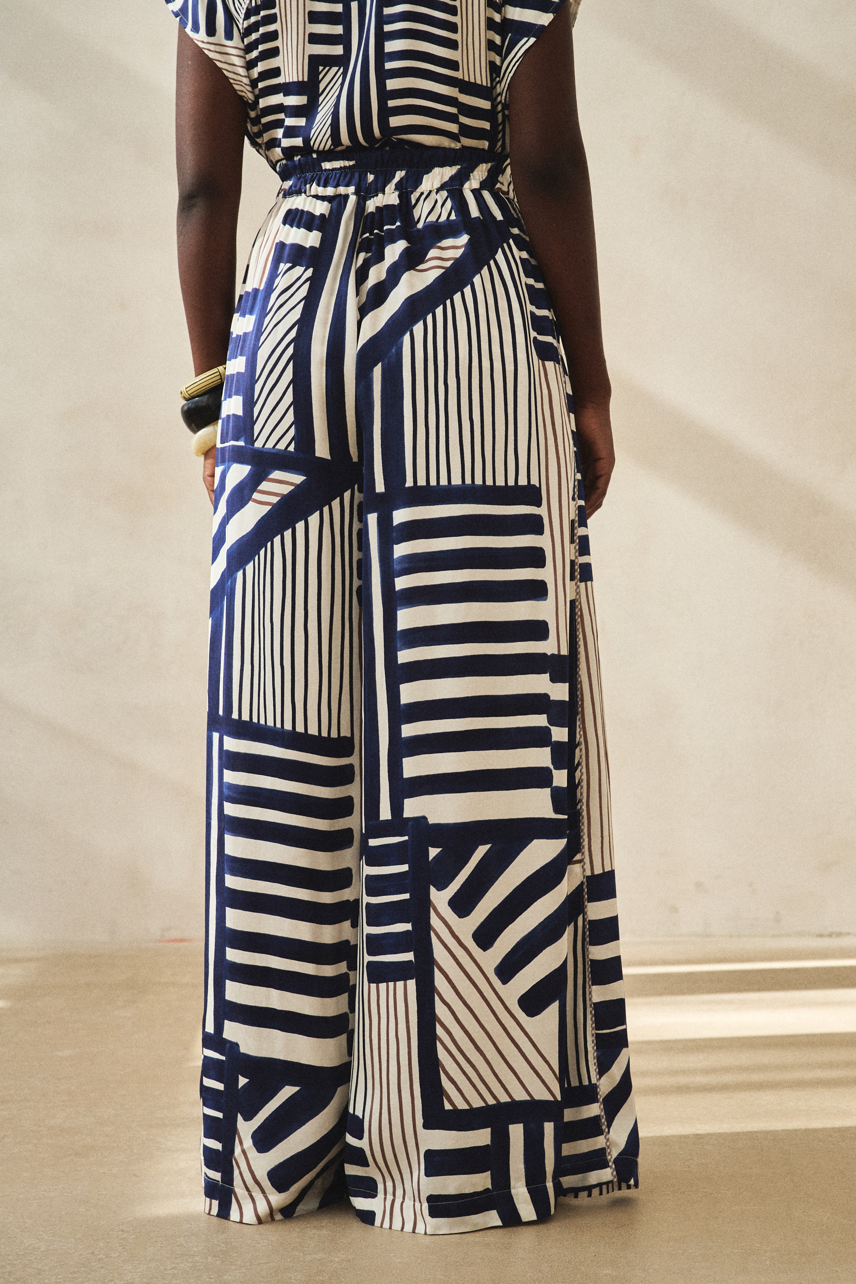 Nie jest tajemnicą, że w naszych projektach lubimy czasem łączyć z pozoru wykluczające się elementy. Tutaj, na przykład, stawiamy na malarski dialog pionowych, poziomych i skośnych linii i pasków w wiskozowym komplecie z delikatnym połyskiem. Na pierwszy rzut oka wydawać się to może chaosem, ale wszystko jest tu dokładnie przemyślane. Wiskozowa bluzka koszulowa z guziczkami z masy kokosowej ma ozdobną stójkę z tkaniny bawełnianej w prążek – ten patchwork reprezentuje naszą filozofię zero waste. Ozdobne wypustki w linii cięcia karczka z przodu i z tyłu to kolejny element dekoracyjny. A boczne rozcięcia to z kolei praktyczne rozwiązanie, aby bluzkę było łatwiej dopasować do sylwetki. Podobnie jest też ze spódnico-spodniami na gumie (dla wygody), z ozdobną beżową kratką w bocznym szwie (dla ozdoby) i głęboką zakładką z przodu (dla wysmuklenia). Dużo się tu dzieje. I dla stonowania tego efektu, nazwałyśmy ten komplet przekornie – SOFTLY.