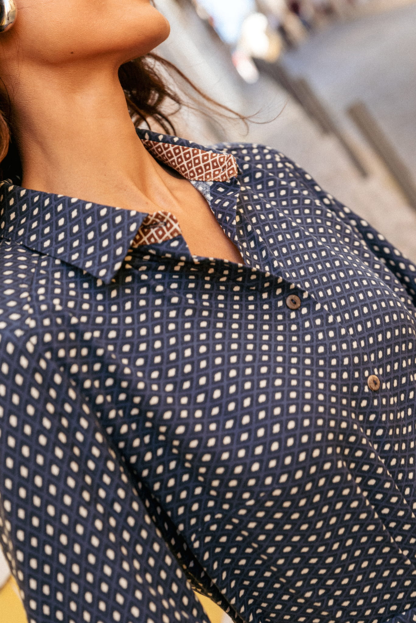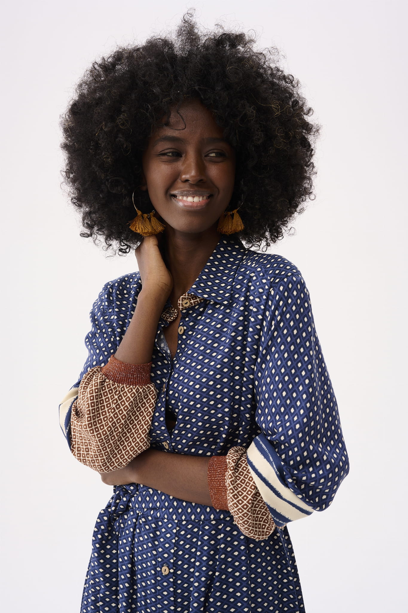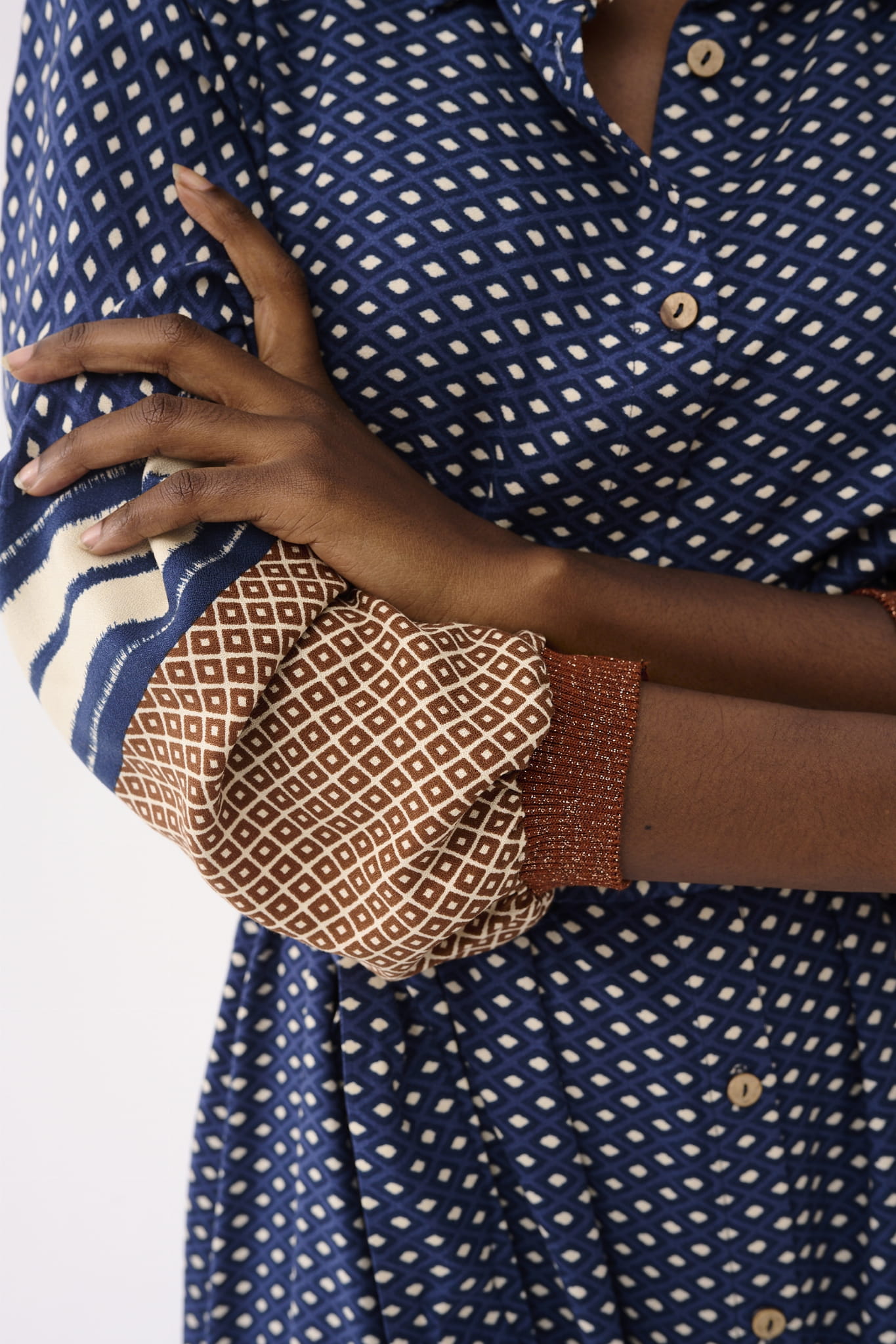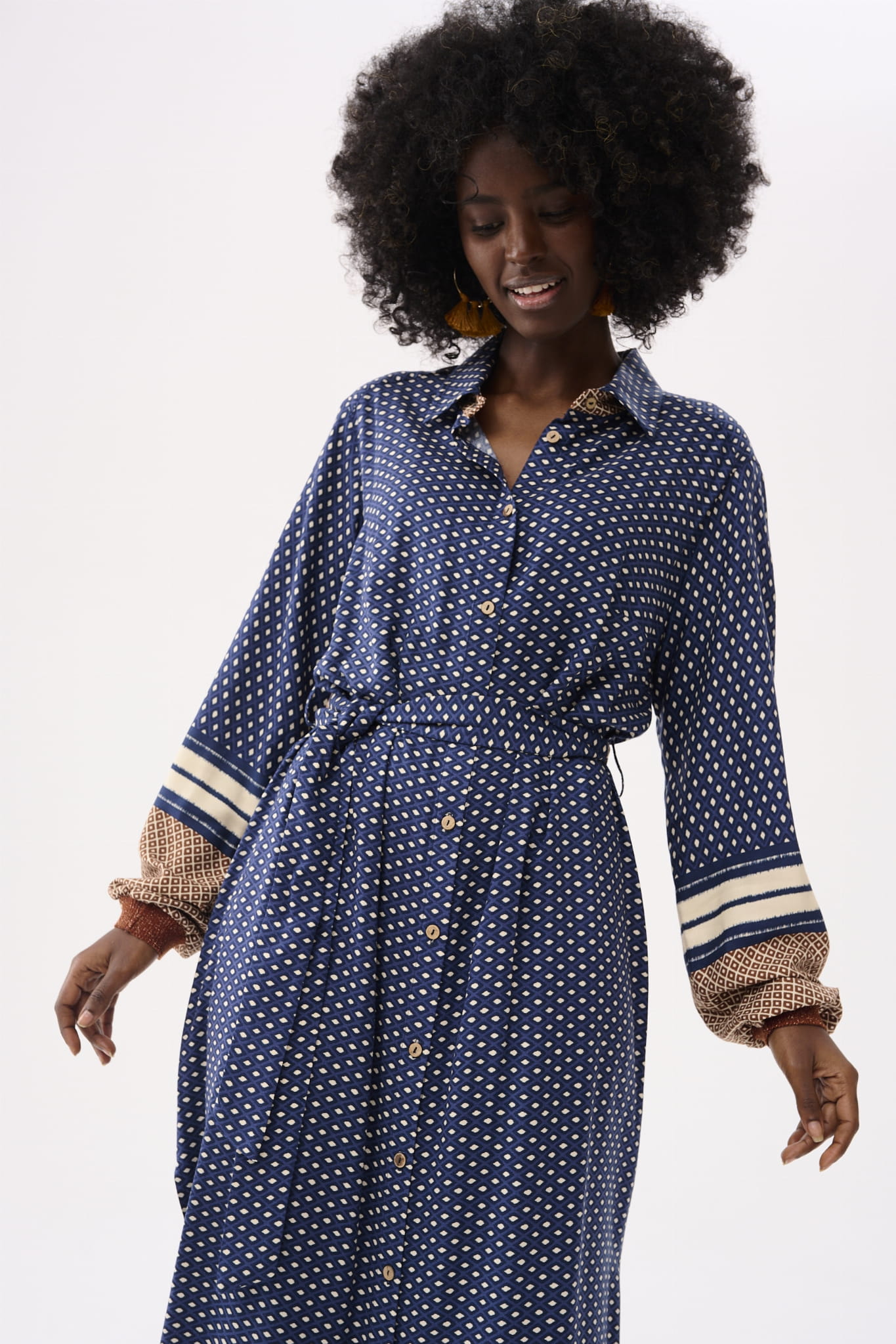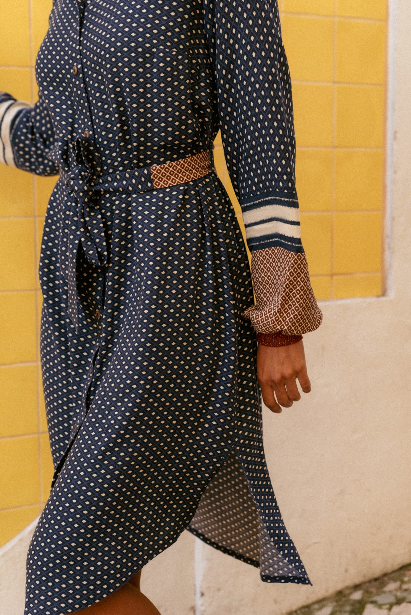Tak – czasami inspiracja męską koszulą może doprowadzić do powstania takiej oryginalnej sukienki. Cały jej zamysł oparty jest na wykorzystaniu różnych kierunków krojenia materiału z borderowym wzorem. Umieściłyśmy ten ozdobny element w różnych częściach: w rękawach, wewnątrz stójki kołnierza oraz na tyle dołączonego do NIRBATI paska. Cała sukienka zapina się też na nasze ulubione guziki-kokoski.