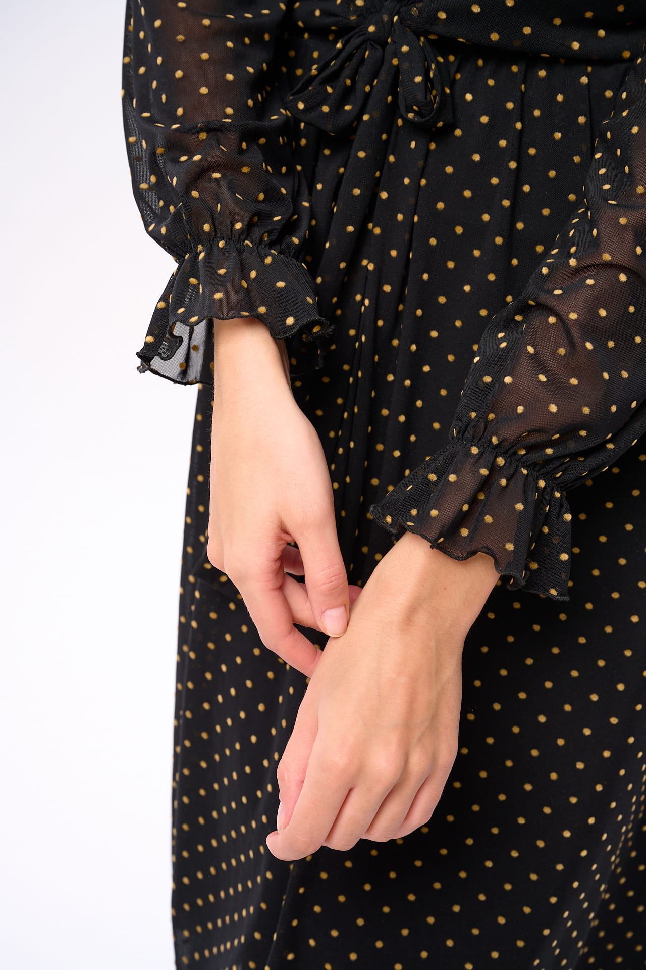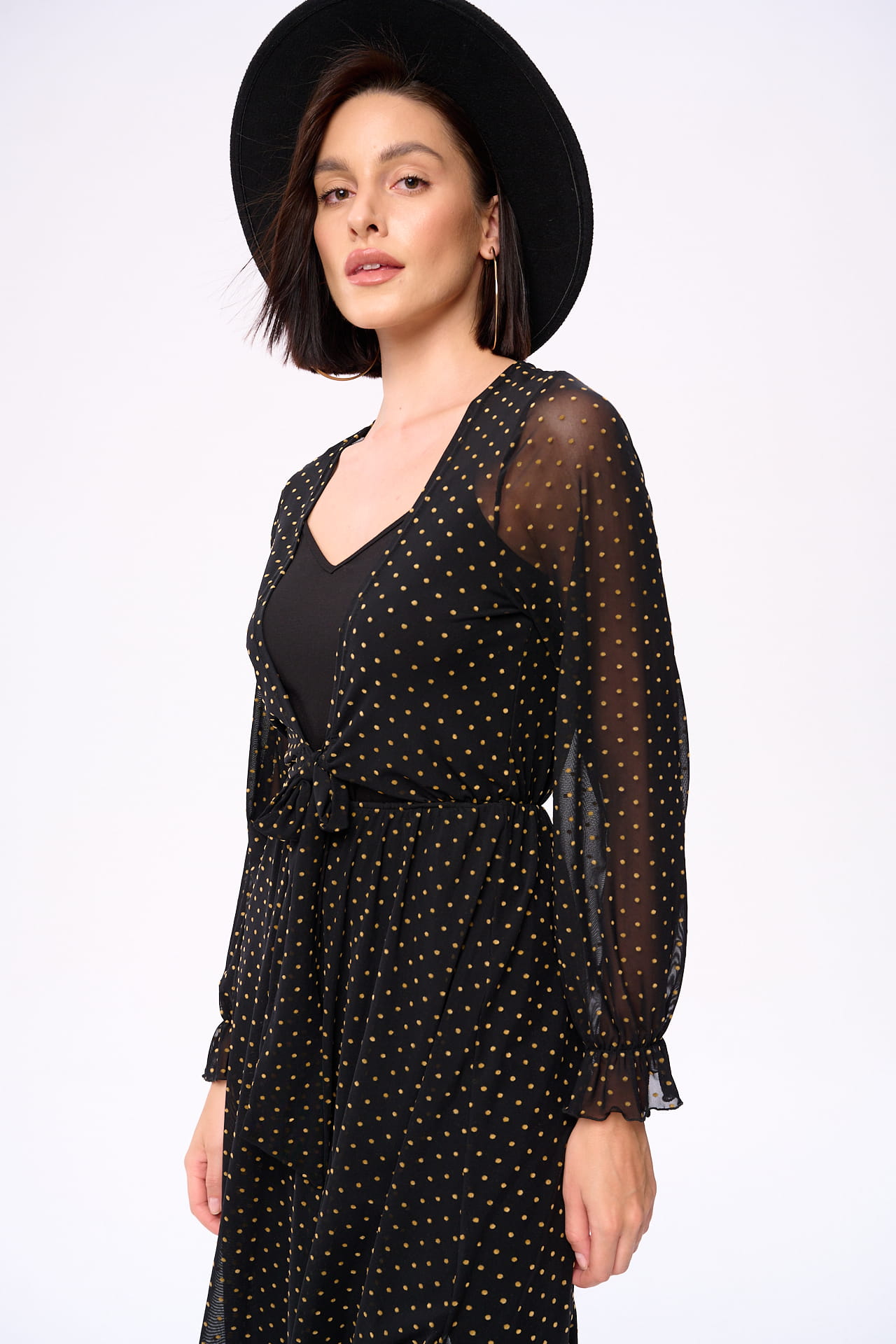 otwarty, elastyczny dekolt zawiązać z przodu. A w inny dzień możesz wiązanie przenieść na tył. A w weekend możesz zaryzykować noszenie jej tył na przód. W każdym przypadku będzie widać te urocze groszki w kolorze beżowo-musztardowym. Także szalej do woli!