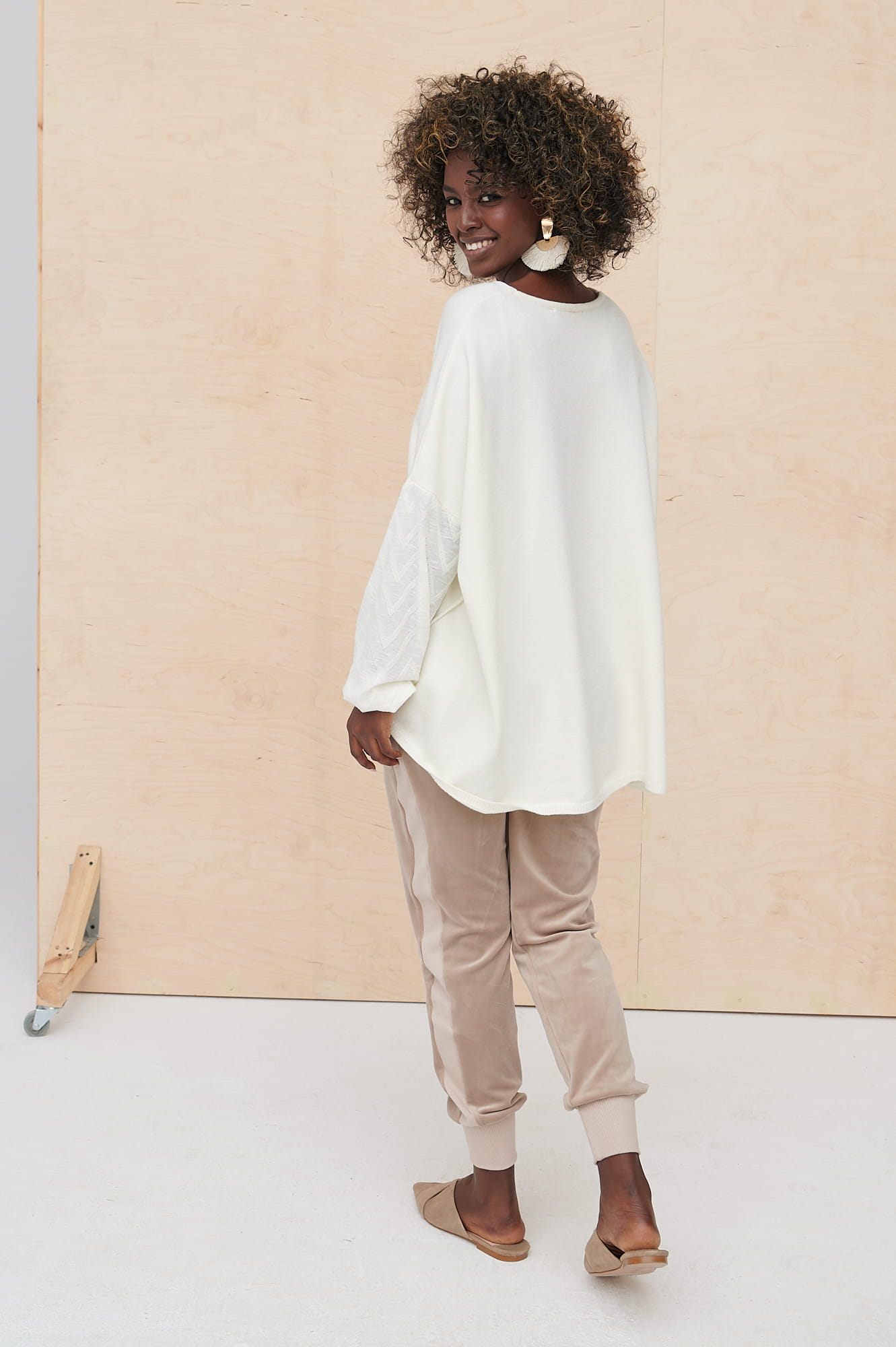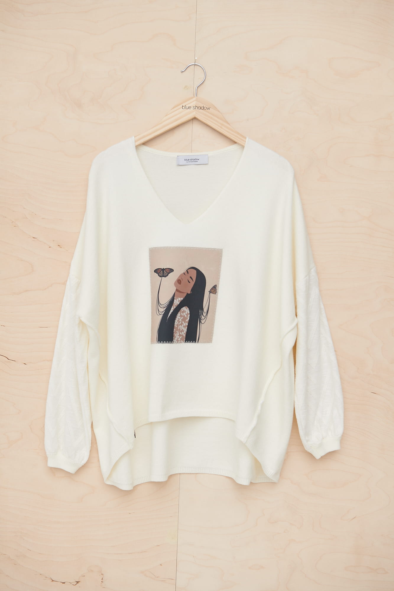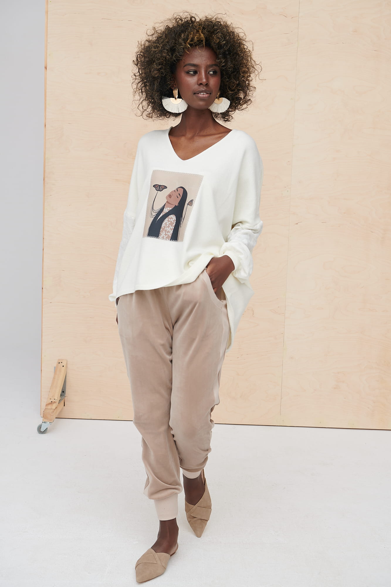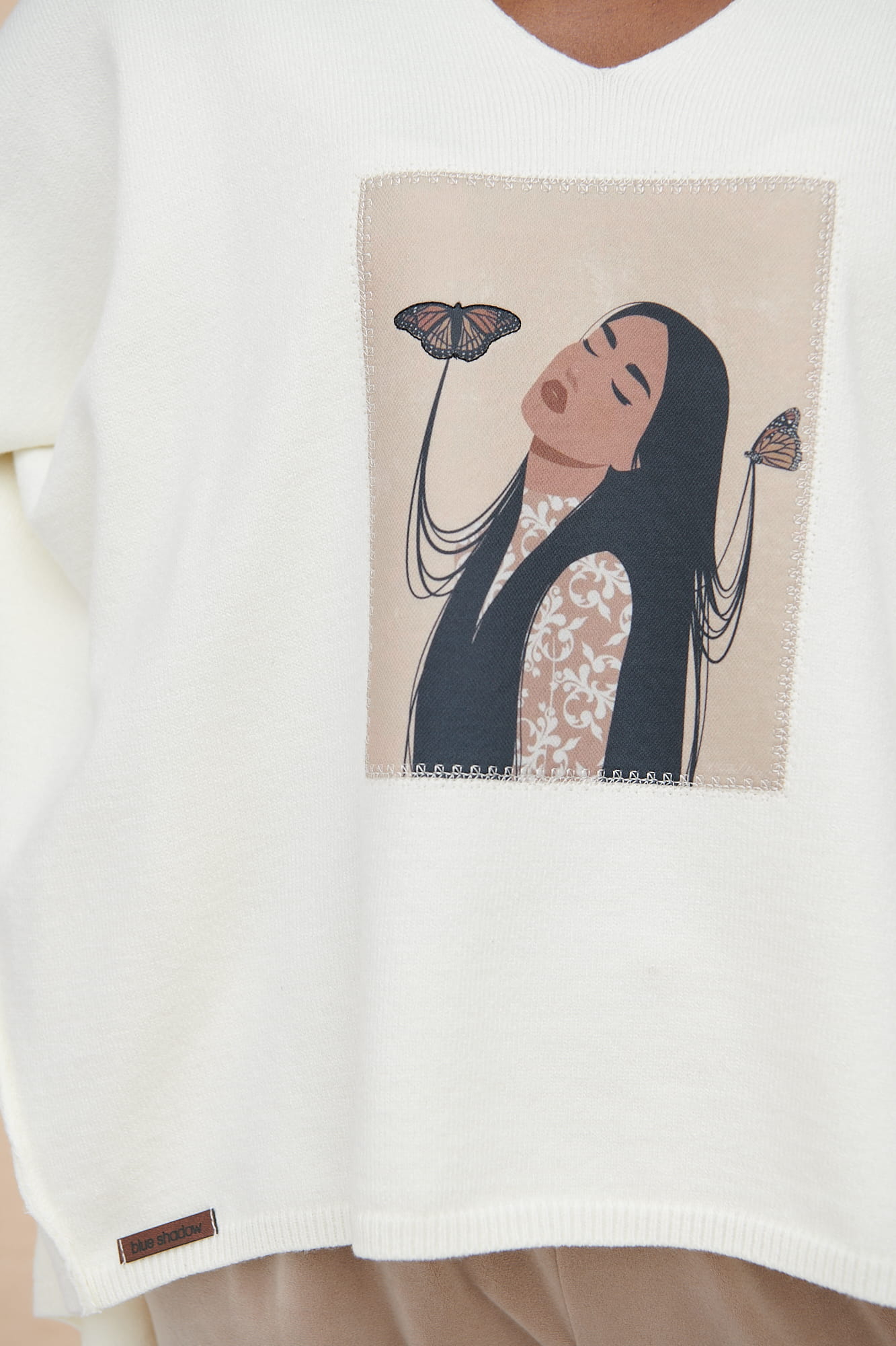 Mamy takie postanowienie noworoczne, żeby poszukać w życiu więcej równowagi. Stąd nasz sweter i aplikacja z twarzą Pocahontas, z której bije spokój. Ten balans widać też w projekcie bluzki. Jest dekolt w serek, opadające ramię i rękawki na ściągaczu do dowolnej regulacji. A sama aplikacja to zrównoważone połączenie technik sublimacji i haftu.