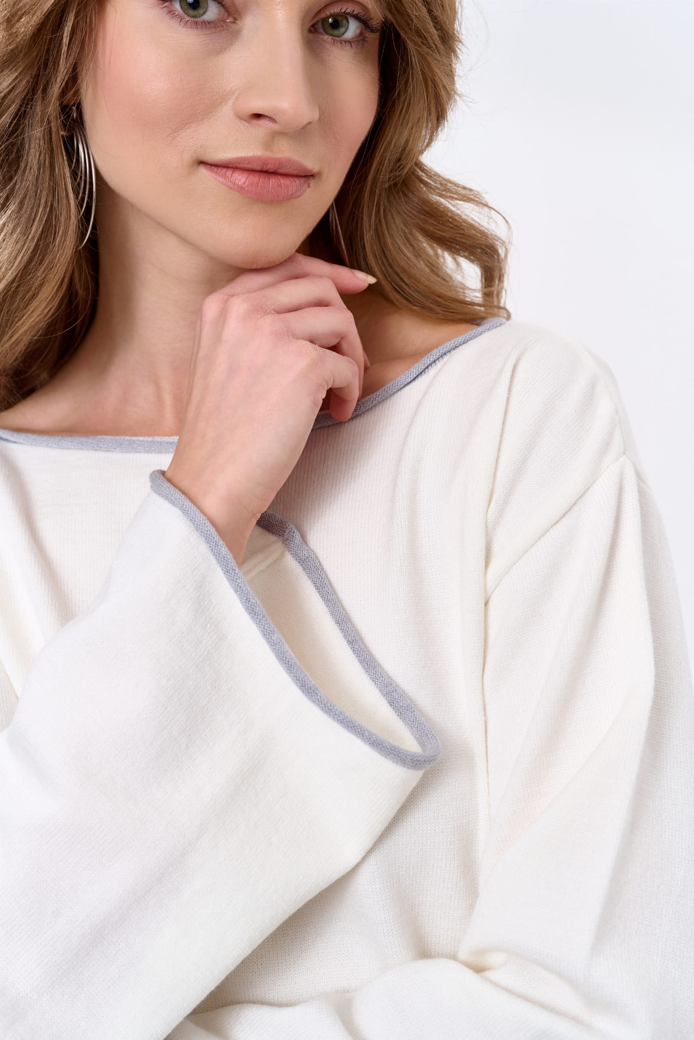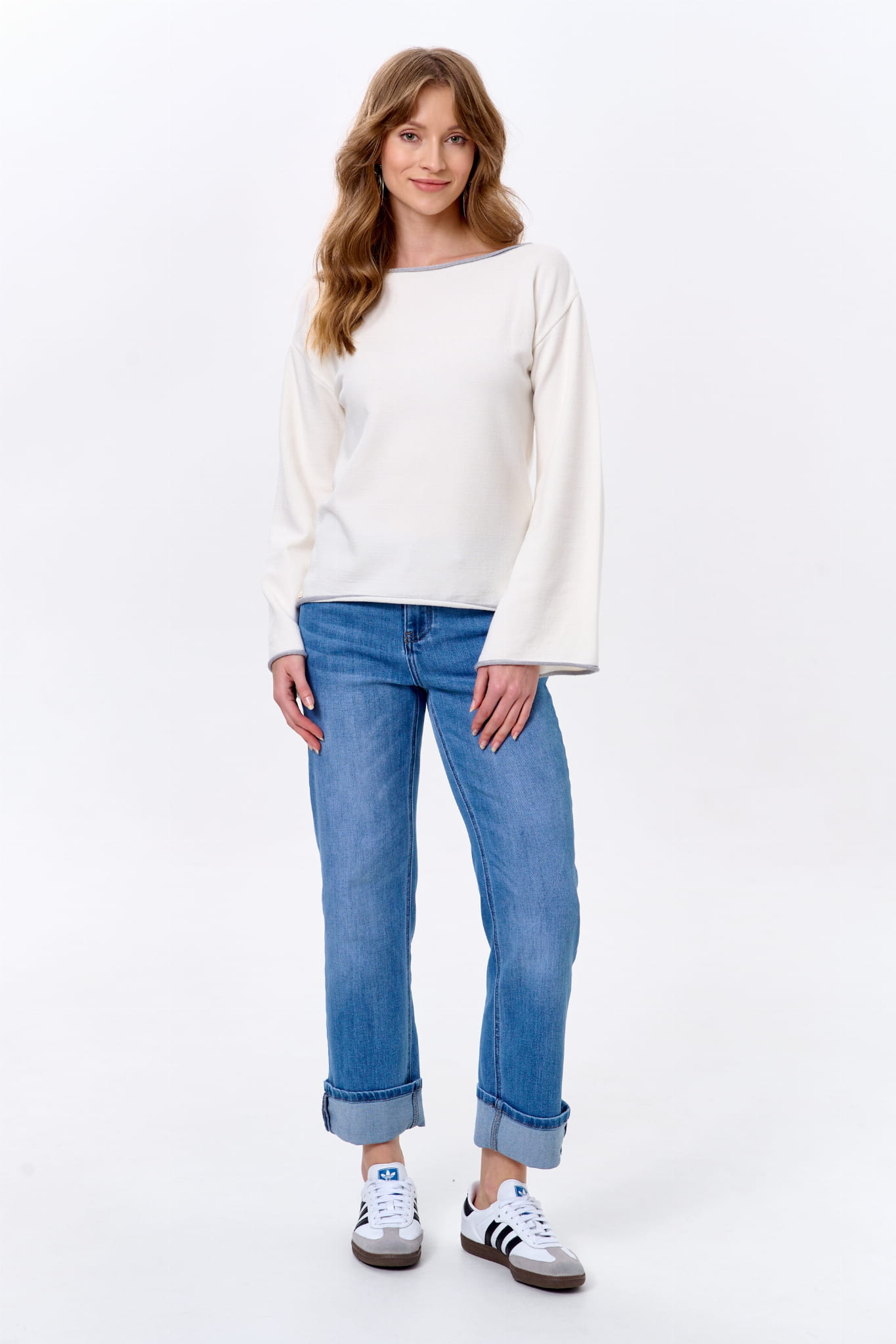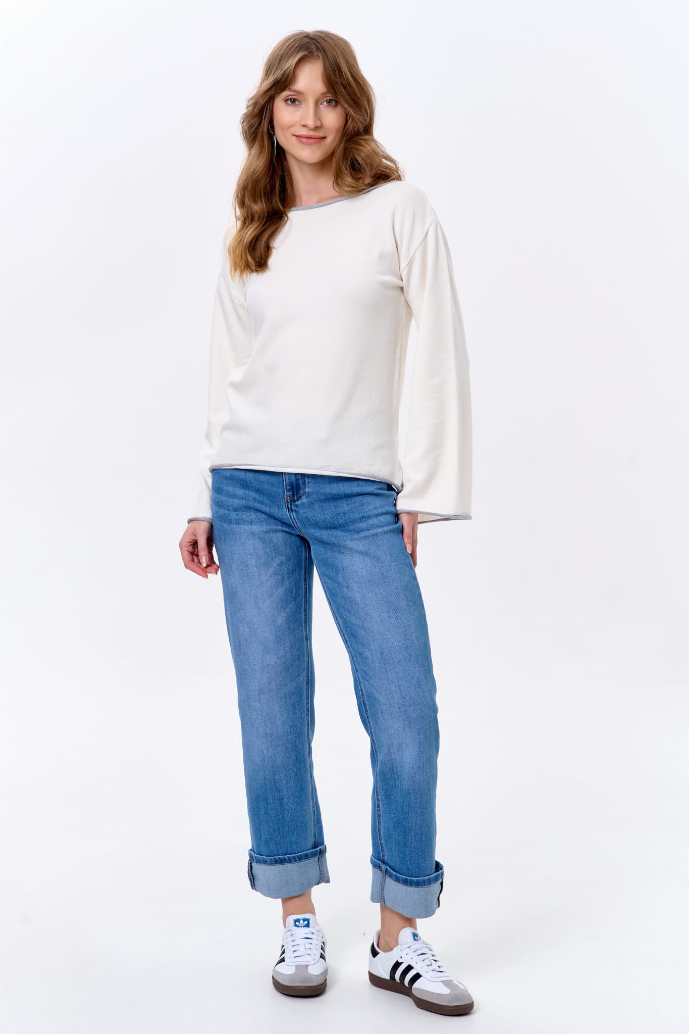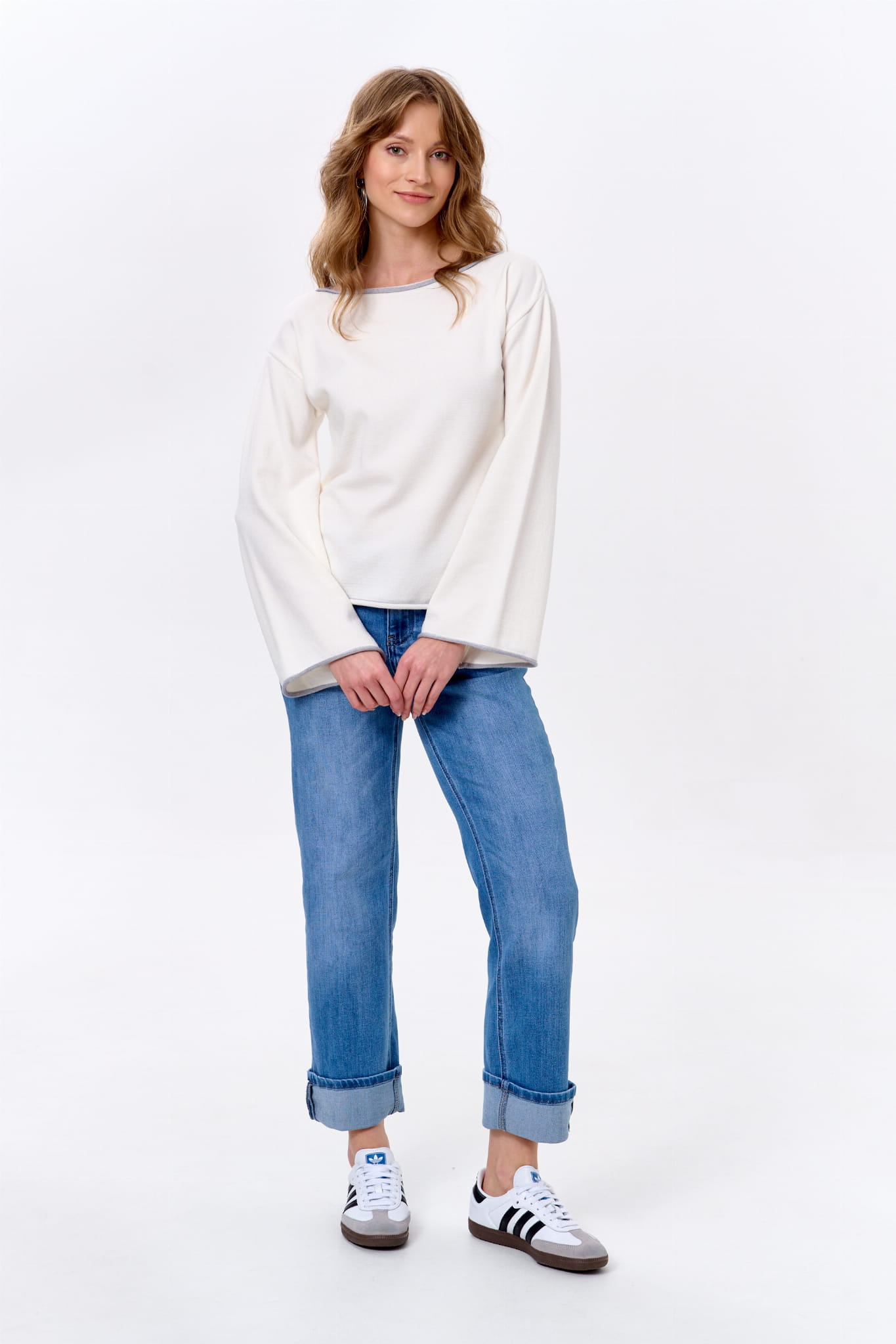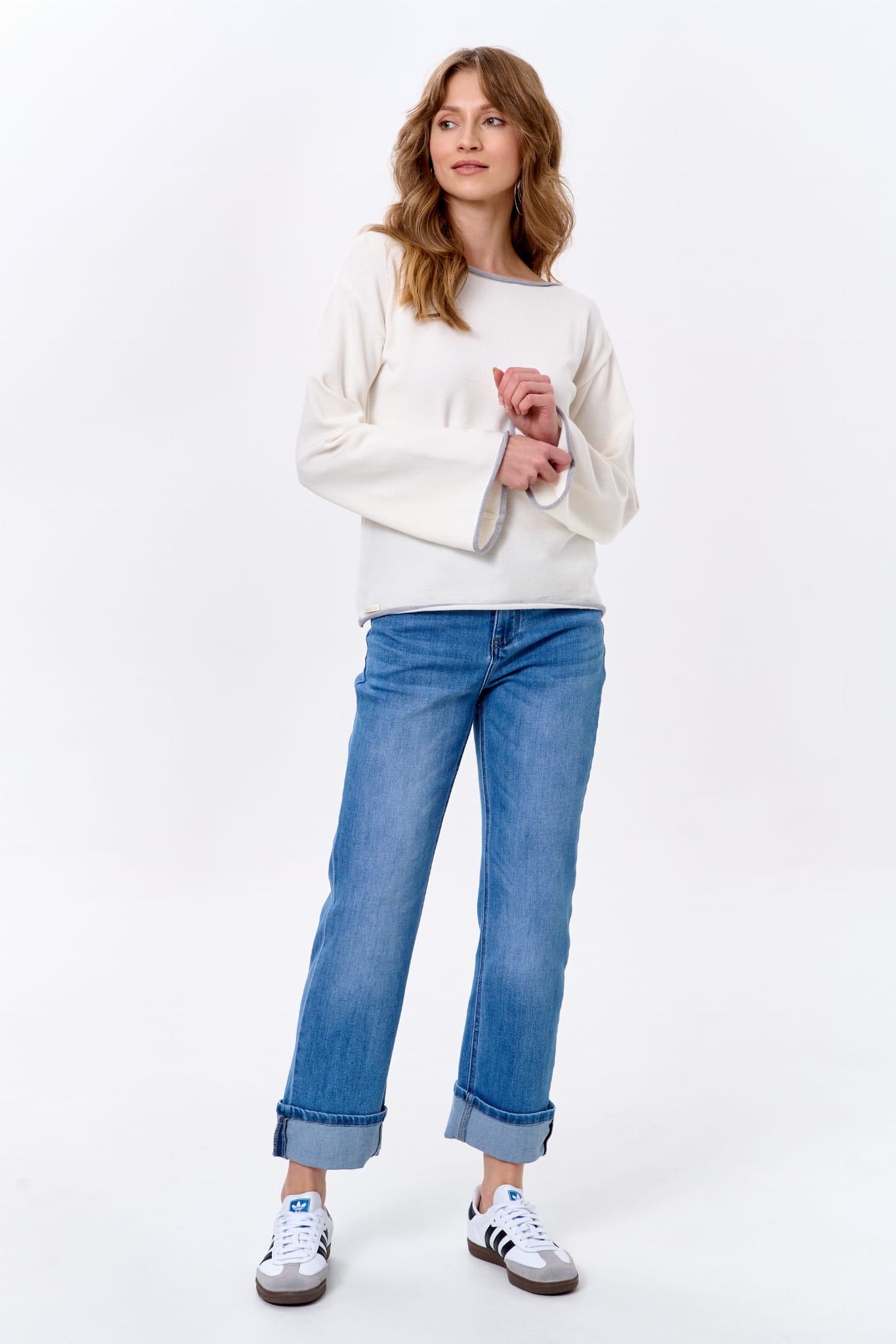 małego akcentu. A są to kontrastowe w kolorze ruloniki, które wykańczają rękawy, łódkowy