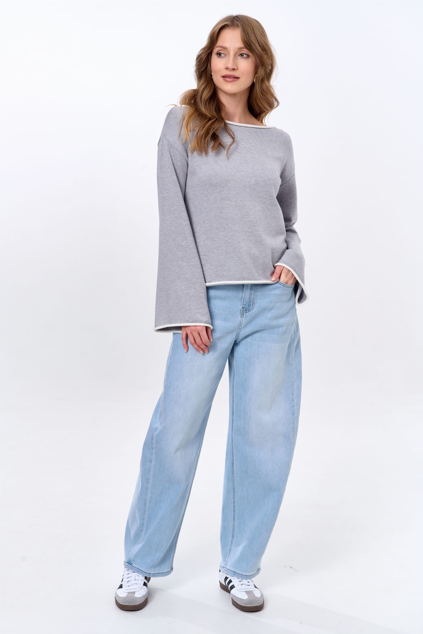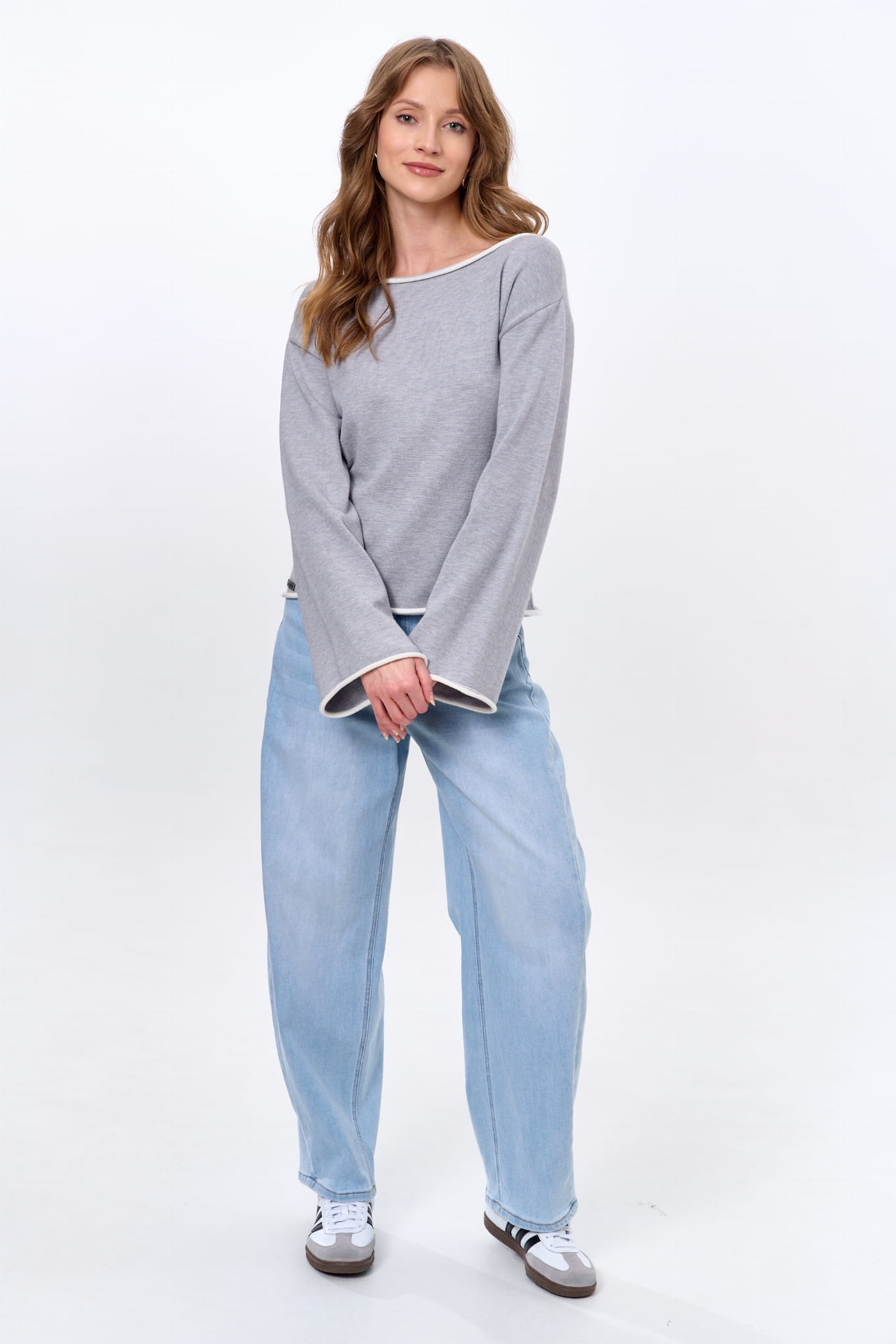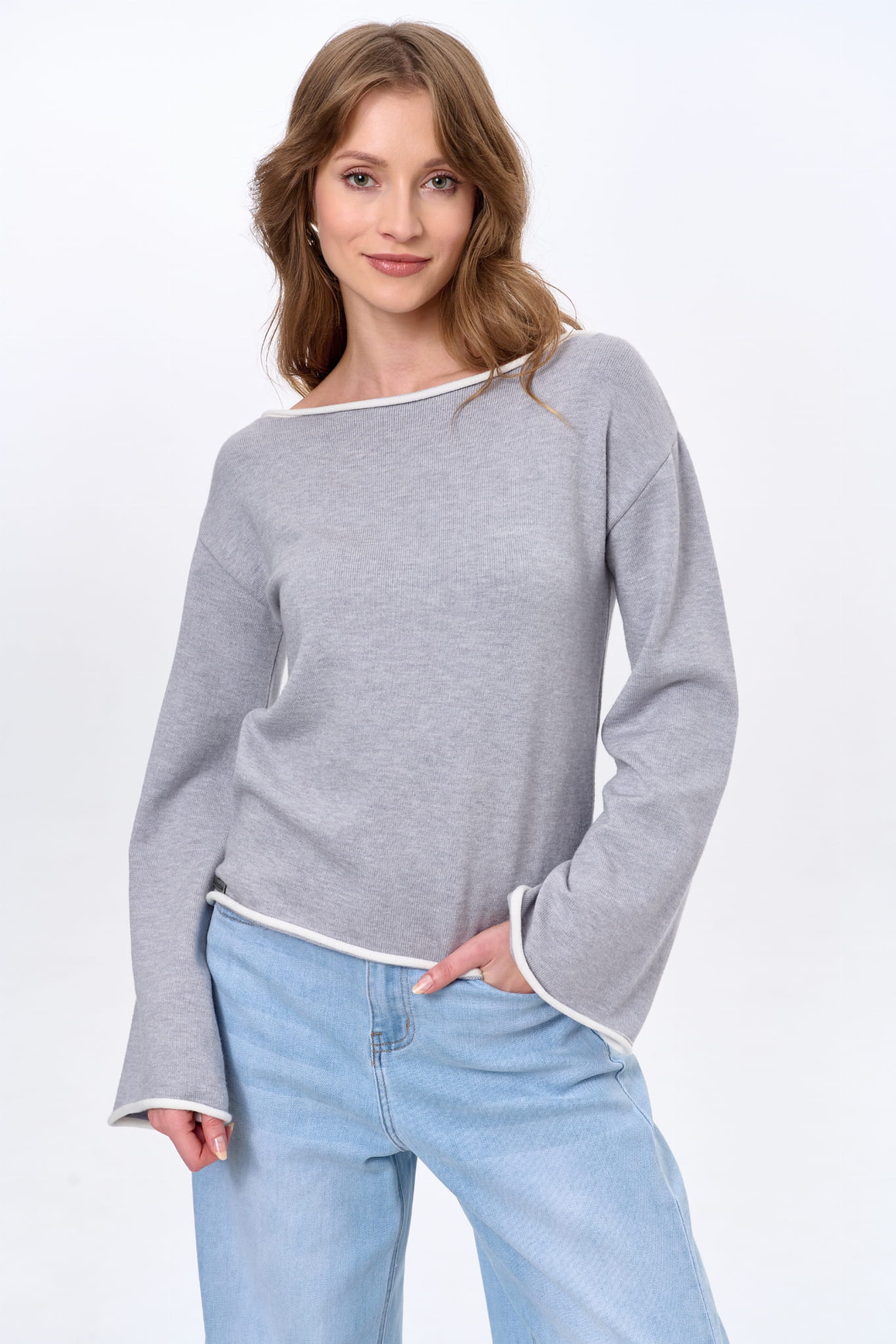 małego akcentu. A są to kontrastowe w kolorze ruloniki, które wykańczają rękawy, łódkowy