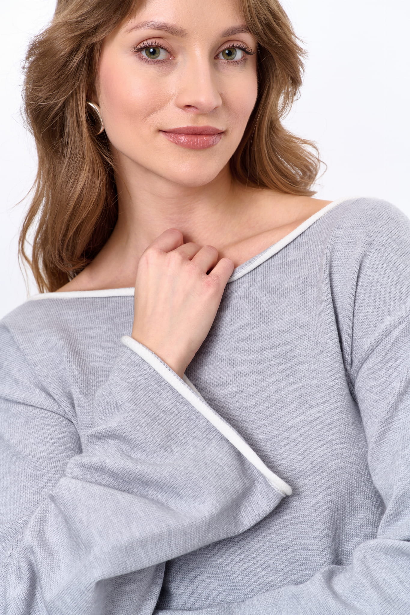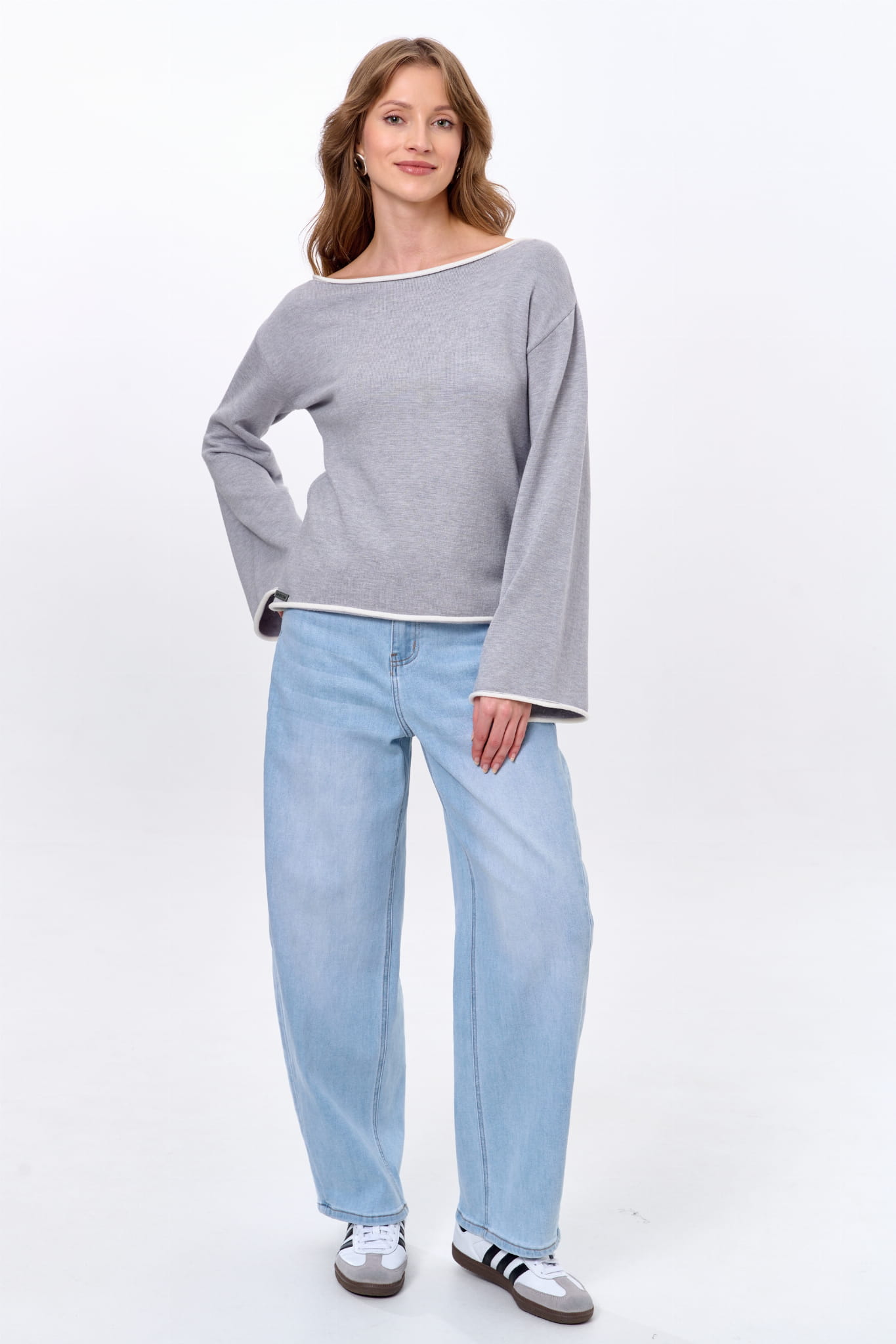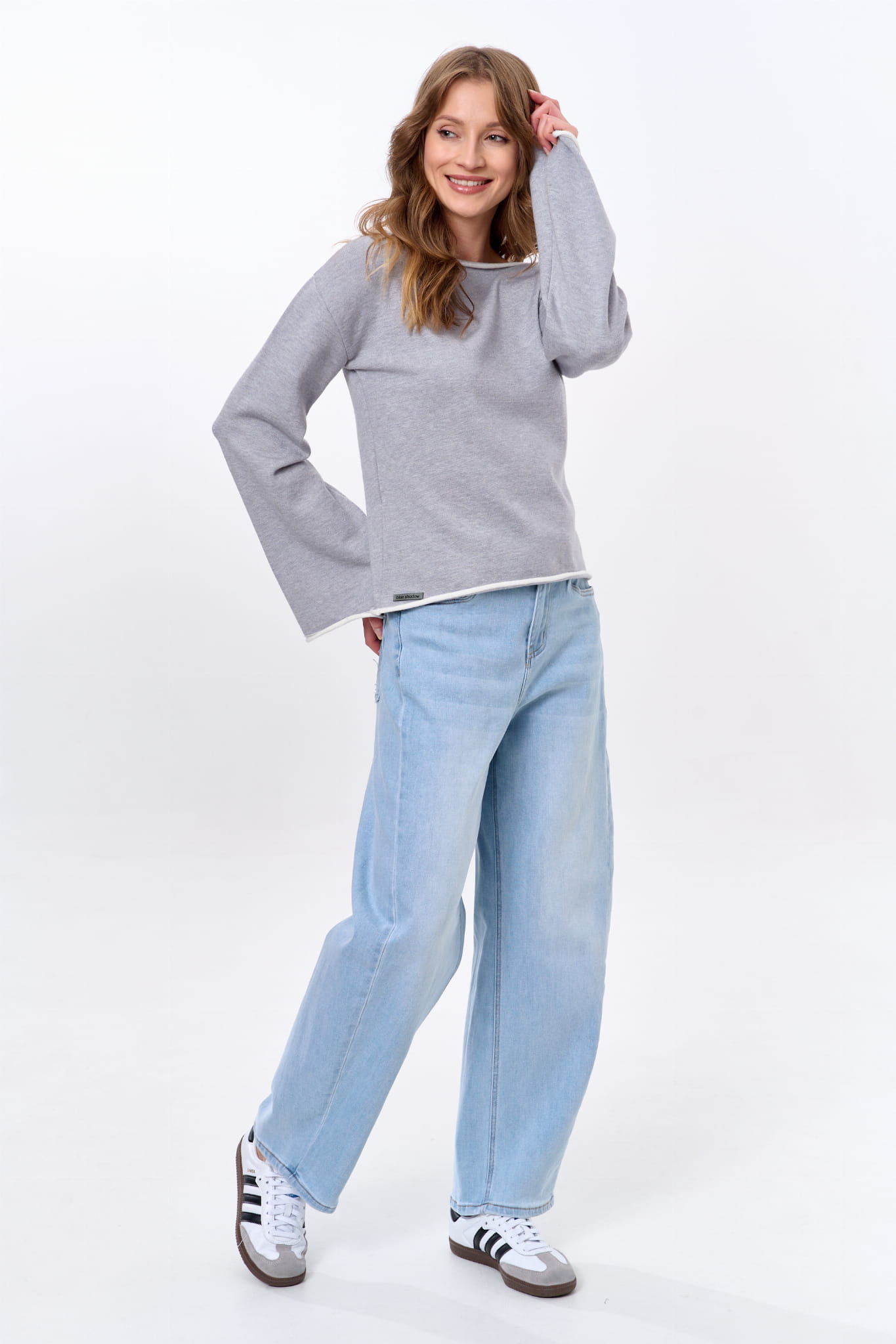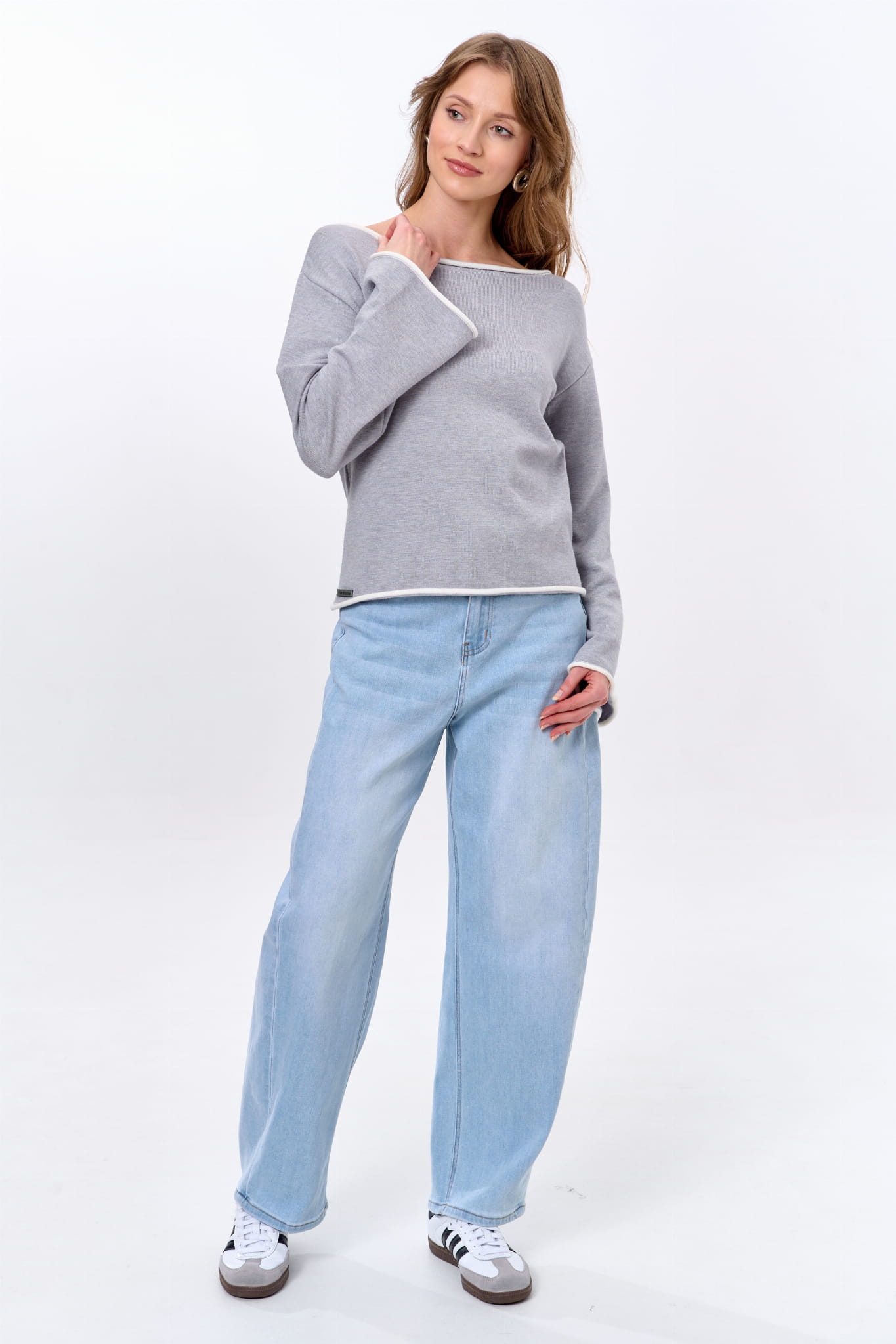 małego akcentu. A są to kontrastowe w kolorze ruloniki, które wykańczają rękawy, łódkowy