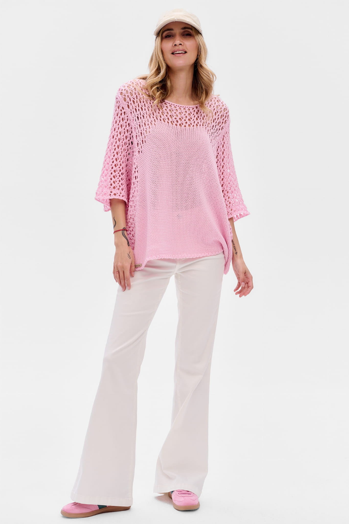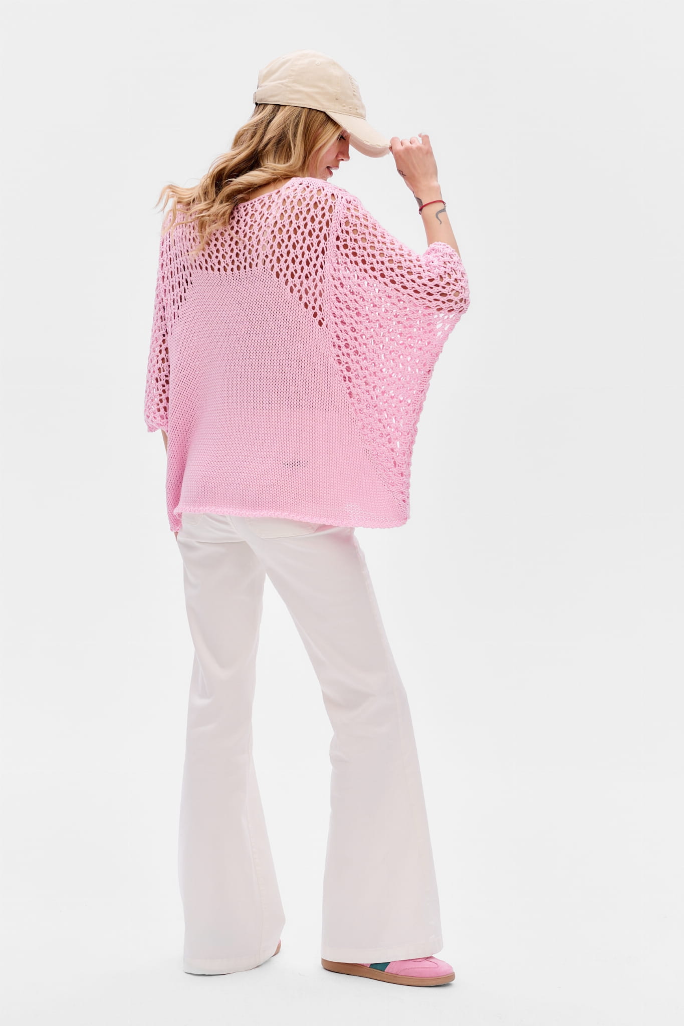 Bardzo lubimy projektować takie agelessowe, kimonowe modele. Szczególnie że ten pasuje na wiele sylwetek. Niweluje też idealnie niedoskonałości sylwetki, bo jest luźny i sięga za pupę. Ażurowy splot znajdziesz na rękawach, po bokach oraz w dekolcie z przodu i tyłu. No i ten uniwersalny kolor… Czyż można chcieć więcej na wiosnę?